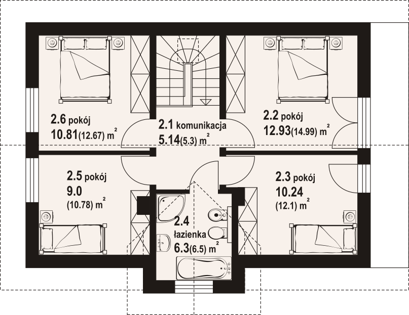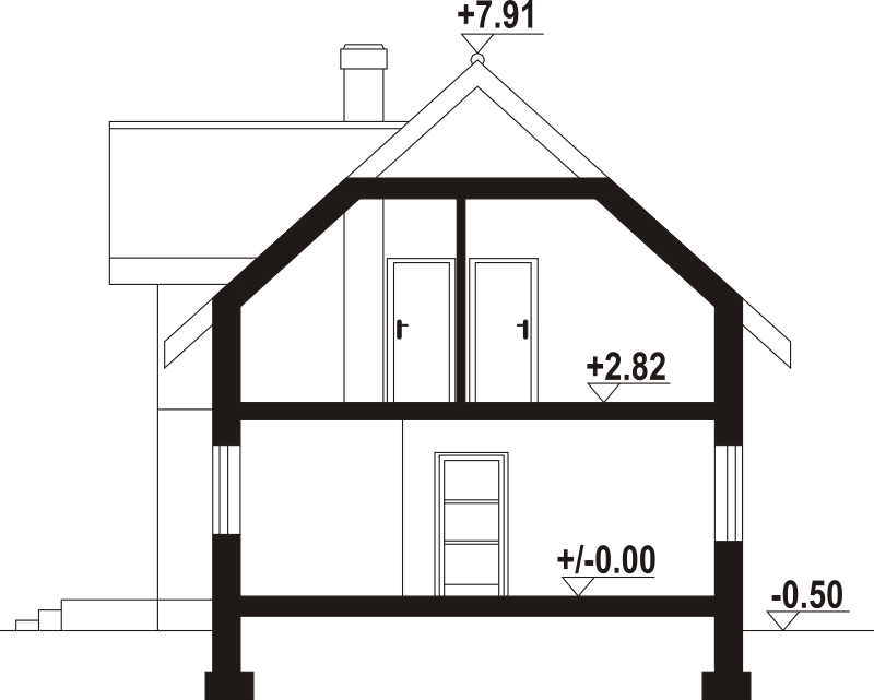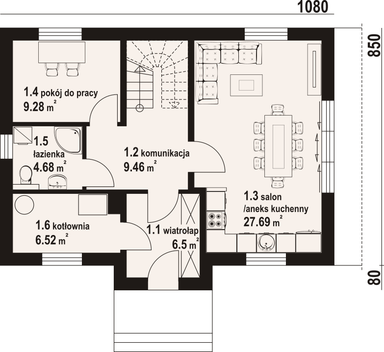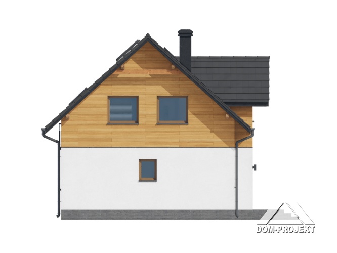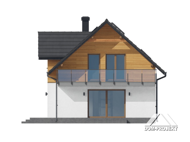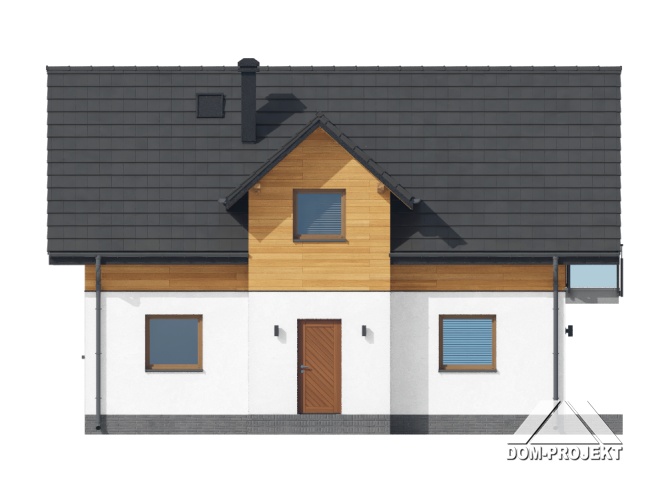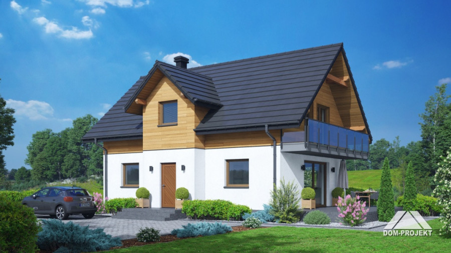 Dom z poddaszem użytkowym. Na parterze salon z aneksem kuchennym oraz wyjściem na taras. Pokój do pracy, łazienka, kotłownia, komunikacja, wiatrołap. Na poddaszu cztery pokoje, komunikacja, łazienka oraz balkon dostępny z dwóch pokoi. Zwarta bryła budynku oraz dach dwuspadowy sprzyjają szybkiej i taniej budowie oraz niskim kosztom eksploatacji.