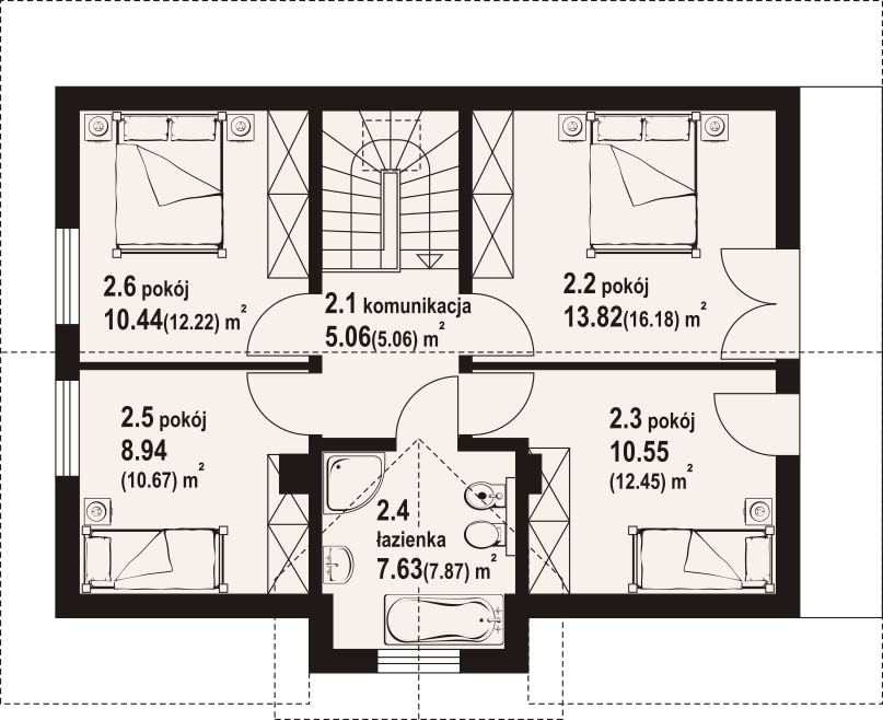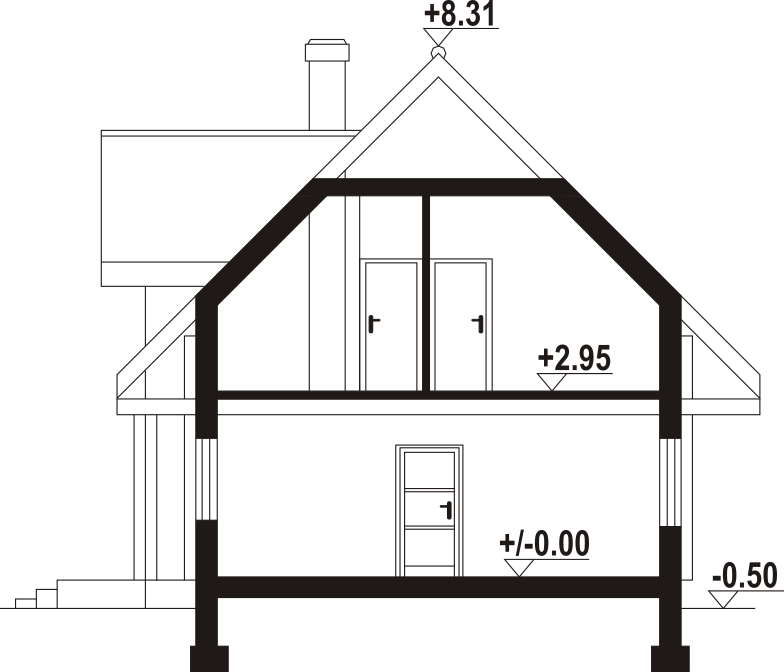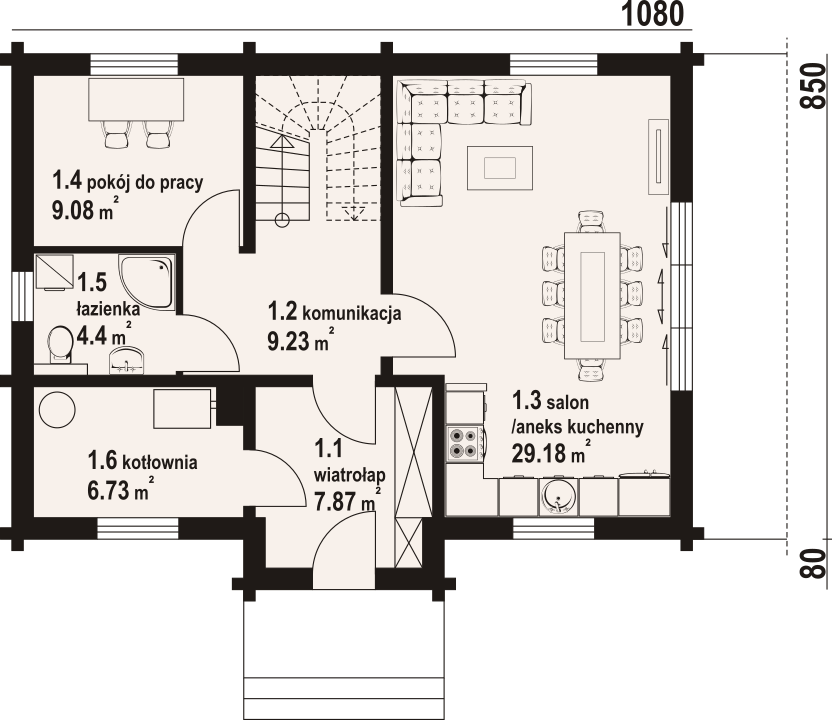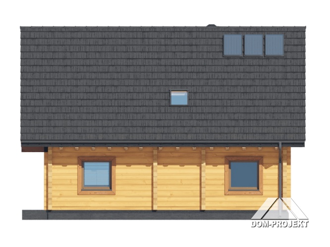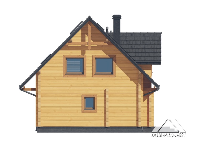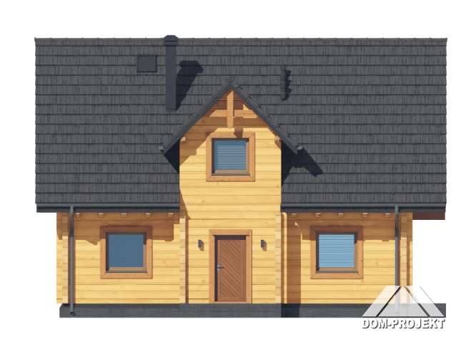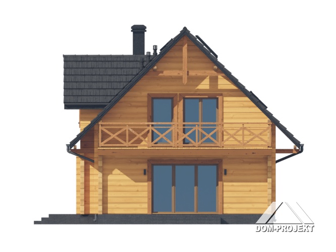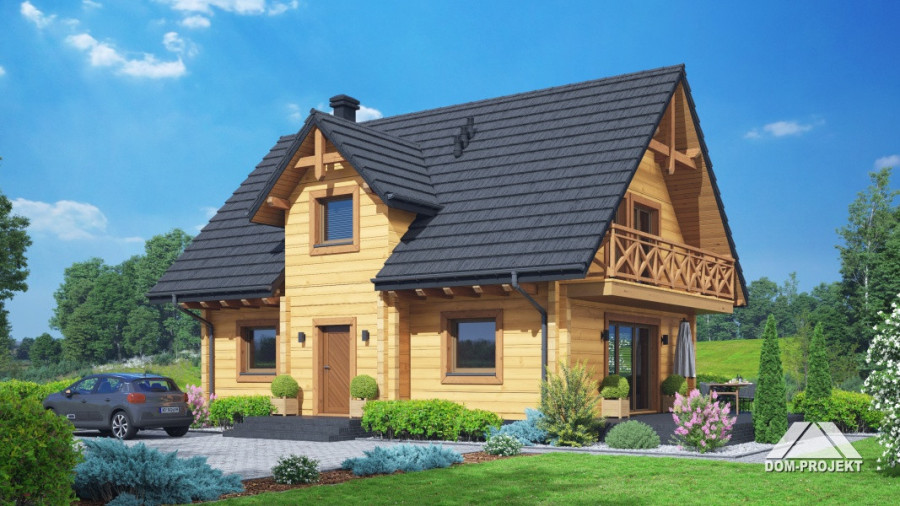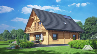 Dom z bali. Na parterze salon z aneksem kuchennym oraz wyjściem na taras. Pokój do pracy, łazienka, komunikacja, kotłownia, wiatrołap. Na poddaszu cztery pokoje, łazienka, komunikacja oraz balkon dostępny z dwóch pokoi. Zwarta bryła budynku oraz dach dwuspadowy sprzyjają szybkiej i taniej budowie oraz niskim kosztom eksploatacji.