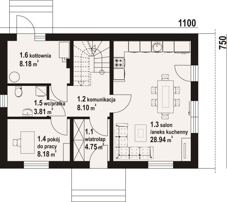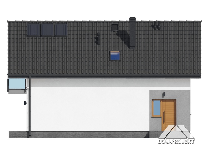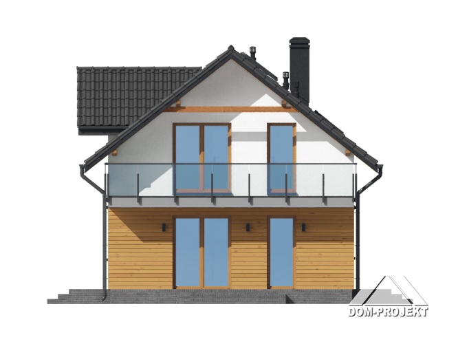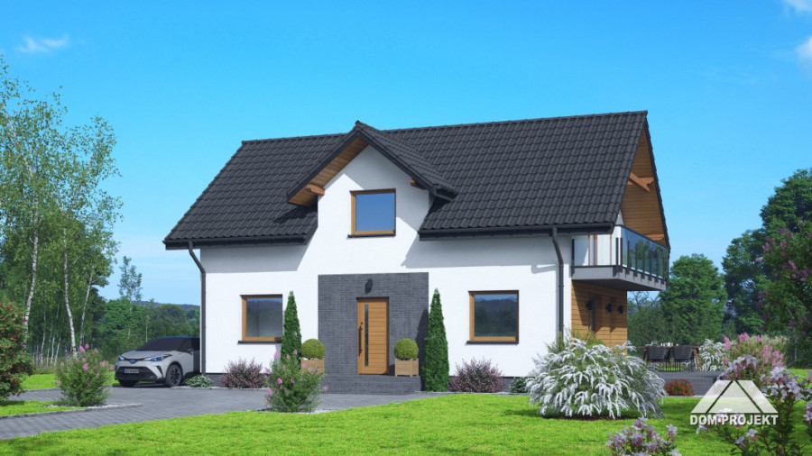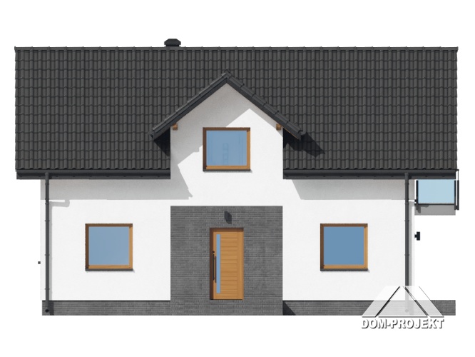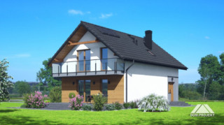Dom z poddaszem użytkowym. Na parterze salon z aneksem kuchennym oraz wyjściem na taras. Pokój do pracy, wc z pralką, kotłownia, komunikacja, wiatrołap. Na poddaszu cztery pokoje, łazienka, komunikacja oraz balkon dostępny z dwóch pokoi. Zwarta bryła budynku oraz dach dwuspadowy sprzyjają szybkiej i taniej budowie oraz niskim kosztom eksploatacji.