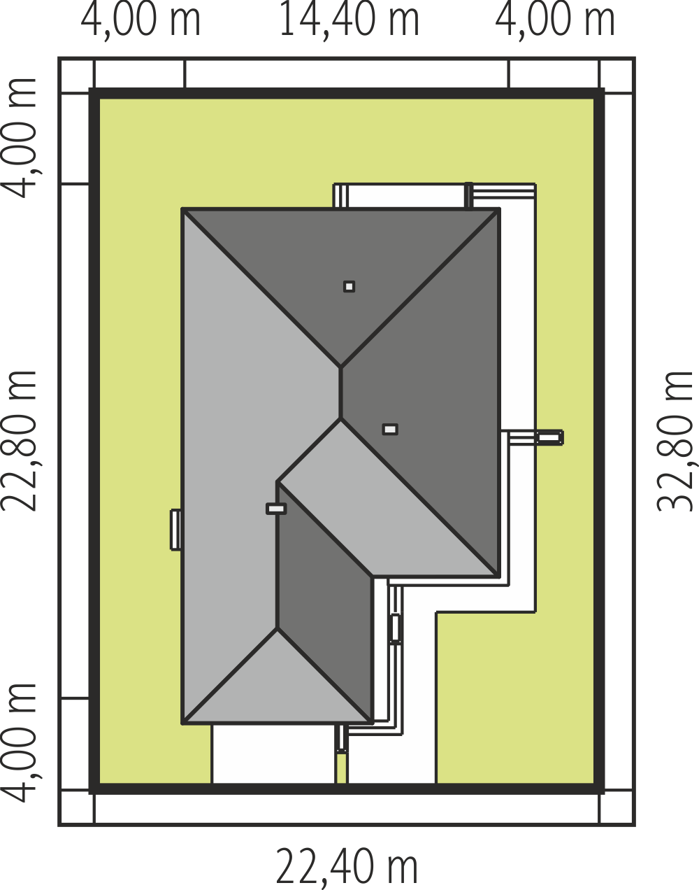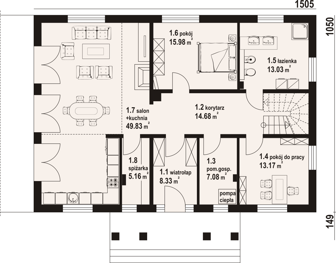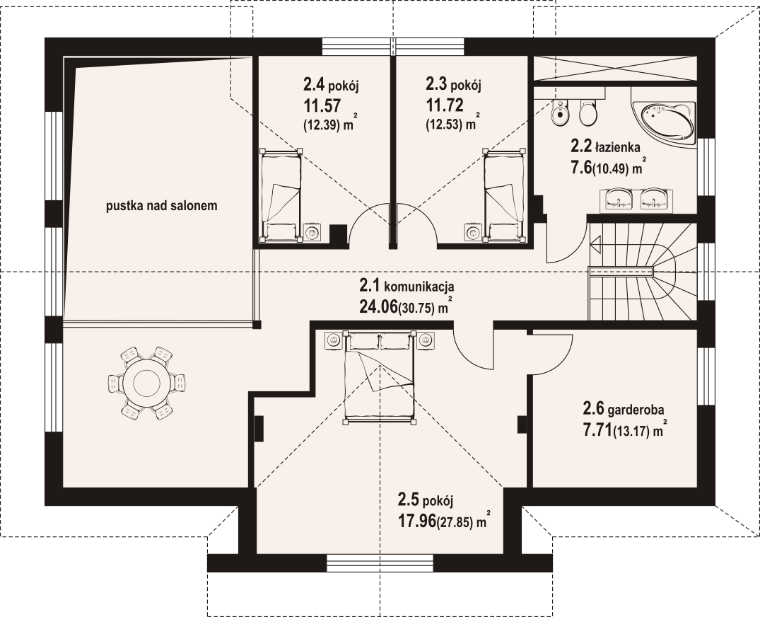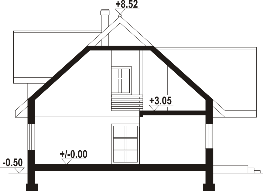 Dom z poddaszem użytkowym. Na parterze salon z kuchnią, kominkiem, wyjściem na taras. Dwa pokoje, łazienka, korytarz, pomieszczenie gospodarcze, wiatrołap, spiżarka. Na poddaszu trzy pokoje, garderoba, łazienka, komunikacja, antresola nad salonem. Zwarta bryła budynku oraz dach dwuspadowy sprzyjają szybkiej i taniej budowie oraz niskim kosztom eksploatacji.