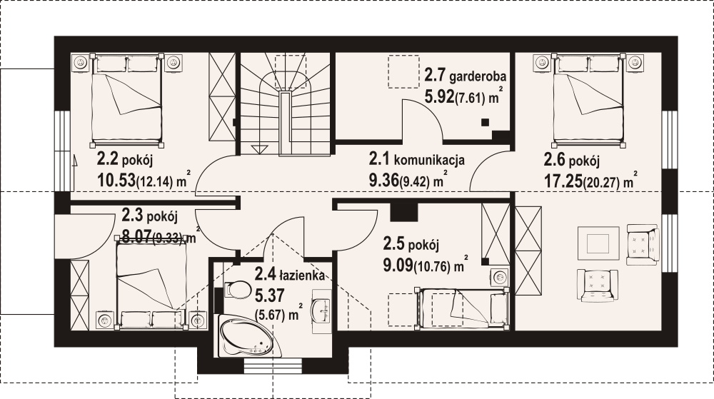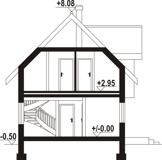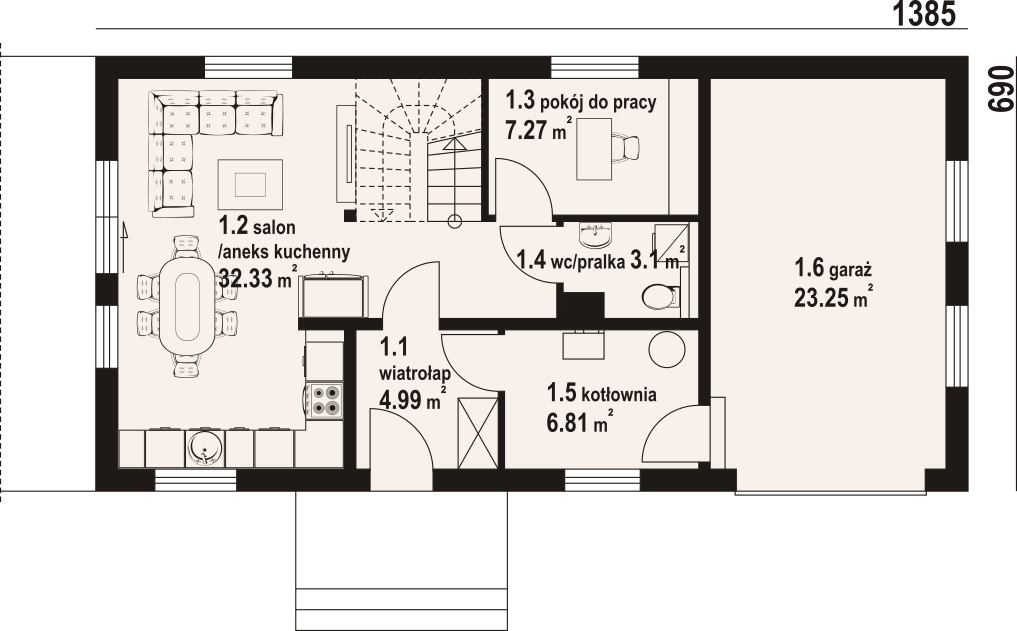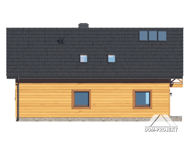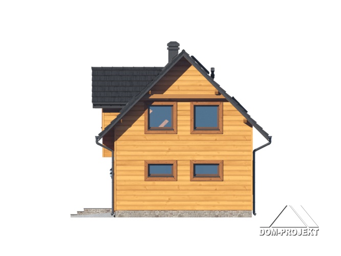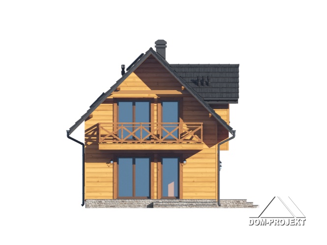 Dom w konstrukcji szkieletu drewnianego. Na parterze salon z aneksem kuchennym, wyjściem na taras i schodami na poddasze. Na poddaszu cztery pokoje, łazienka, komunikacja, garderoba oraz balkon dostępny z dwóch pokoi. Zwarta bryła budynku oraz dach dwuspadowy sprzyjają szybkiej i taniej budowie oraz niskim kosztom eksploatacji.