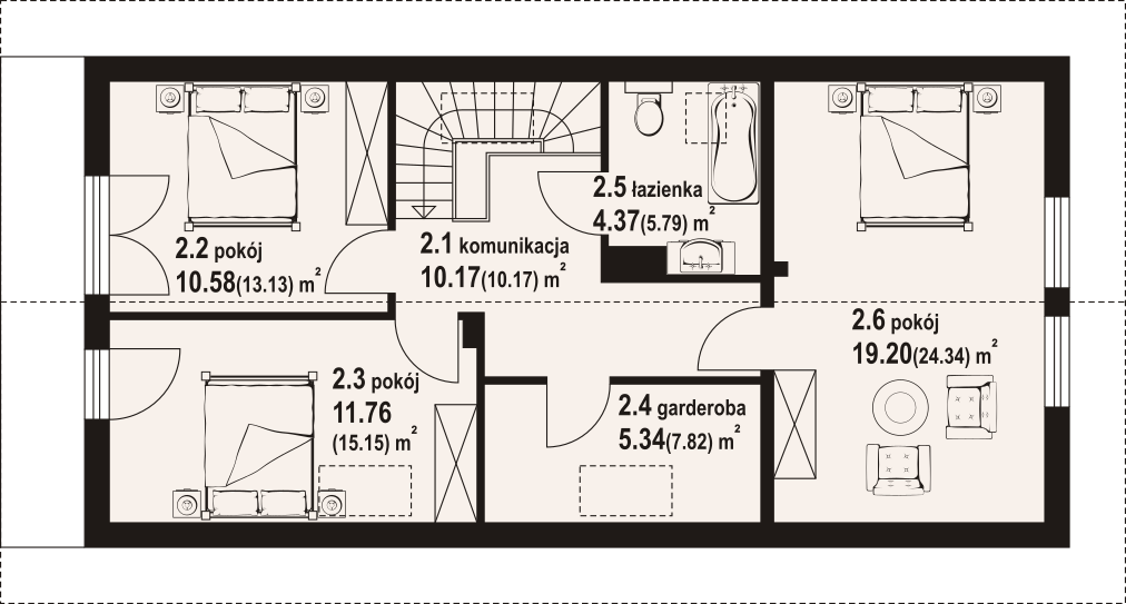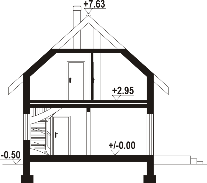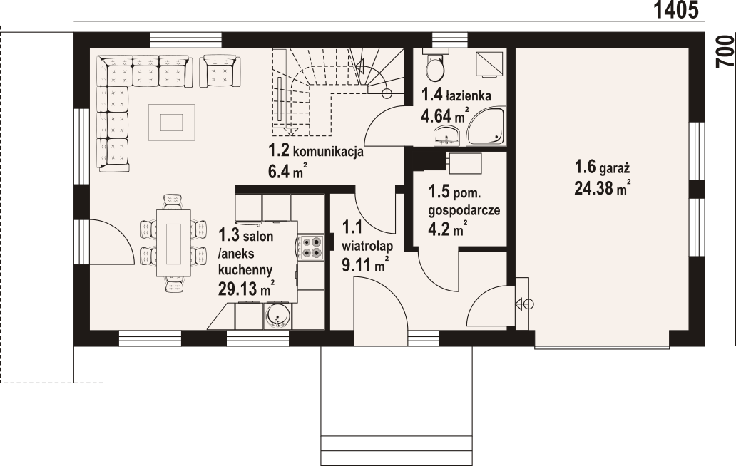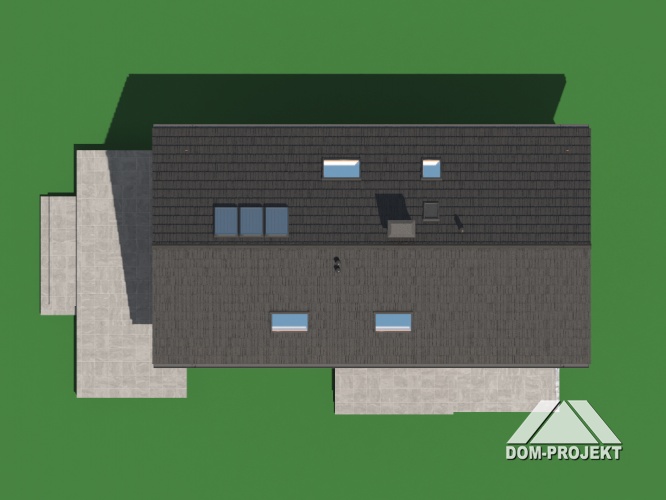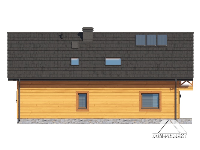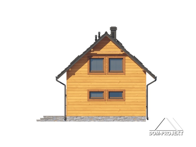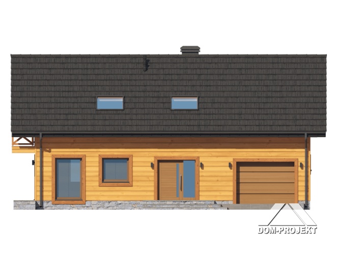 Dom w konstrukcji szkieletu drewnianego. Na parterze salon z aneksem kuchennym, wyjściem na taras i schodami na poddasze. Komunikacja, łazienka, pomieszczenie gospodarcze, wiatrołap, garaż. Na poddaszu trzy pokoje, łazienka, komunikacja, garderoba, łazienka oraz balkon dostępny z dwóch pokoi. Zwarta bryła budynku oraz dach dwuspadowy sprzyjają szybkiej i taniej budowie oraz niskim kosztom eksploatacji.