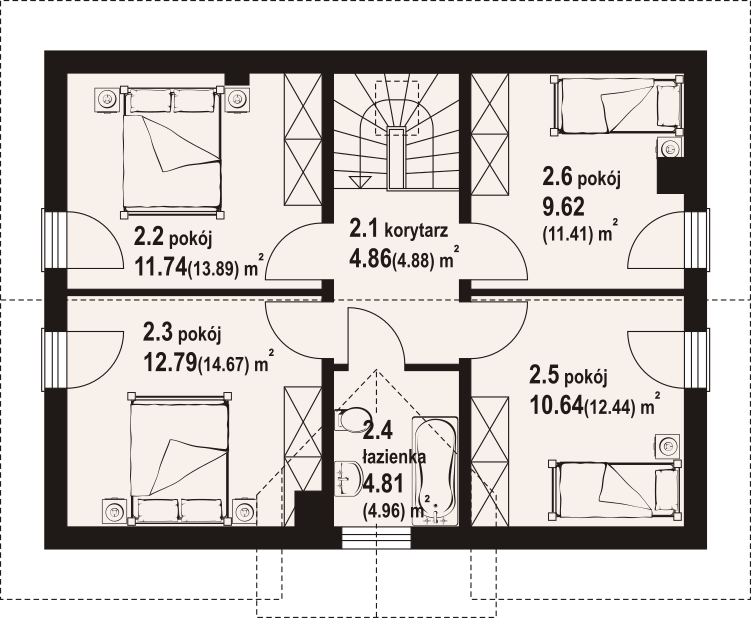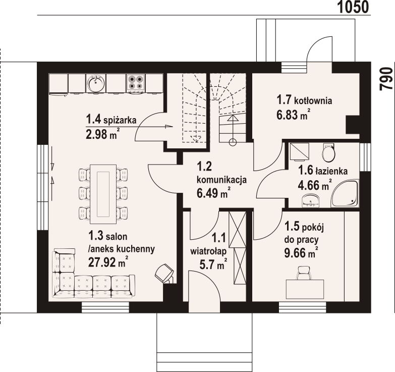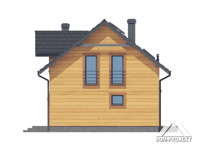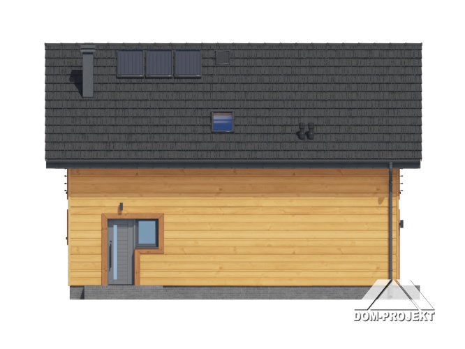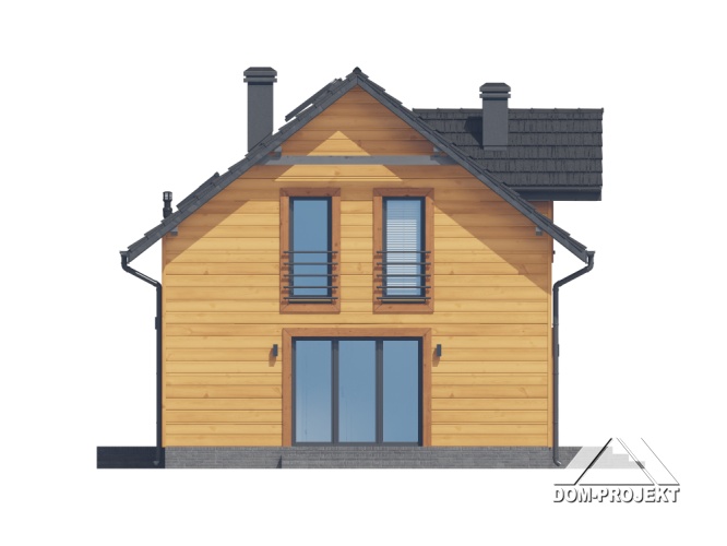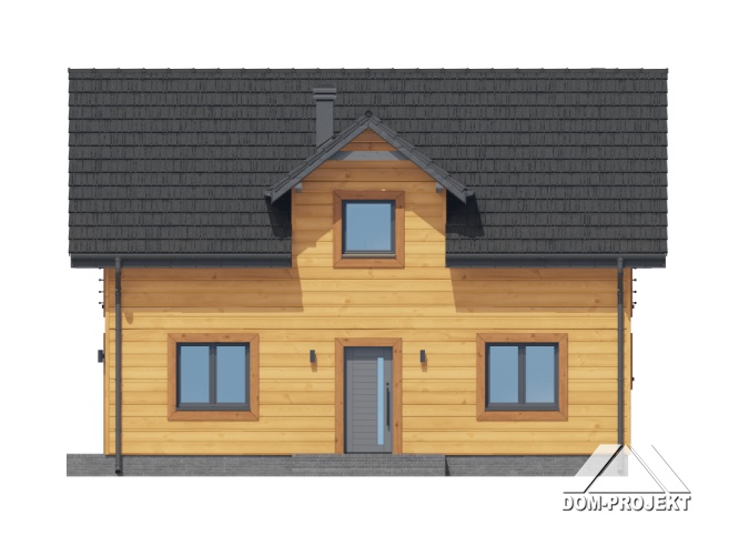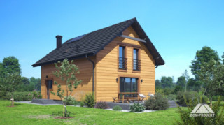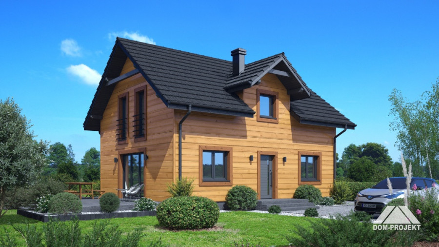 Dom w konstrukcji szkieletu drewnianego. Na parterze salon z aneksem kuchennym, kominkiem oraz wyjściem na taras. Pokój do pracy, kotłownia, łazienka, komunikacja, wiatrołap, spiżarka. Na poddaszu cztery pokoje, korytarz, łazienka. Zwarta bryła budynku oraz dach dwuspadowy sprzyjają szybkiej i taniej budowie oraz niskim kosztom eksploatacji.