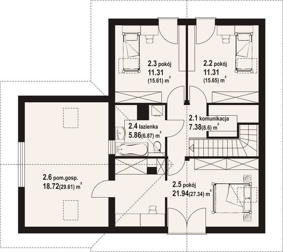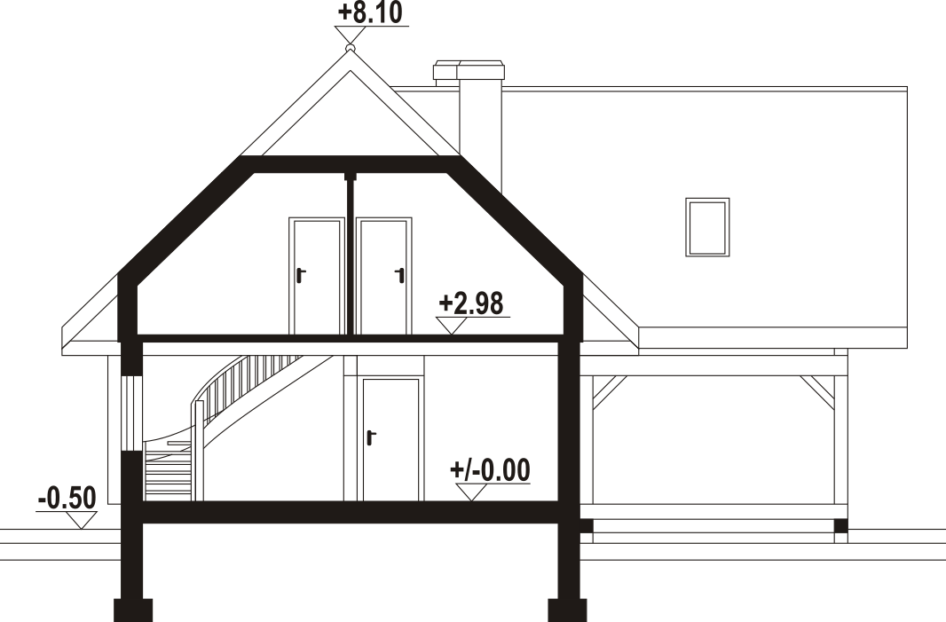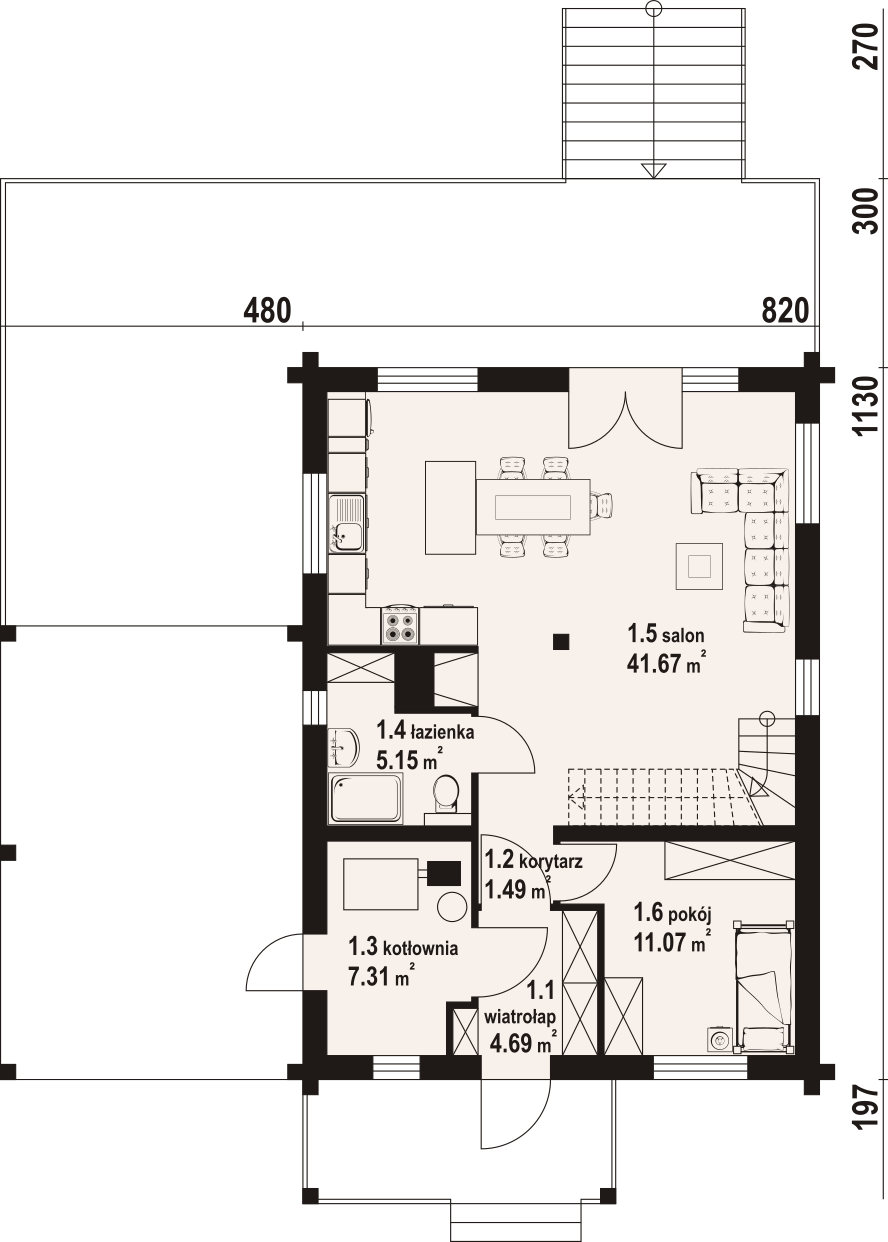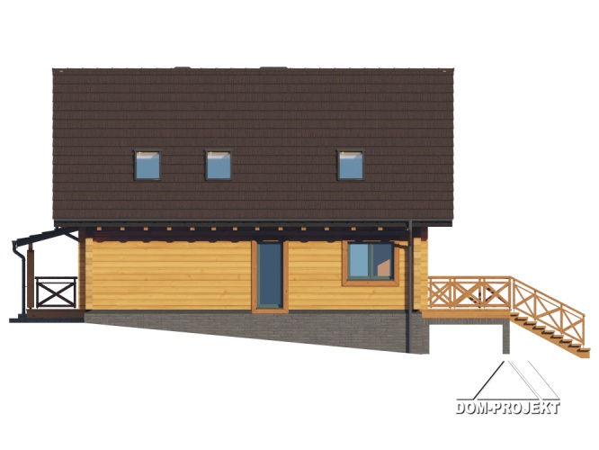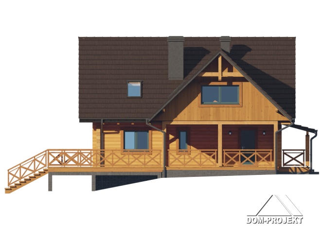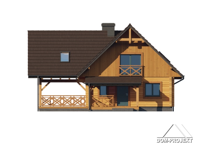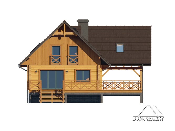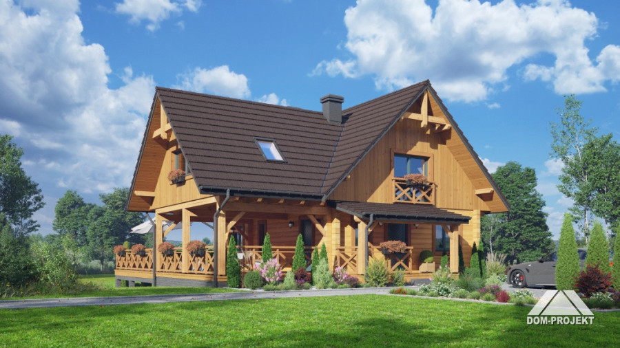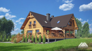 Dom z bali z poddaszem użytkowym. Na parterze duży salon z aneksem kuchennym, kominkiem oraz wyjściem na taras. Pokój, łazienka, kotłownia, korytarz, wiatrołap. Na poddaszu trzy pokoje, łazienka, komunikacja, pomieszczenie gospodarcze. Z boku domu duży, częściowo zadaszony taras.
