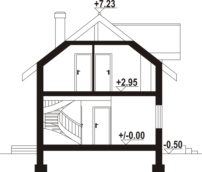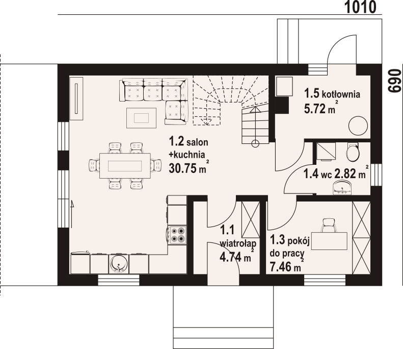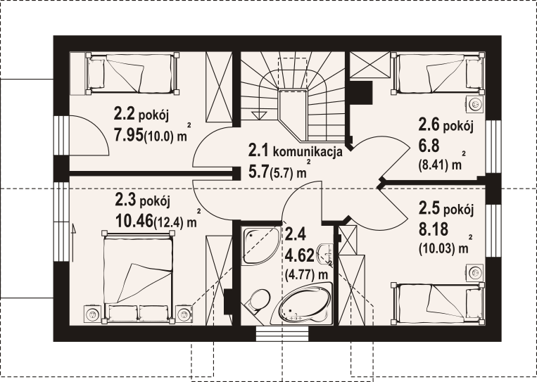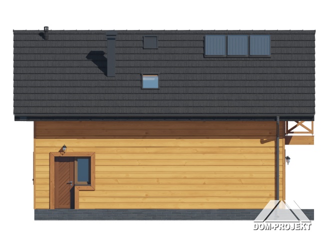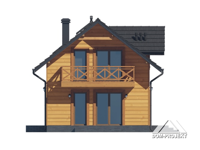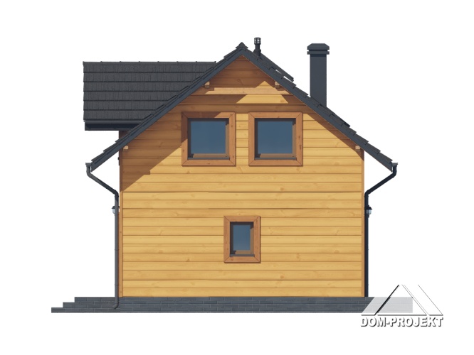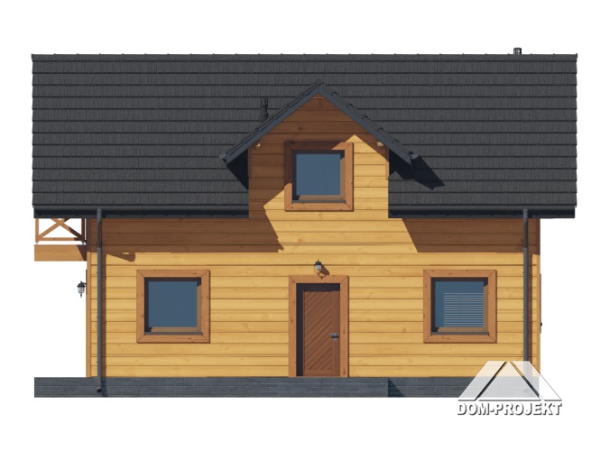 Dom w konstrukcji szkieletu drewnianego. Na parterze salon z kuchnią, wyjściem na taras i schodami na poddasze. Pokój do pracy, wc, kotłownia, wiatrołap. Na poddaszu cztery pokoje, komunikacja, łazienka, balkon dostępny z dwóch pokoi. Zwarta bryła budynku oraz dach dwuspadowy sprzyjają szybkiej i taniej budowie oraz niskim kosztom eksploatacji.