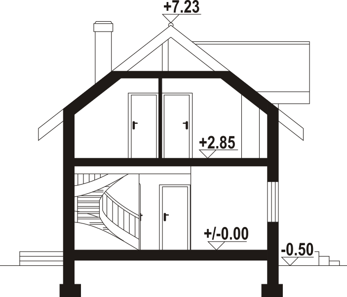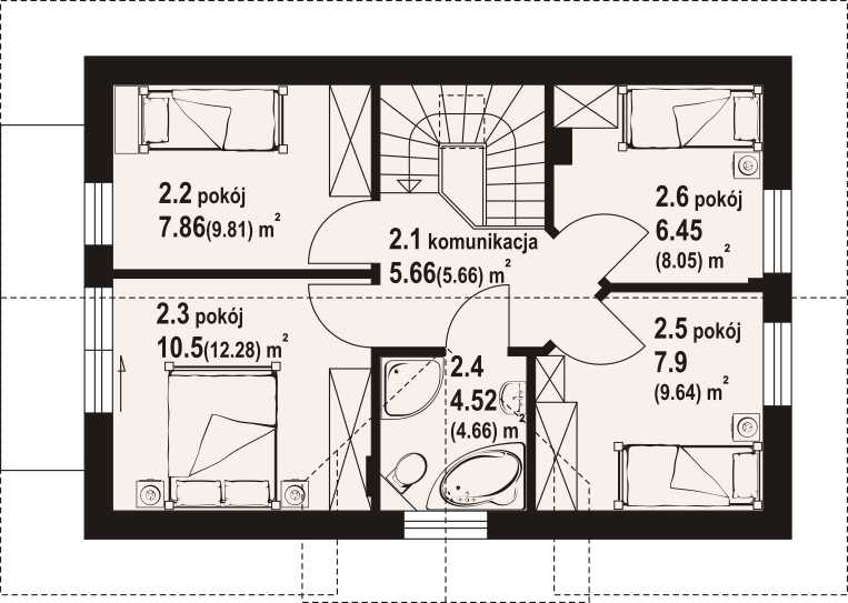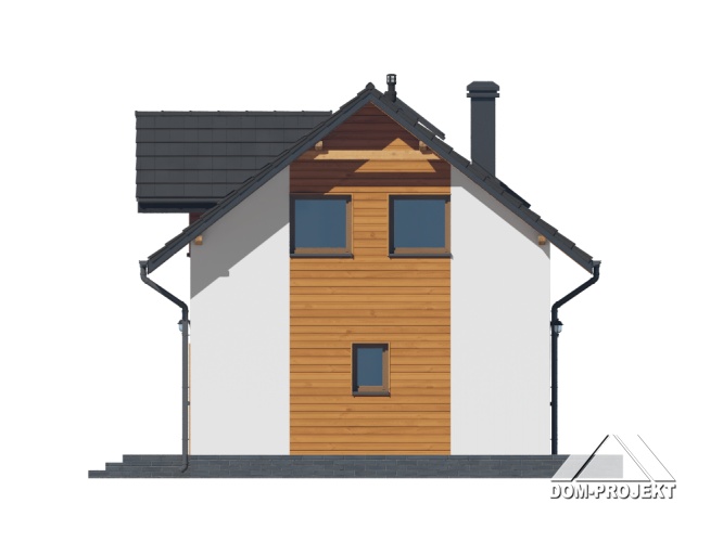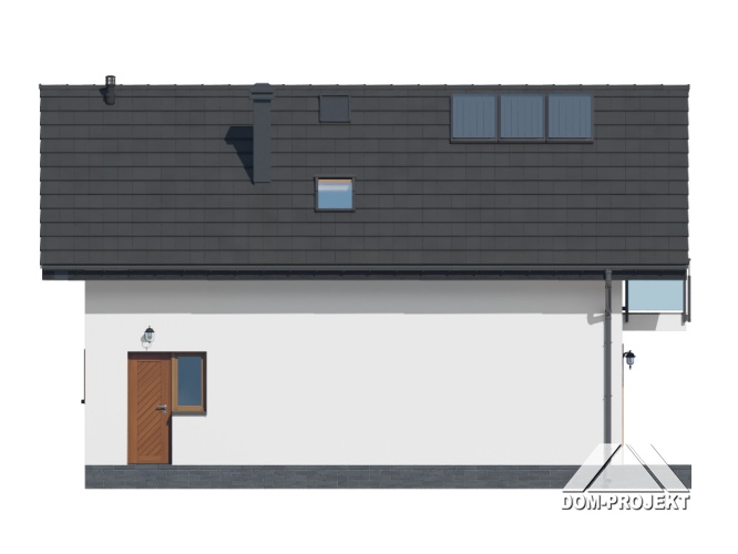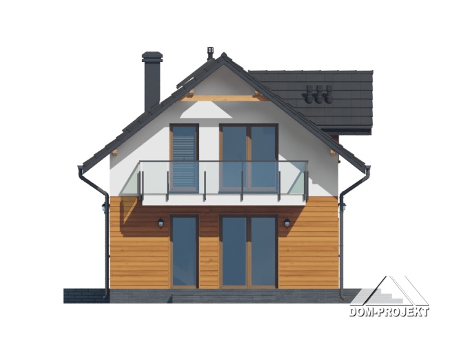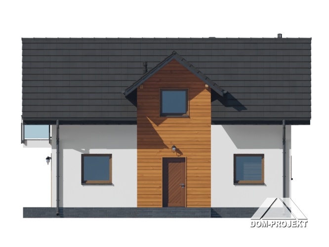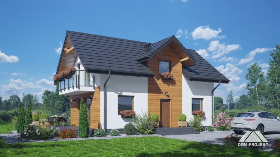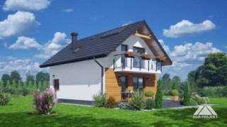 Dom z poddaszem użytkowym. Na parterze salon z aneksem kuchennym, wyjściem na taras i schodami na poddasze. Pokój do pracy, wiatrołap, wc, kotłownia. Na poddaszu cztery pokoje, łazienka, komunikacja oraz balkon dostępny z dwóch pokoi. Zwarta bryła budynku oraz dach dwuspadowy sprzyjają szybkiej i taniej budowie oraz niskim kosztom eksploatacji.