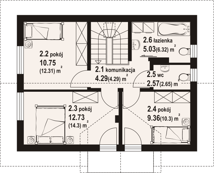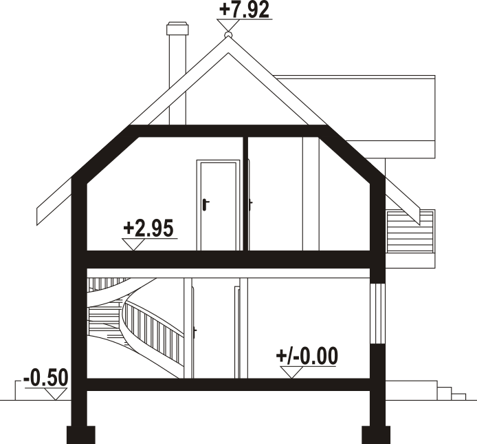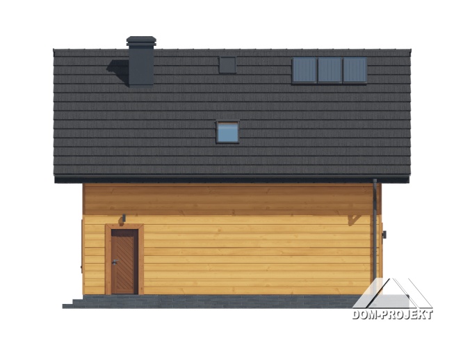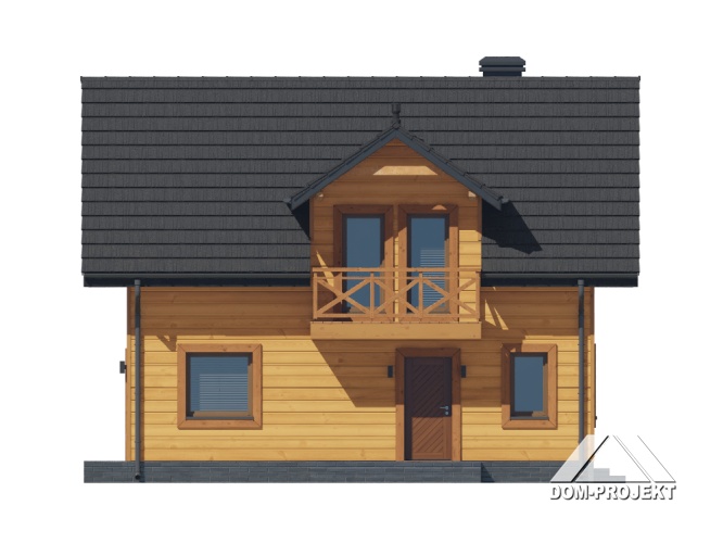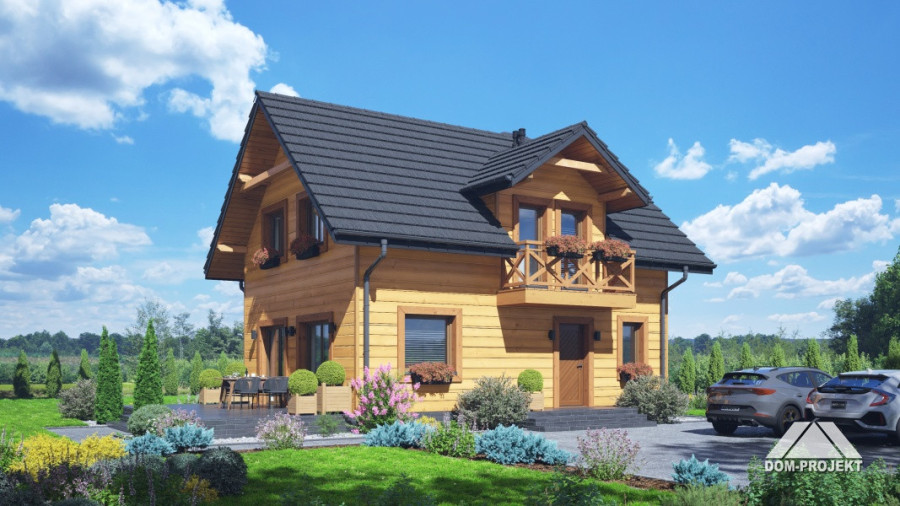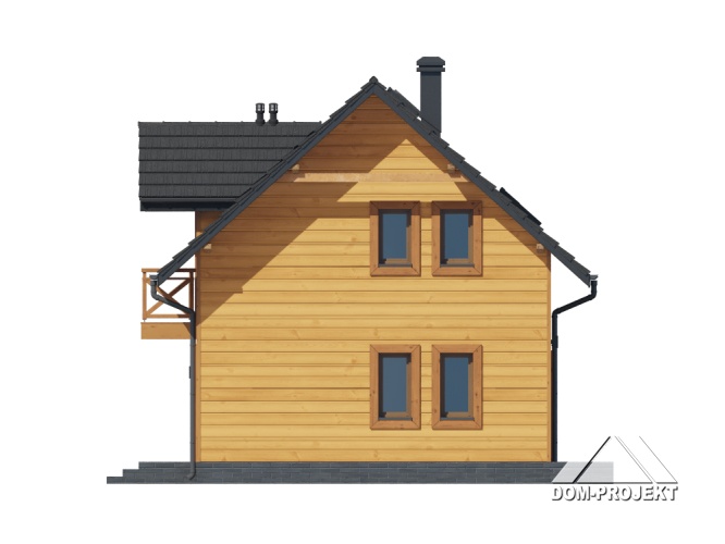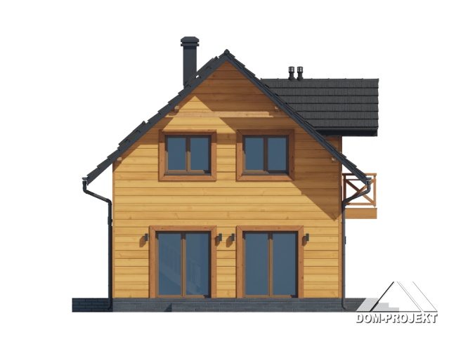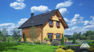 Dom z poddaszem użytkowym. Na parterze salon z aneksem kuchennym, wyjściem na taras i schodami na poddasze. Wiatrołap, łazienka, komunikacja oraz kotłownia. Na poddaszu trzy pokoje, wc, łazienka, komunikacja oraz balkon dostępny z dwóch pokoi. Zwarta bryła budynku oraz dach dwuspadowy sprzyjają szybkiej i taniej budowie oraz niskim kosztom eksploatacji.