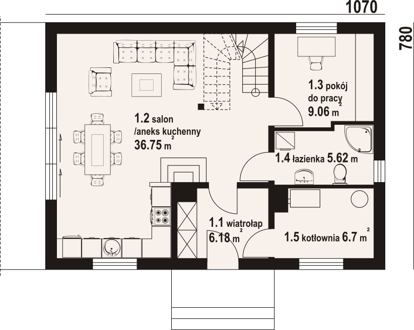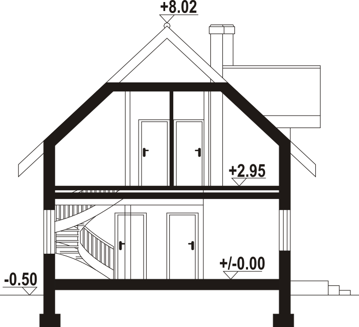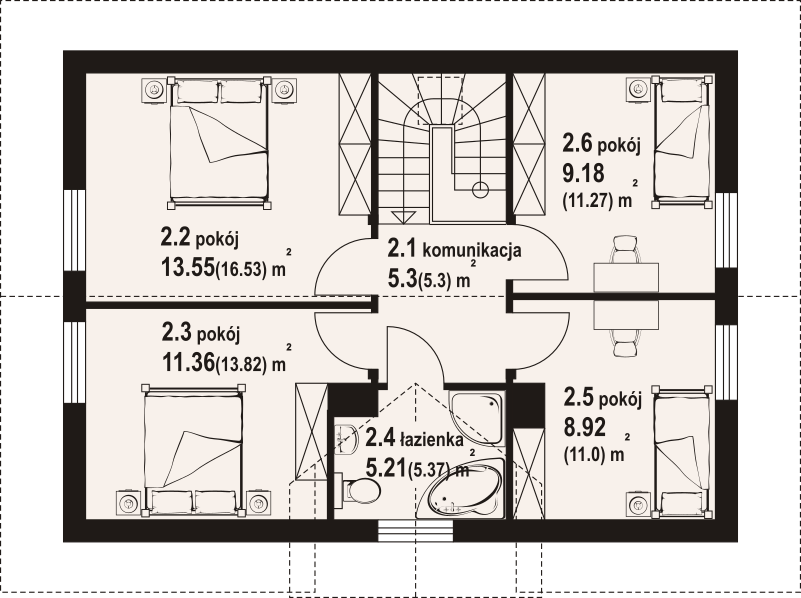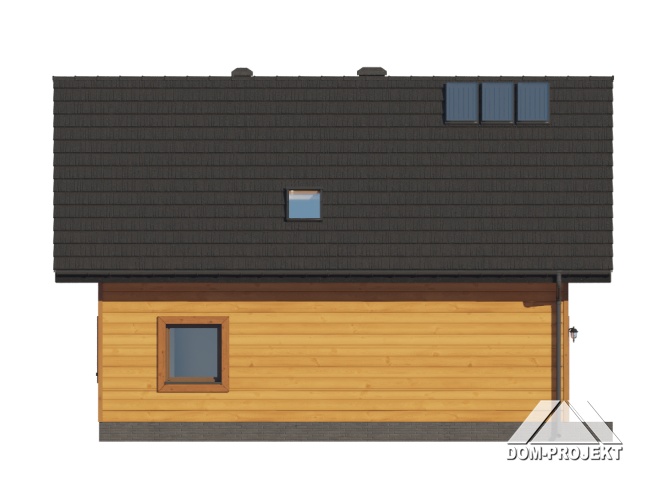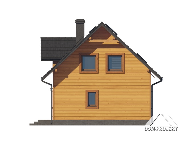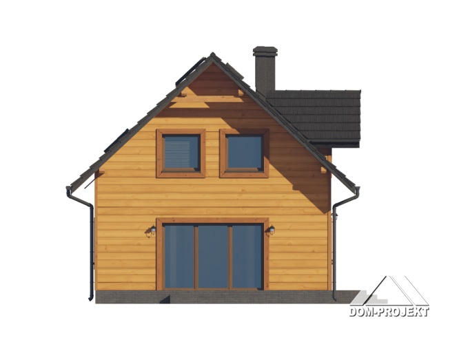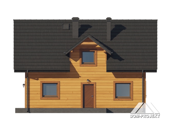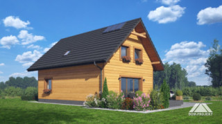 Dom w konstrukcji szkieletu drewnianego. Na parterze salon z aneksem kuchennym, kominkiem, wyjściem na taras i schodami na poddasze. Pokój do pracy, łazienka, kotłownia, wiatrołap. Na poddaszu cztery sypialnie, łazienka, komunikacja. Zwarta bryła budynku oraz dach dwuspadowy sprzyjają szybkiej i taniej budowie oraz niskim kosztom eksploatacji.