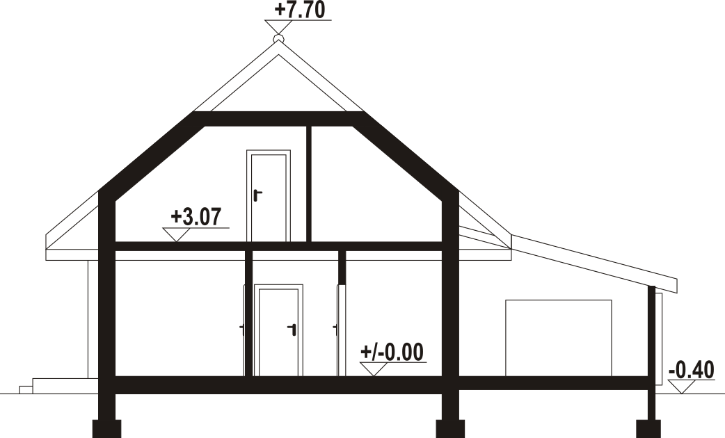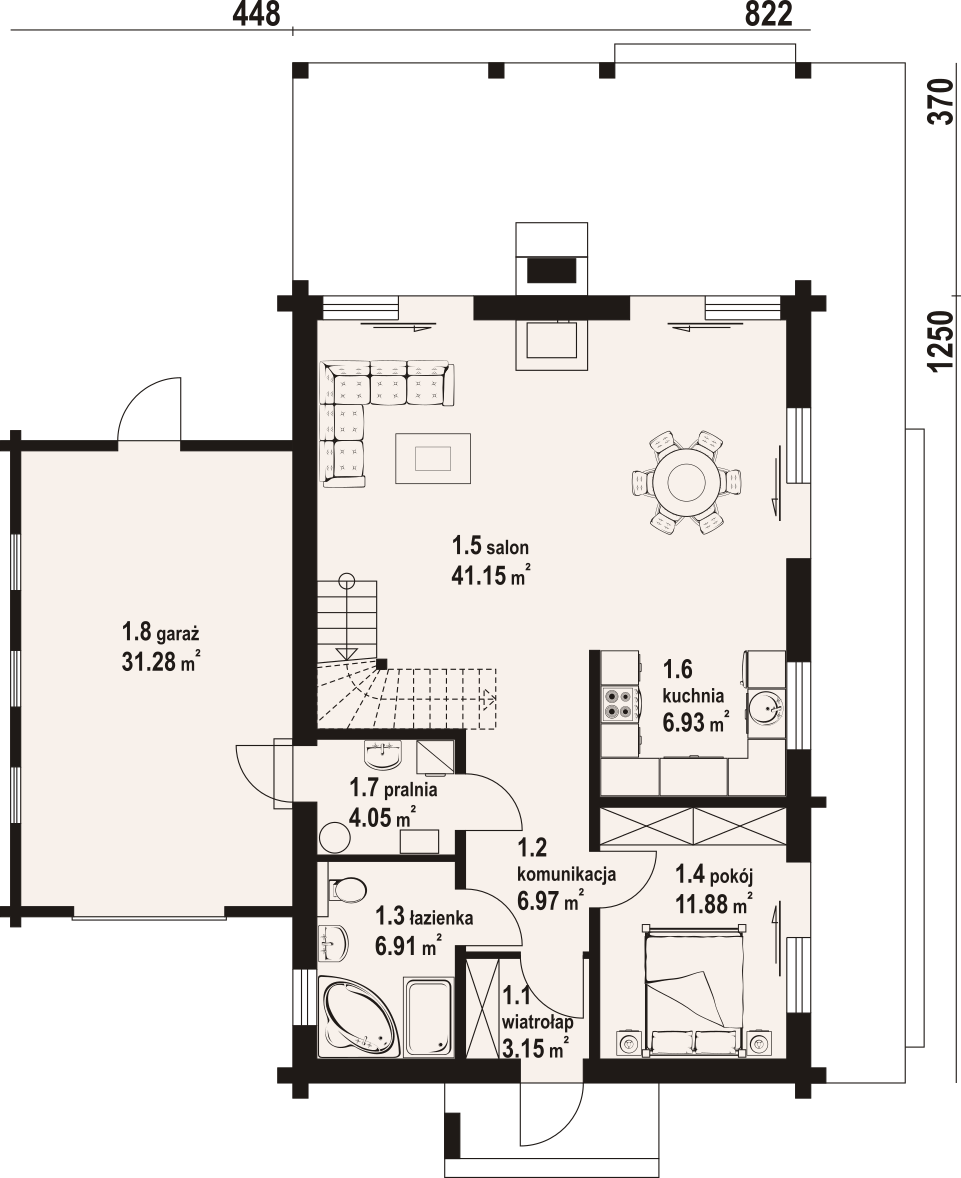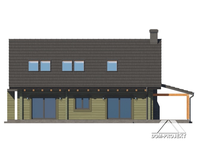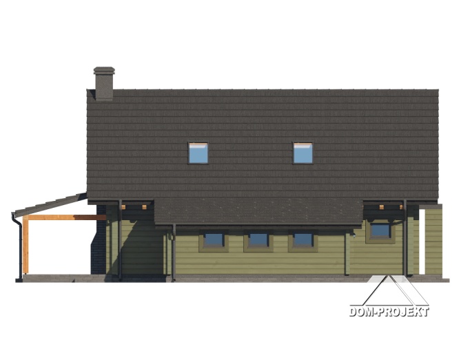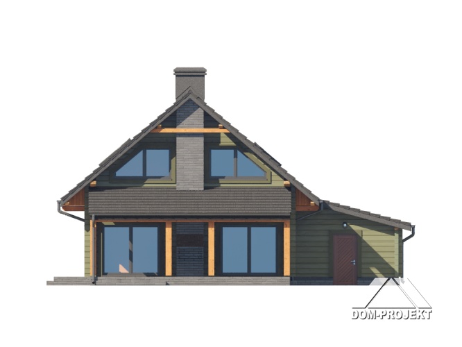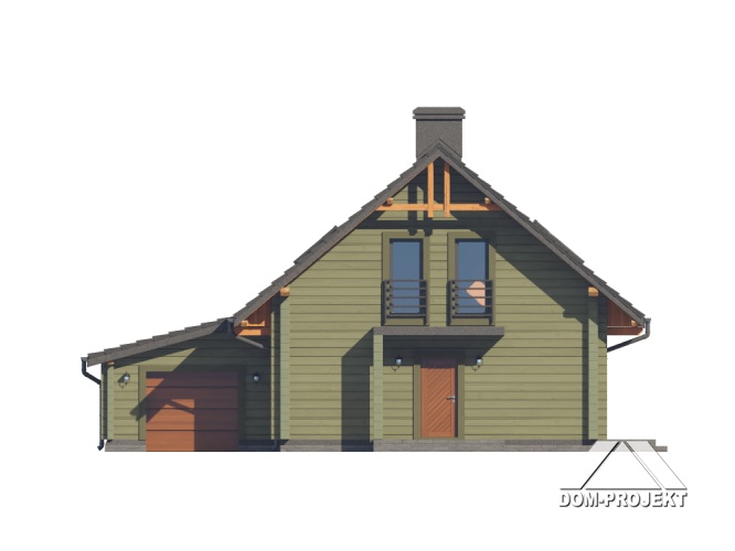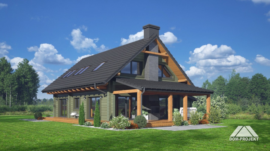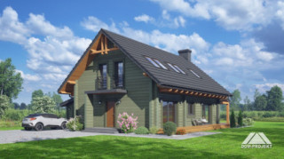 Dom z bali. Na parterze salon z aneksem kuchennym, kominkiem, wyjściem na duży, zadaszony taras oraz schodami na poddasze. Pokój, łazienka, komunikacja, wiatrołap, pralnia oraz garaż. Na poddaszu trzy pokoje, komunikacja, łazienka. Zwarta bryła budynku oraz dach dwuspadowy sprzyjają szybkiej i taniej budowie oraz niskim kosztom eksploatacji.