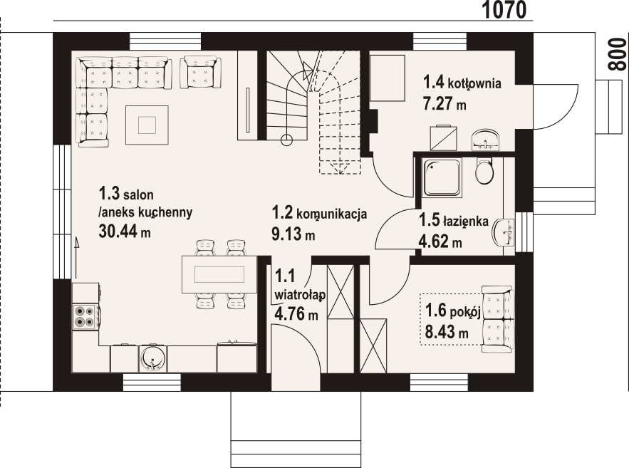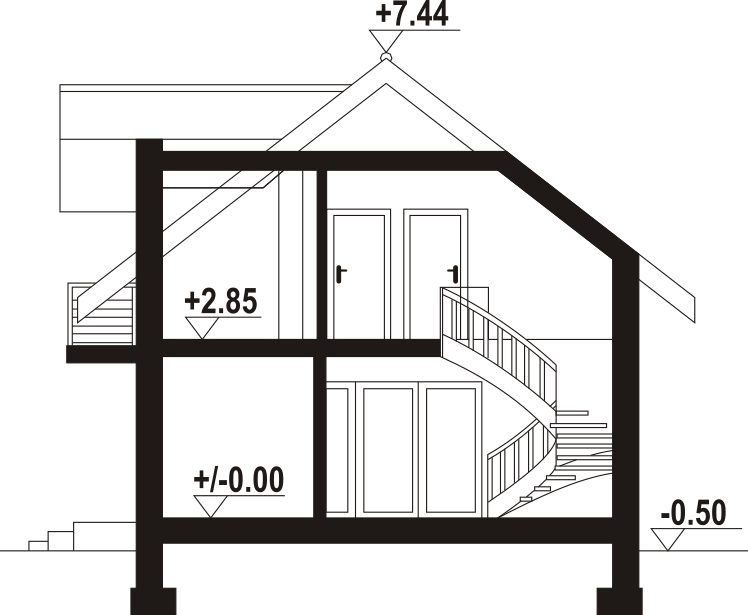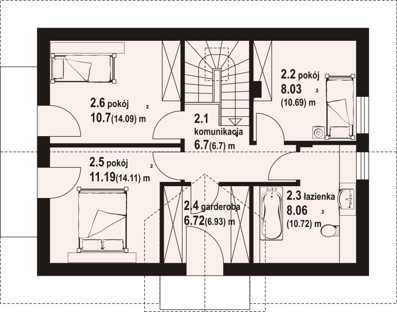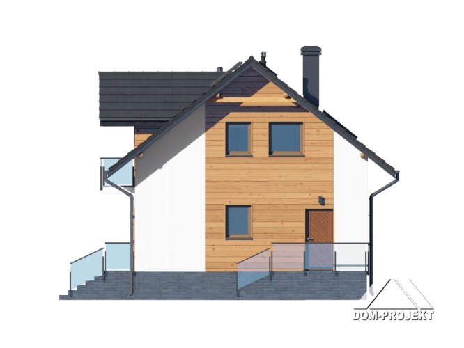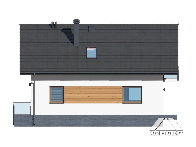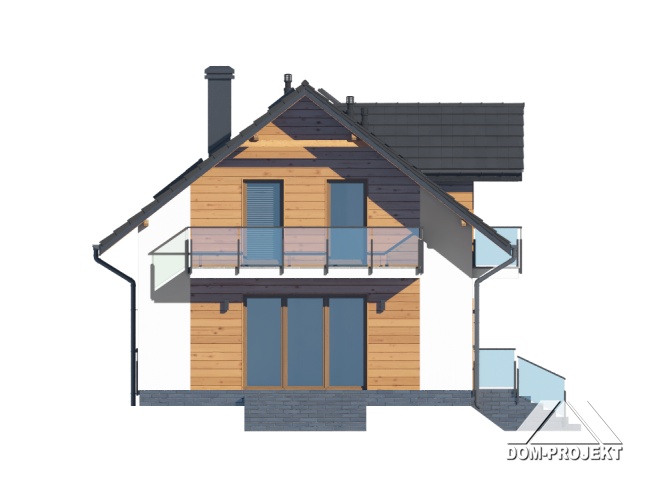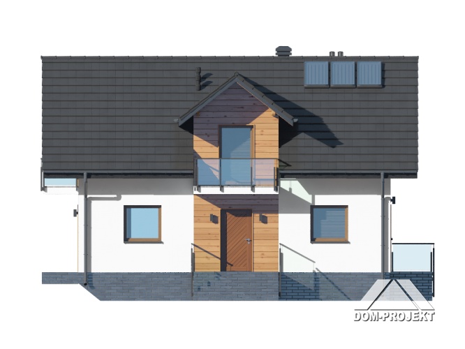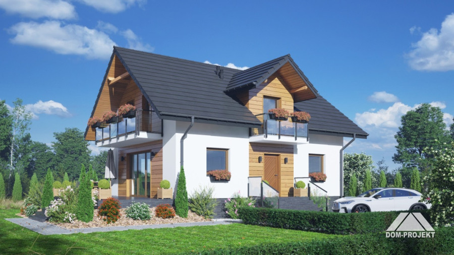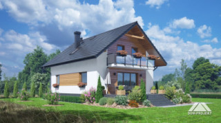 Dom z poddaszem użytkowym. Na parterze salon z aneksem kuchennym oraz wyjściem na taras. Pokój, wiatrołap, komunikacja, łazienka, kotłownia. Na poddaszu trzy pokoje, garderoba, łazienka, komunikacja. Dwa balkony. Zwarta bryła budynku oraz dach dwuspadowy sprzyjają szybkiej i taniej budowie oraz niskim kosztom eksploatacji.