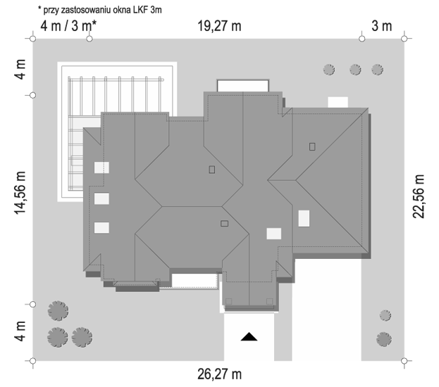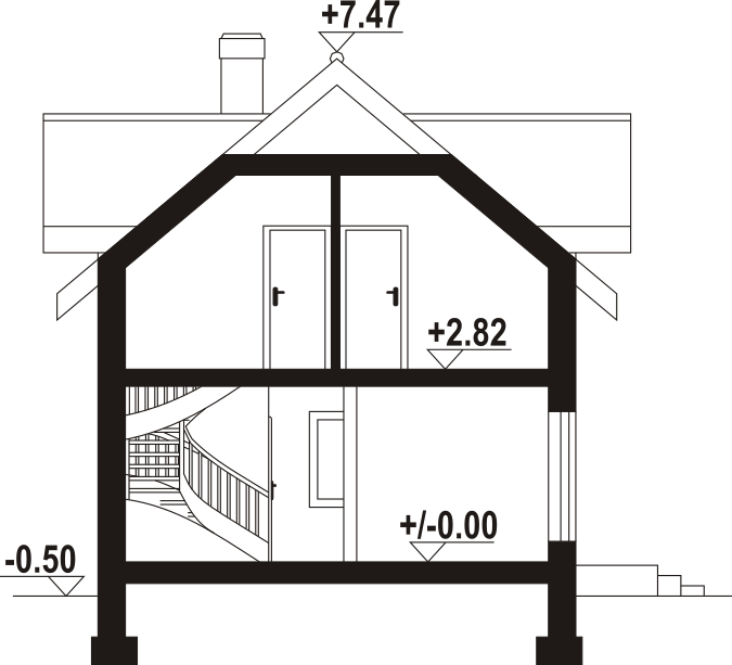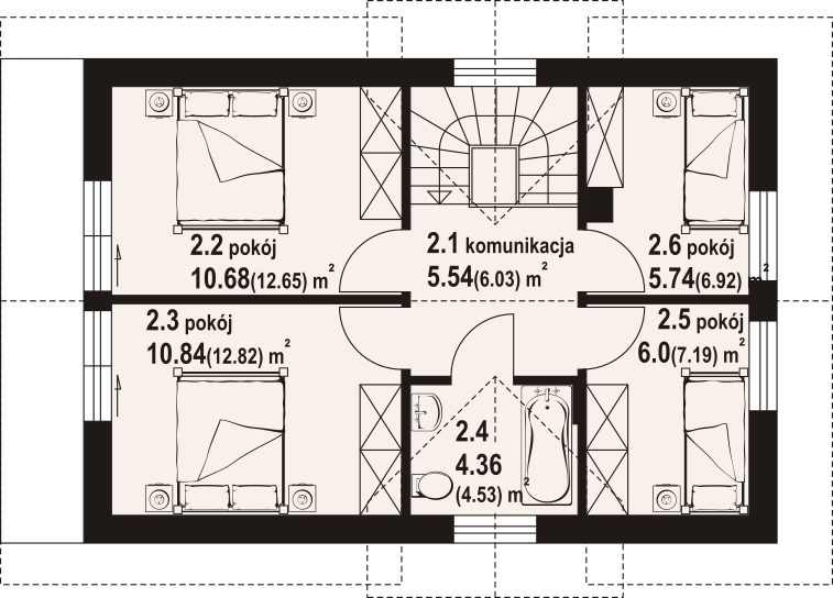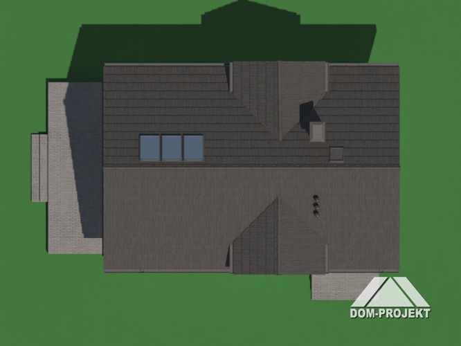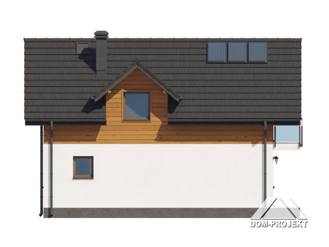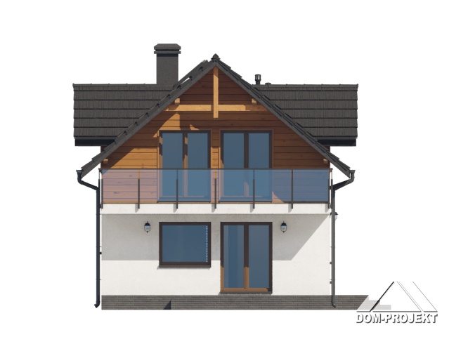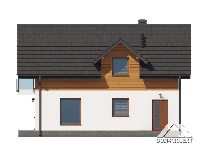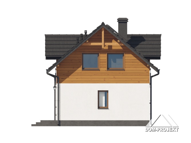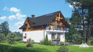 Dom z poddaszem użytkowym. Na parterze salon z aneksem kuchennym, wyjściem na taras i schodami na poddasze. Wc, komunikacja, wiatrołap. Na poddaszu cztery pokoje, łazienka, komunikacja. Zwarta bryła budynku oraz dach dwuspadowy sprzyjają szybkiej i taniej budowie oraz niskim kosztom eksploatacji.