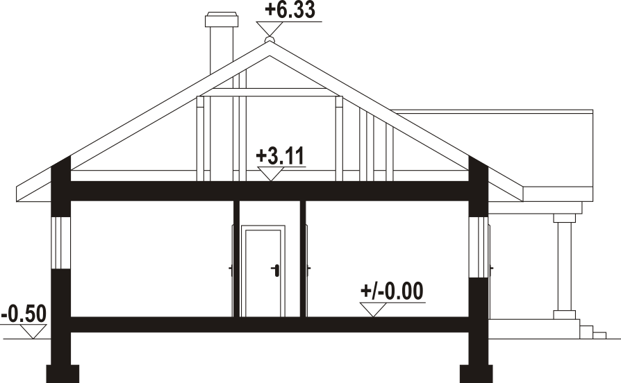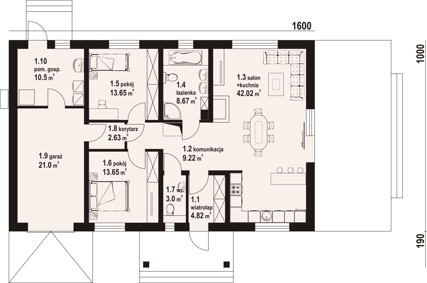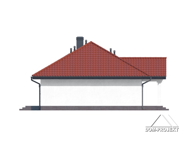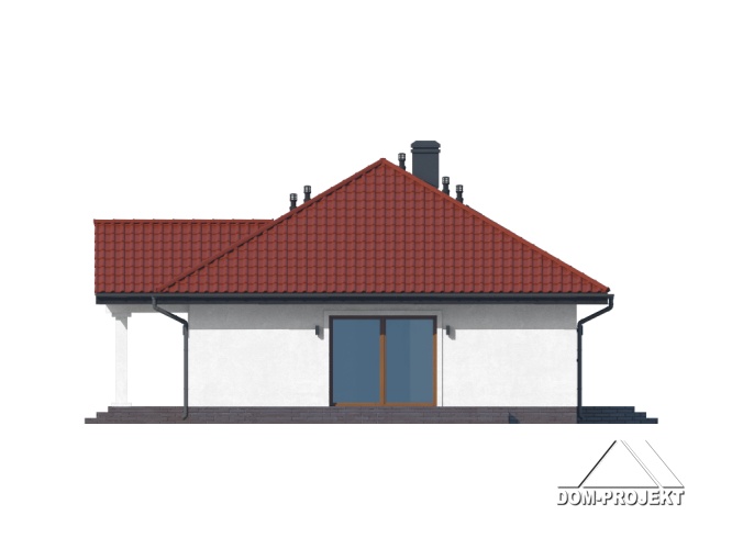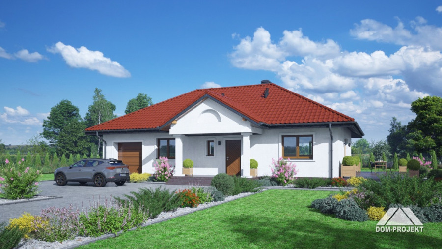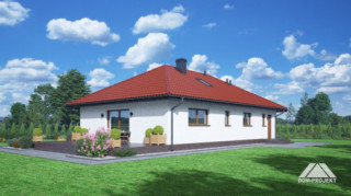 Dom parterowy. Salon z kuchnią, kominkiem oraz wyjściem na taras. Dwa pokoje, łazienka, korytarz, komunikacja, wc, wiatrołap, garaż oraz pomieszczenie gospodarcze. Wyjście na strych schodami strychowymi rozkładanymi.