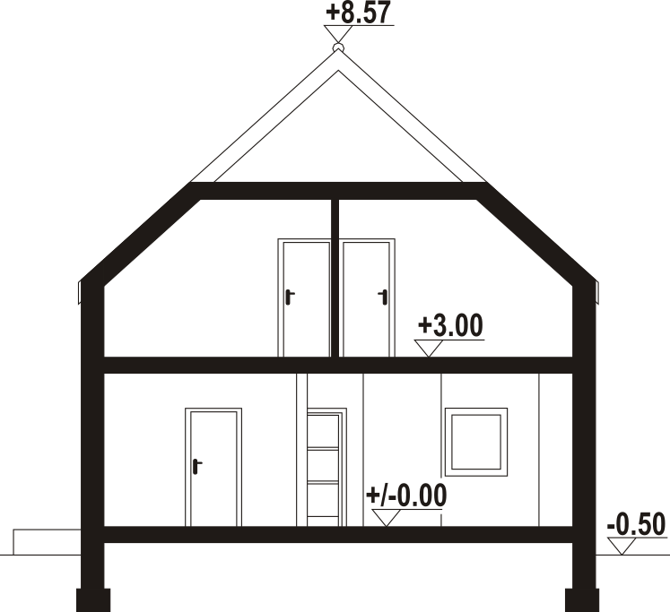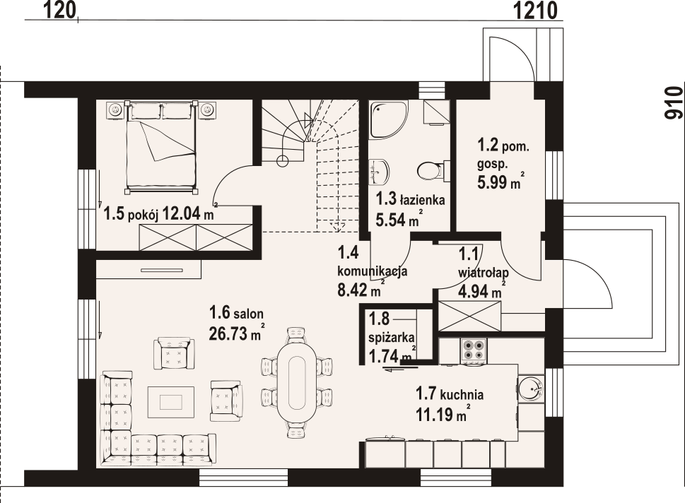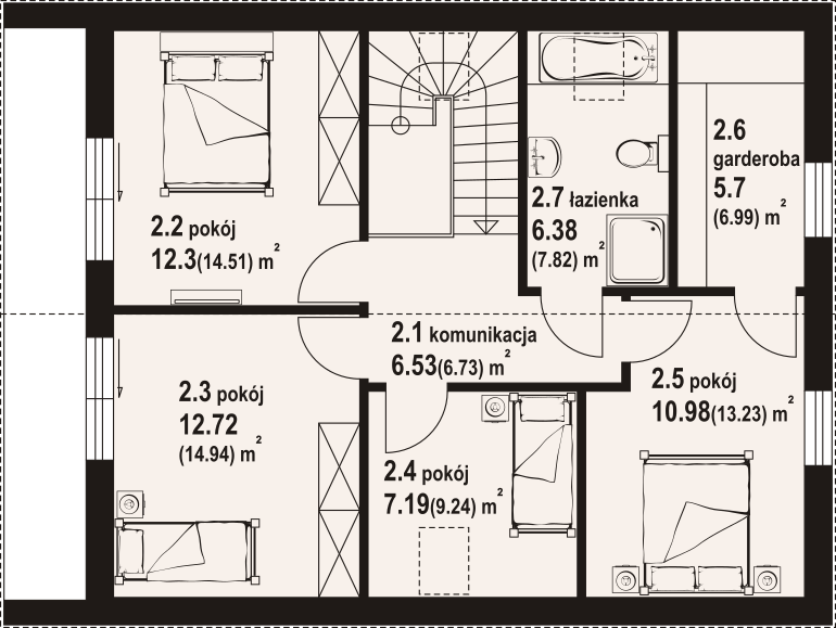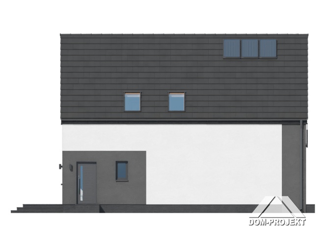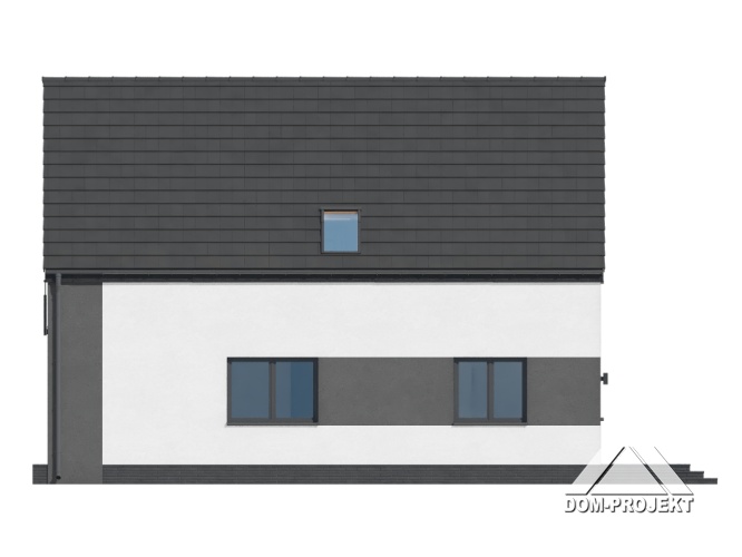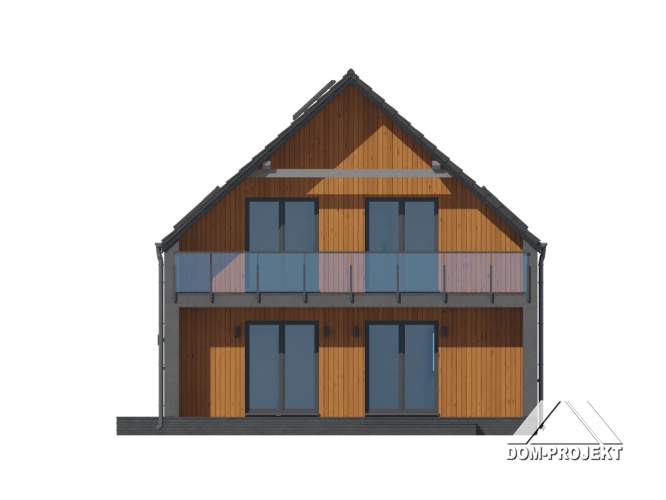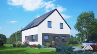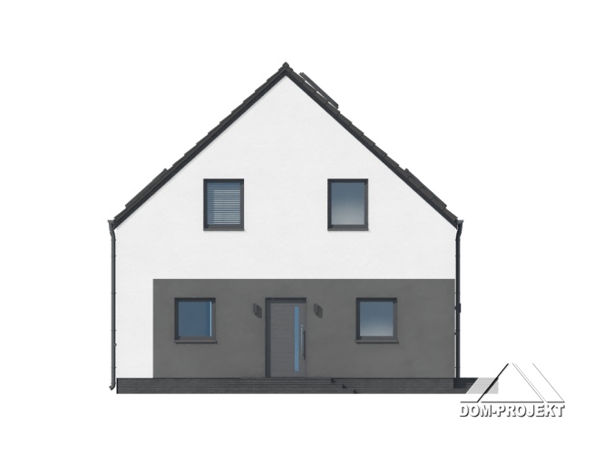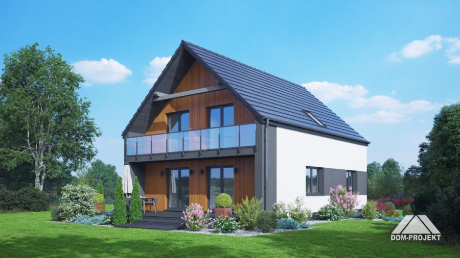 Dom z poddaszem użytkowym. Na parterze salon z kuchnią oraz wyjściem na taras. Spiżarka, pokój, łazienka, pomieszczenie gospodarcze, komunikacja, wiatrołap. Na poddaszu cztery pokoje, łazienka, garderoba, komunikacja. Balkon dostępny z dwóch pokoi. Zwarta bryła budynku oraz dach dwuspadowy sprzyjają szybkiej i taniej budowie oraz niskim kosztom eksploatacji.