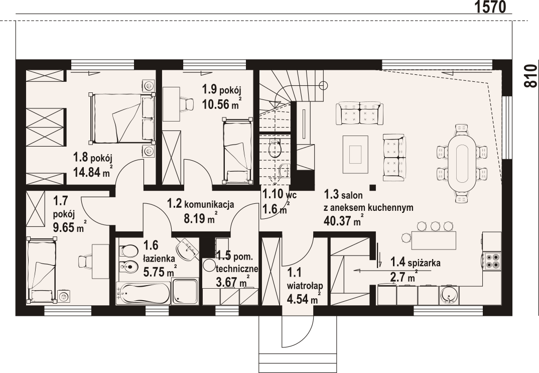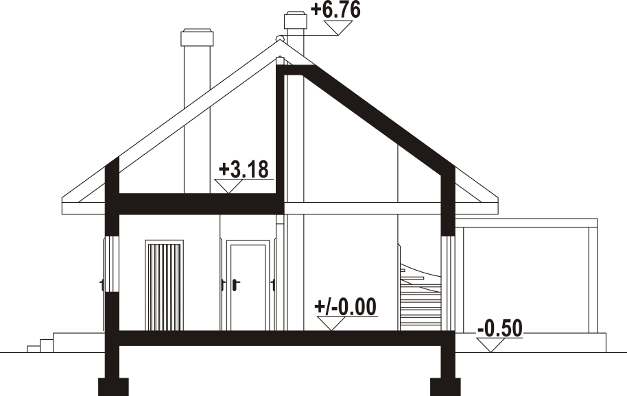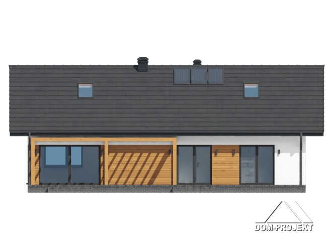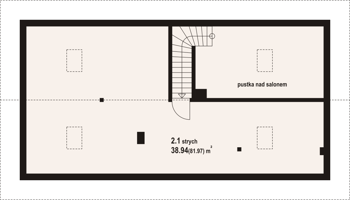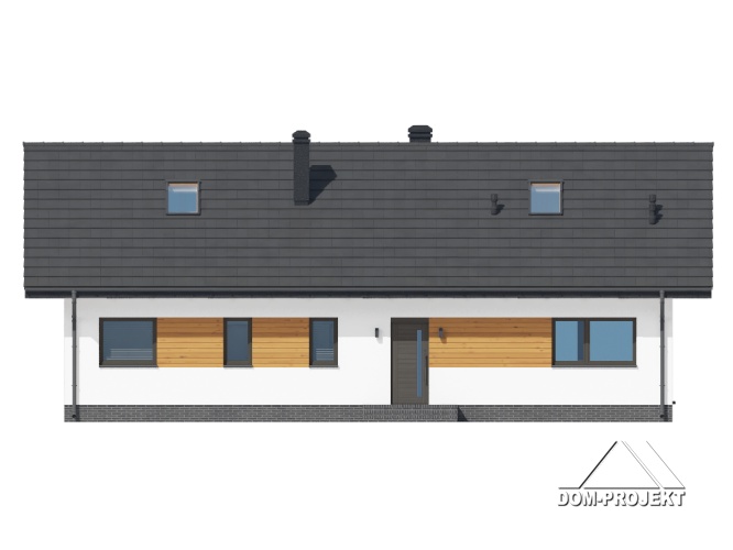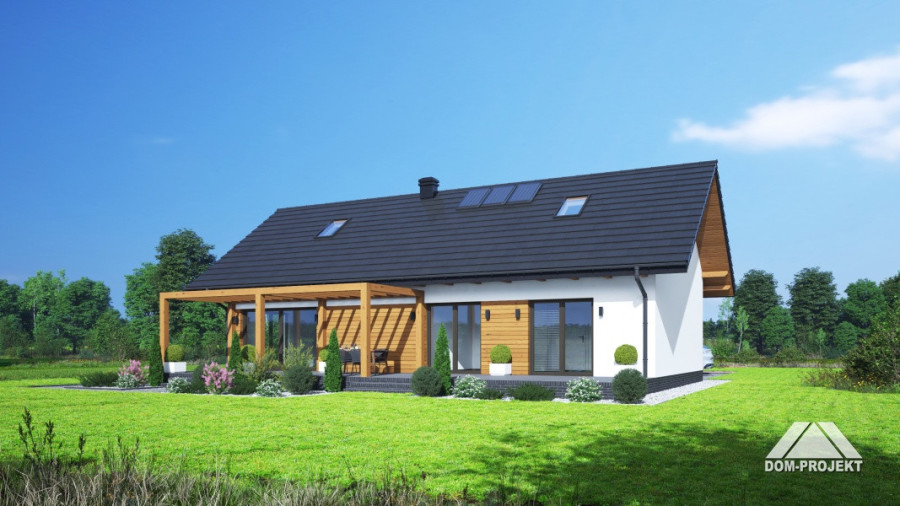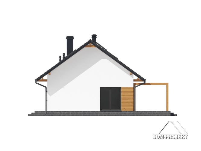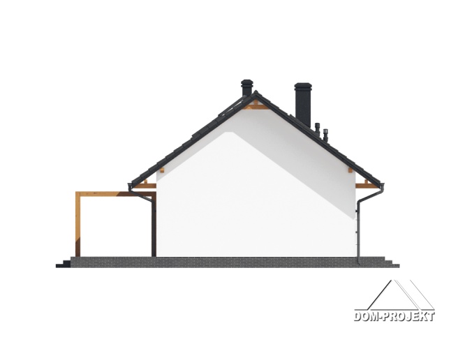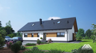 Dom parterowy. Salon z aneksem kuchennym, kominkiem, wyjściem na taras i schodami na poddasze. Spiżarka, wc, wiatrołap, trzy pokoje, łazienka, pomieszczenie techniczne, komunikacja. Na poddaszu strych. Zwarta bryła budynku oraz dach dwuspadowy sprzyjają szybkiej i taniej budowie oraz niskim kosztom eksploatacji.