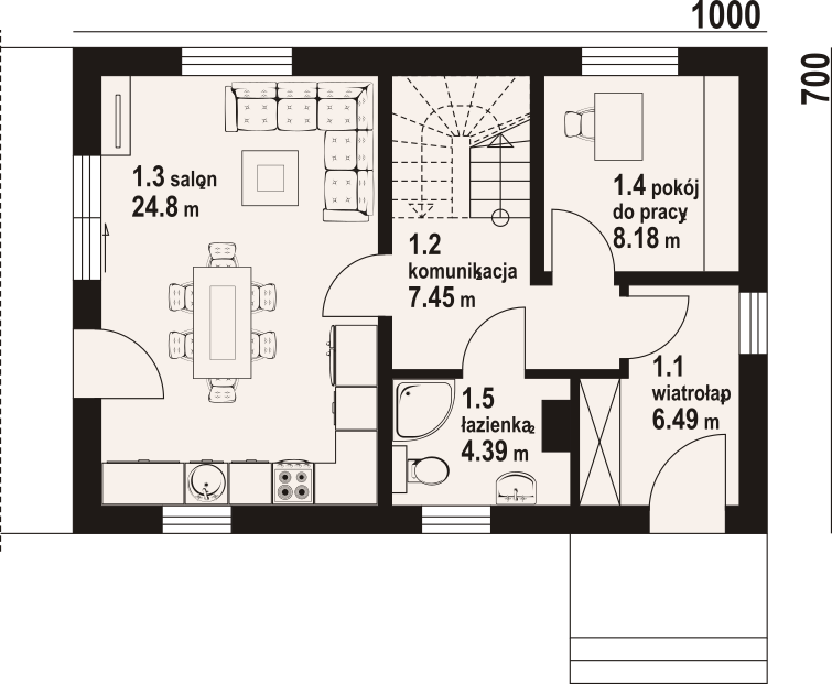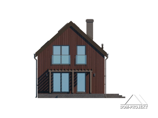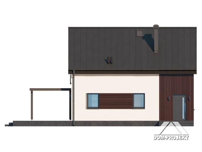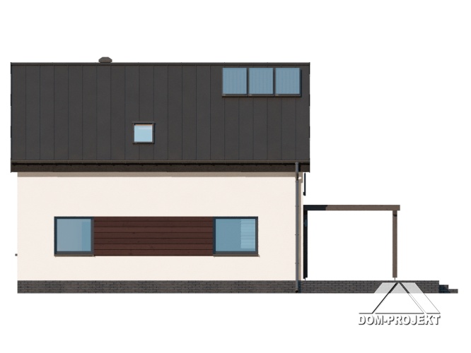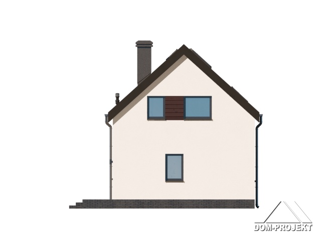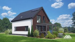 Dom z poddaszem użytkowym. Na parterze salon z aneksem kuchennym oraz wyjściem na taras. Pokój do pracy, łazienka, komunikacja, wiatrołap. Na poddaszu trzy pokoje, łazienka, schowek, komunikacja. Zwarta bryła budynku oraz dach dwuspadowy sprzyjają szybkiej i taniej budowie oraz niskim kosztom eksploatacji.