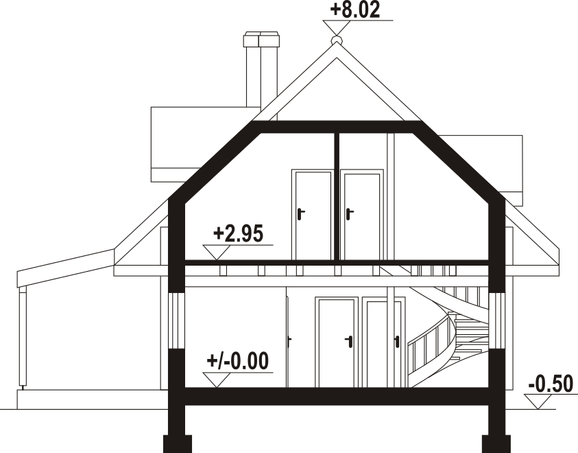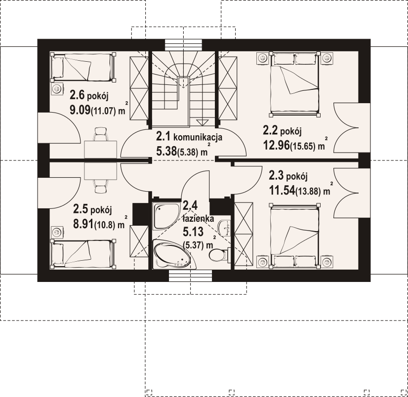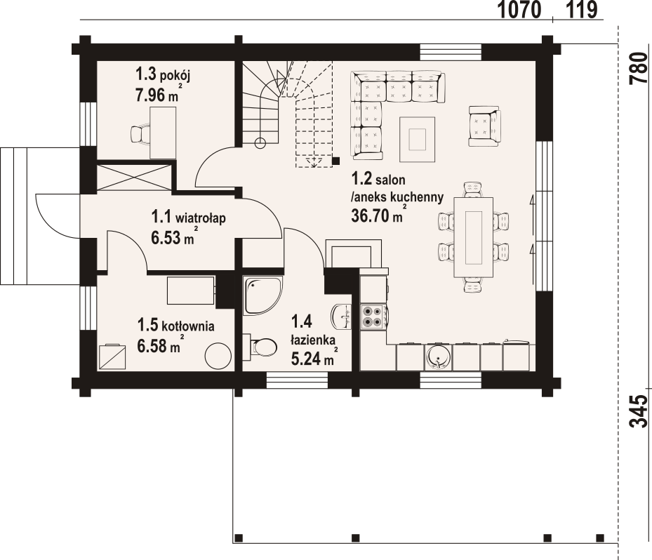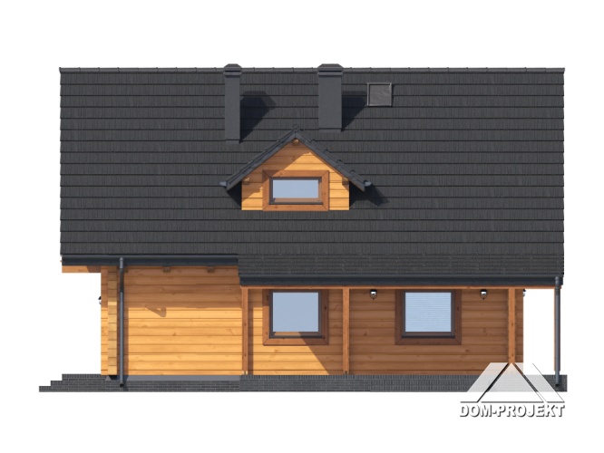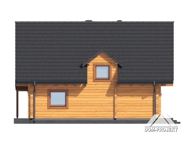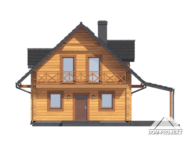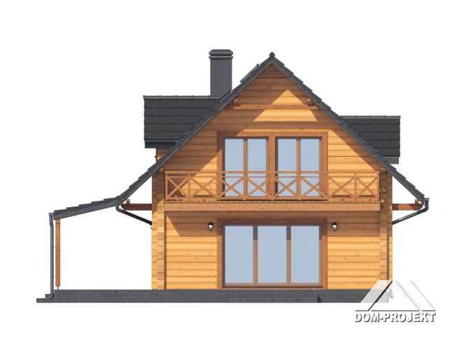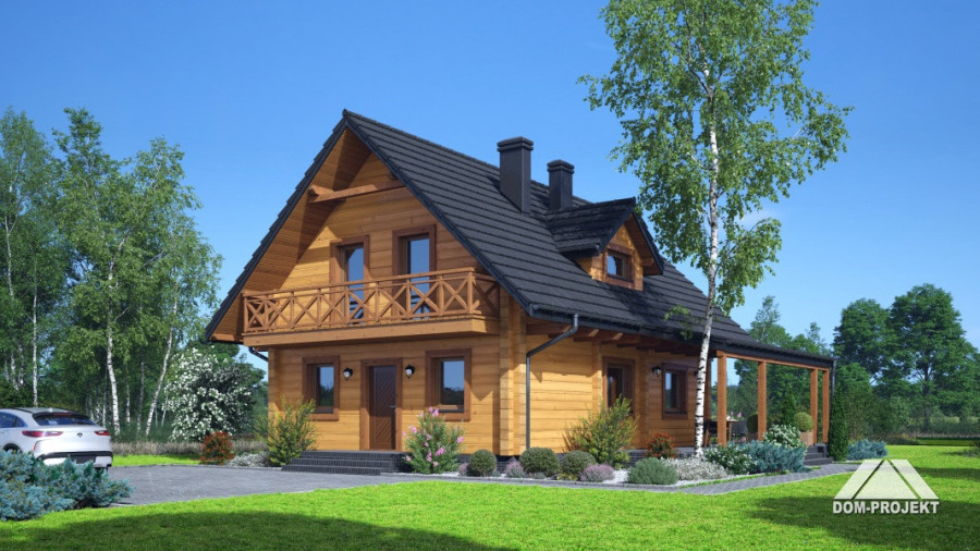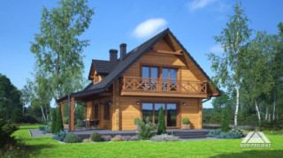 Dom z bali. Na parterze salon z aneksem kuchennym, wyjściem na taras i schodami na poddasze. Pokój, wiatrołap, kotłownia, łazienka. Na poddaszu cztery pokoje, łazienka, komunikacja, dwa balkony. Zwarta bryła budynku oraz dach dwuspadowy sprzyjają szybkiej i taniej budowie oraz niskim kosztom eksploatacji.