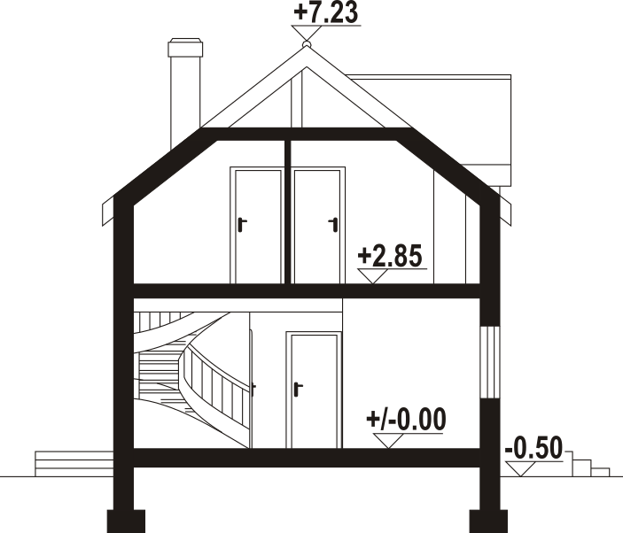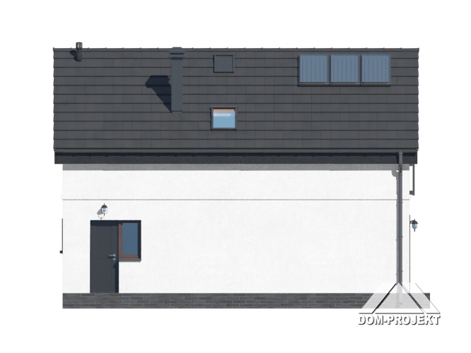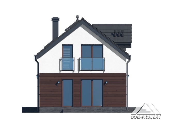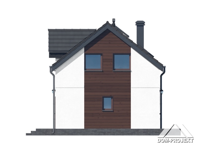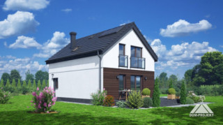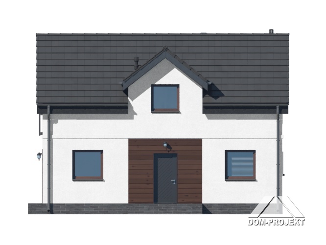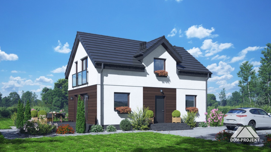 Dom z poddaszem użytkowym. Na parterze salon z kuchnią, wyjściem na taras i schodami na poddasze. Pokój do pracy, wc, kotłownia, wiatrołap. Na poddaszu cztery pokoje, łazienka, komunikacja. Zwarta bryła budynku oraz dach dwuspadowy sprzyjają szybkiej i taniej budowie oraz niskim kosztom eksploatacji.