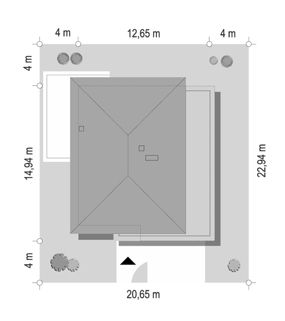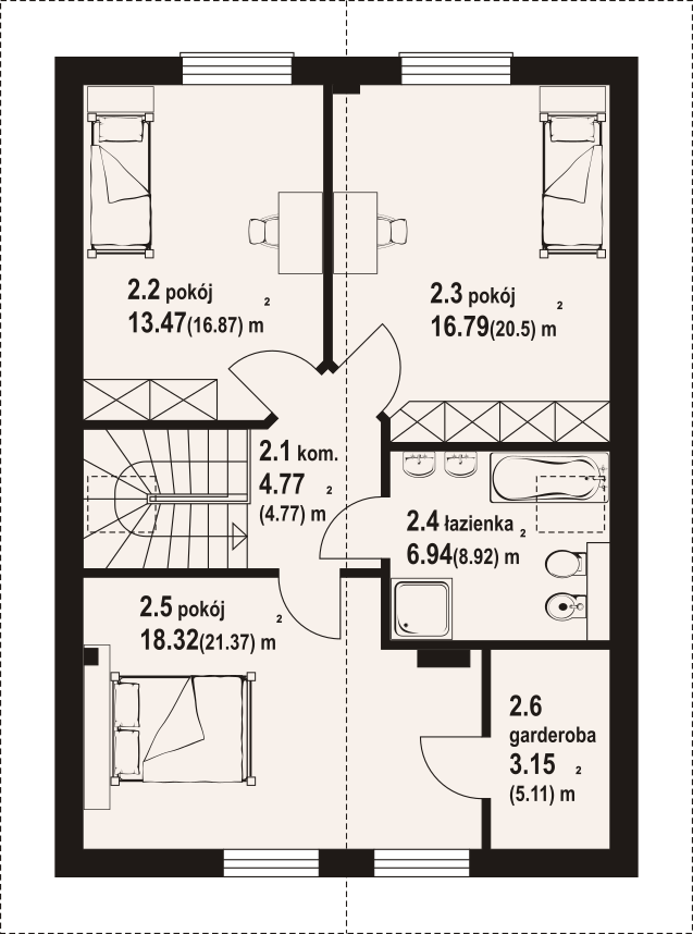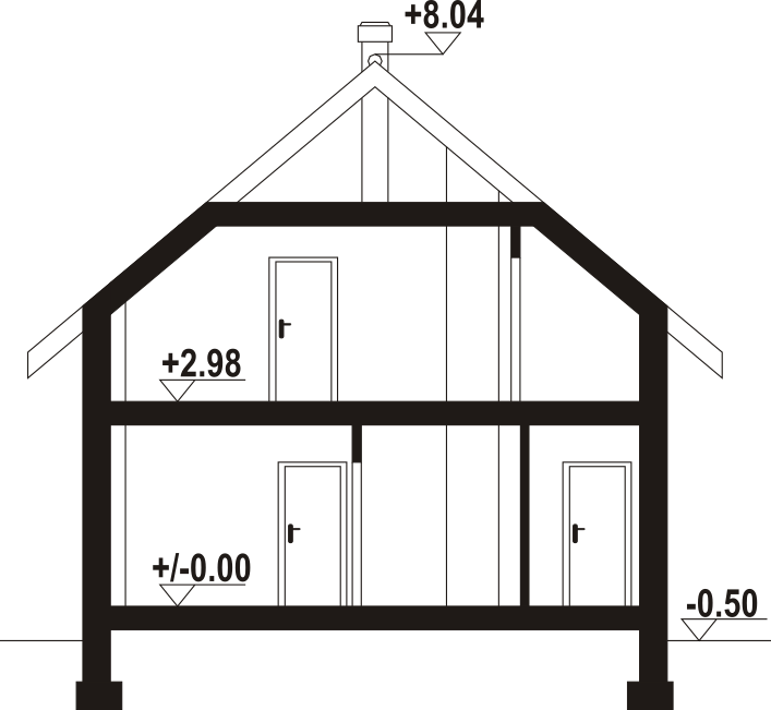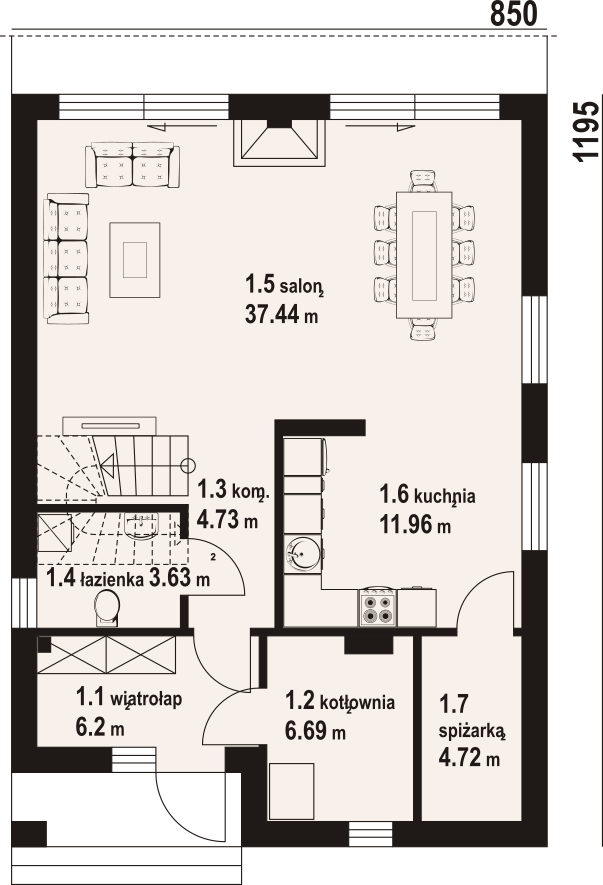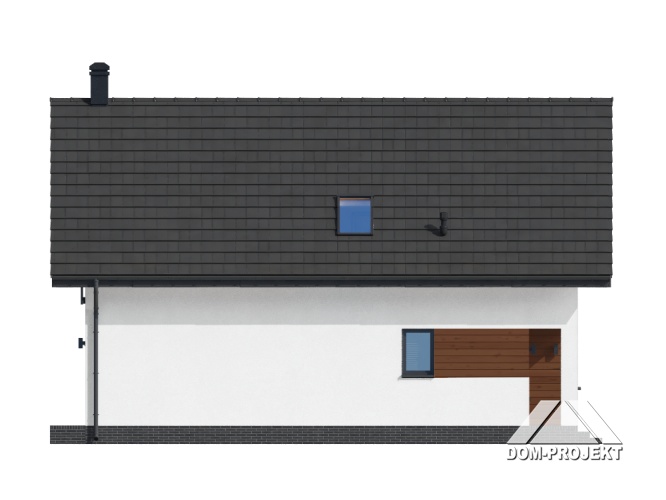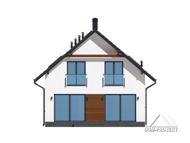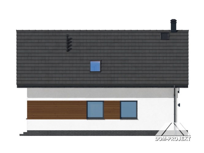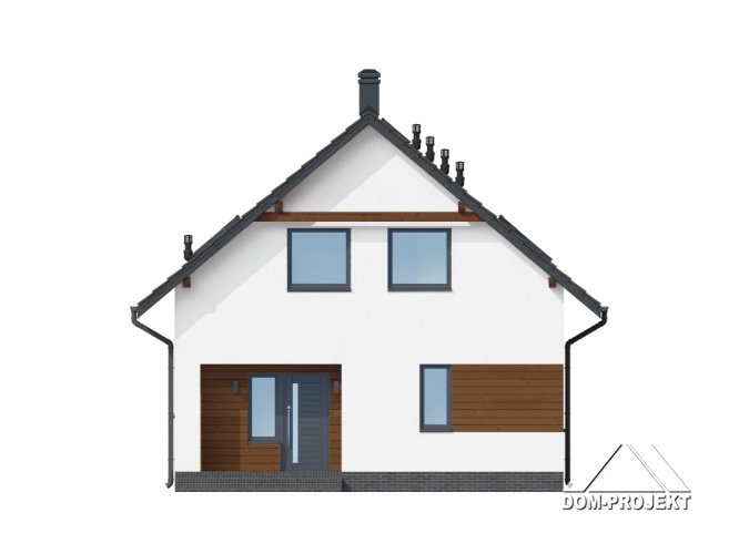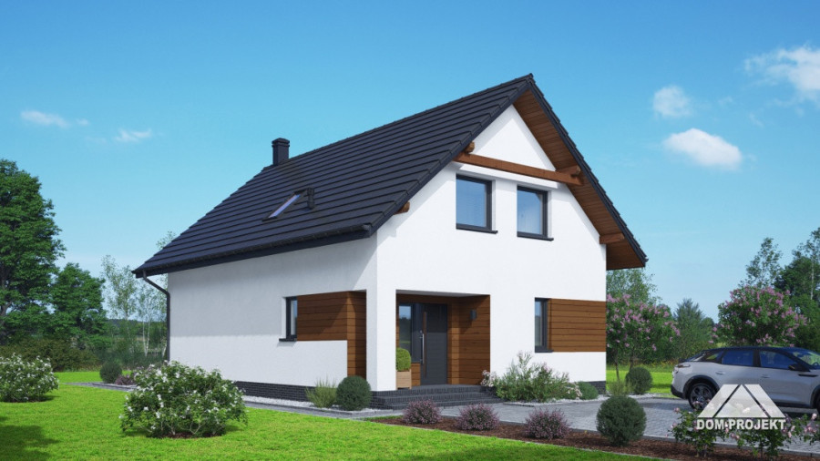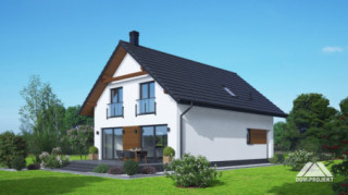 Dom z poddaszem użytkowym. Na parterze salon z kuchnią, kominkiem, wyjściem na taras i schodami na poddasze. Łazienka, wiatrołap, komunikacja, kotłownia i spiżarka. Na poddaszu trzy pokoje, garderoba, łazienka, komunikacja. Zwarta bryła budynku oraz dach dwuspadowy sprzyjają szybkiej i taniej budowie oraz niskim kosztom eksploatacji.