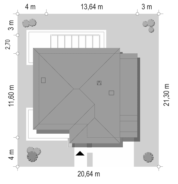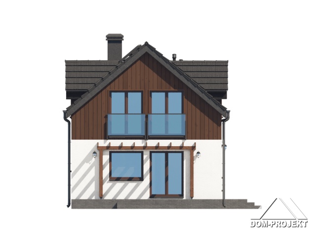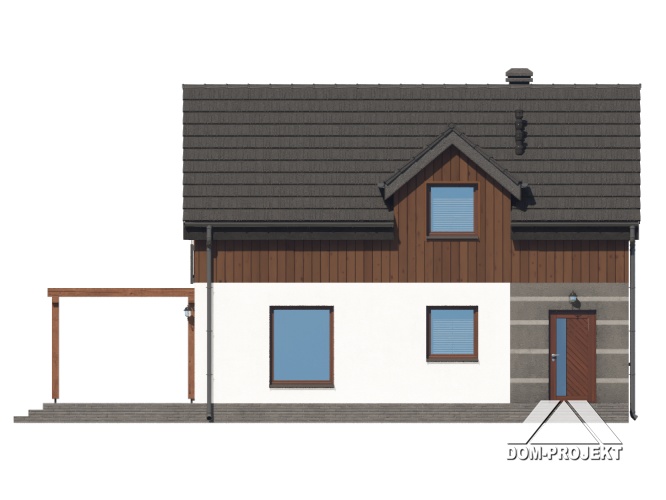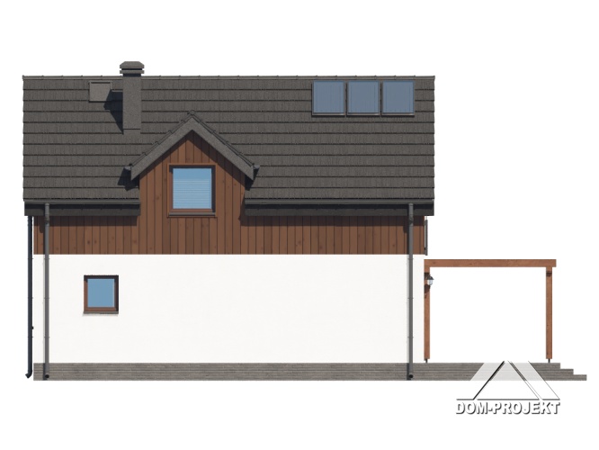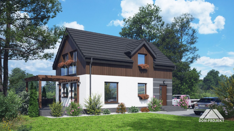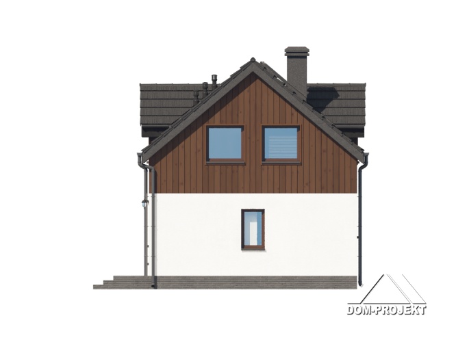 Dom z poddaszem użytkowym. Na parterze salon z aneksem kuchennym, wyjściem na taras i schodami na poddasze. Wc, komunikacja, wiatrołap. Na poddaszu cztery pokoje, łazienka, komunikacja. Zwarta bryła budynku oraz dach dwuspadowy sprzyjają szybkiej i taniej budowie oraz niskim kosztom eksploatacji.
