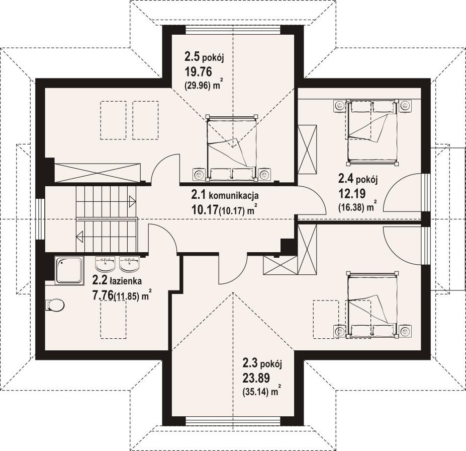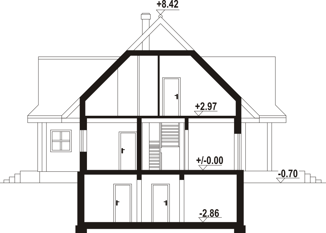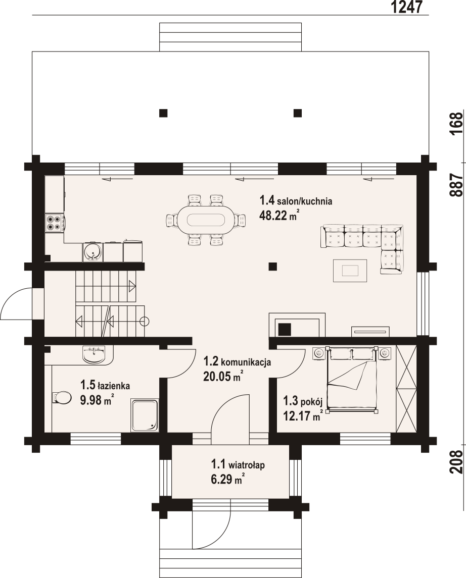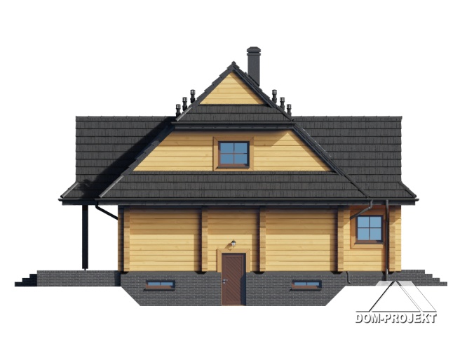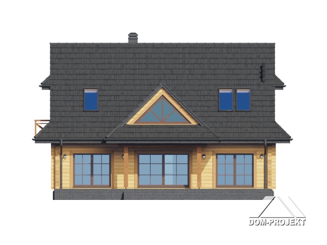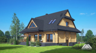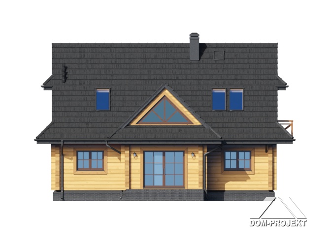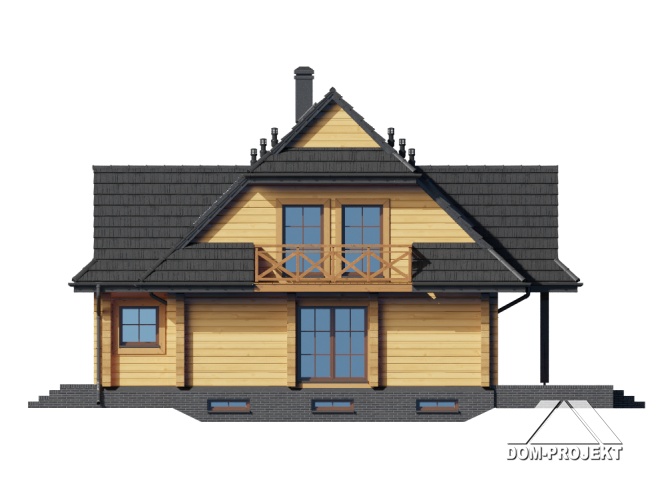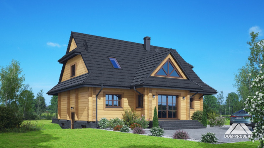 Dom z bali. Podpiwniczony. Na parterze salon z kuchnią, kominkiem oraz wyjściem na taras. Pokój, łazienka, komunikacja, wiatrołap. Na poddaszu trzy pokoje, łazienka, komunikacja. W podpiwniczeniu dwa pomieszczenia gospodarcze, pralnia, komunikacja.