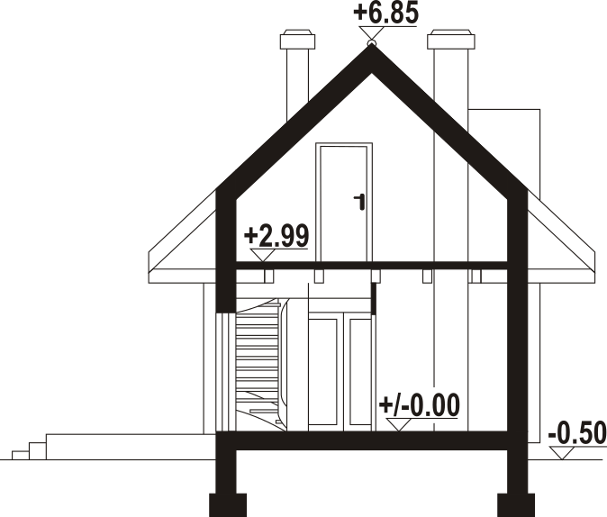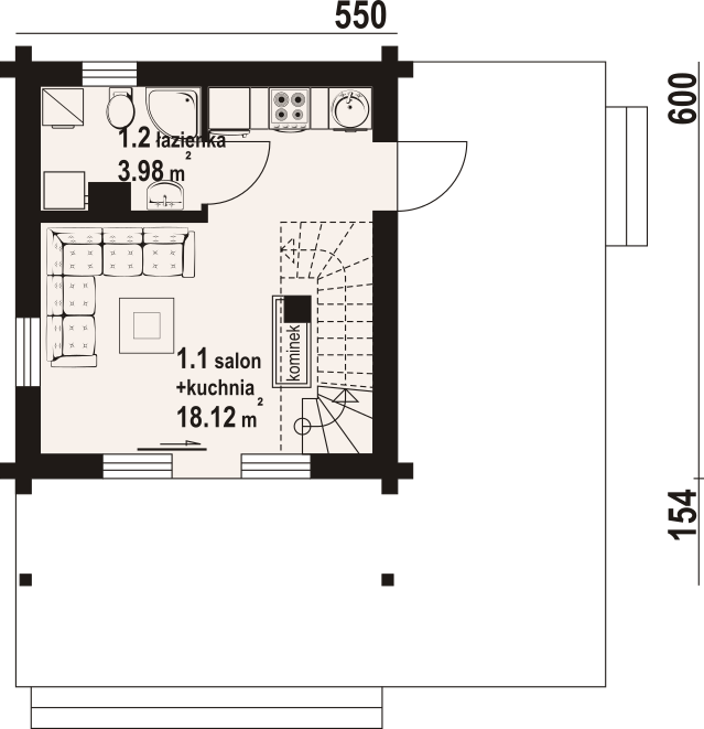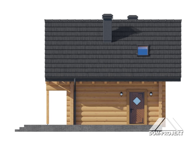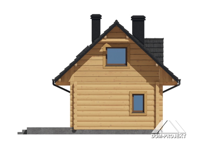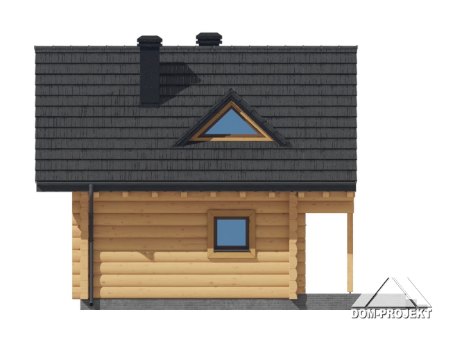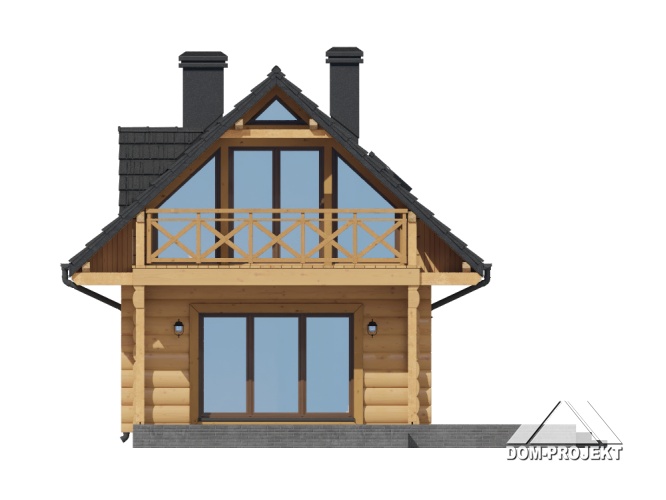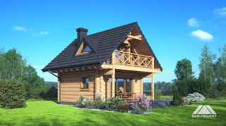 Dom z bali. Na parterze salon z aneksem kuchennym, wyjściem na taras, kominkiem i schodami na poddasze oraz łazienka. Na poddaszu dwa pokoje, komunikacja, łazienka, balkon. Zwarta bryła budynku oraz dach dwuspadowy sprzyjają szybkiej i taniej budowie oraz niskim kosztom eksploatacji.