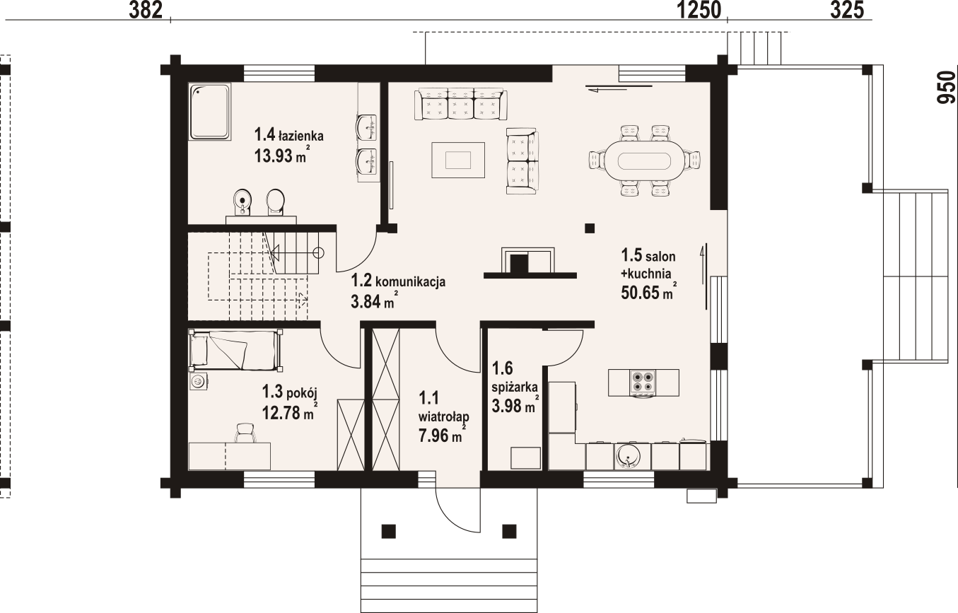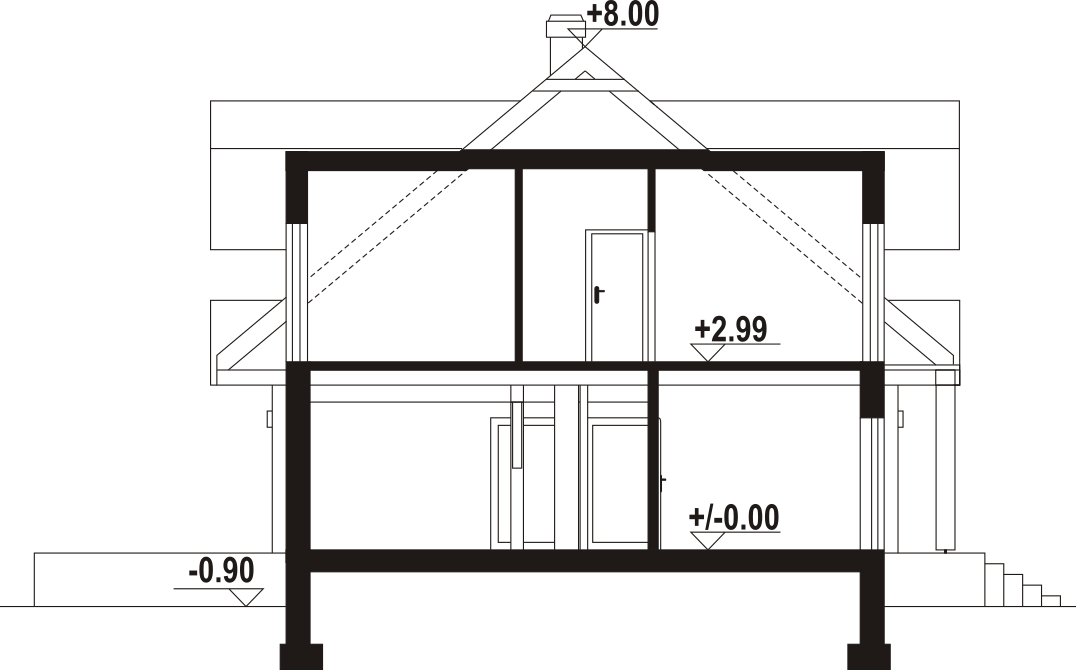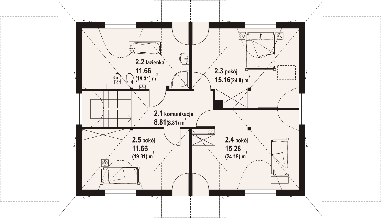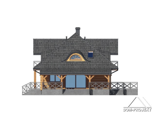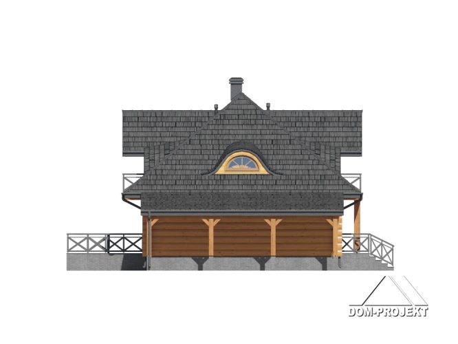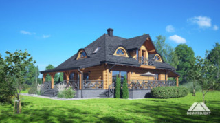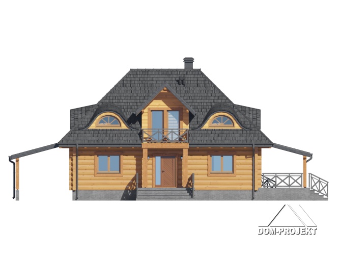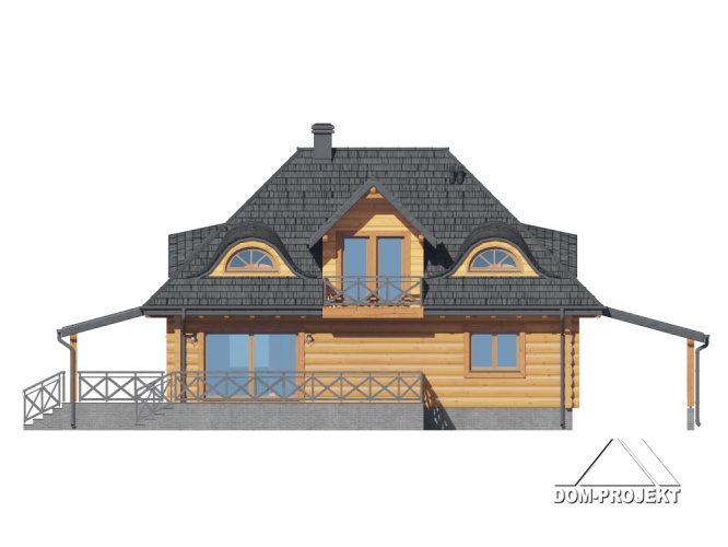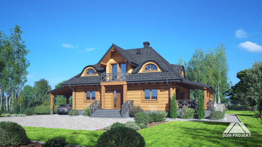 Dom z bali. Na parterze salon z kuchnią, kominkiem oraz wyjściem na duży zadaszony taras. Spiżarka, wiatrołap, komunikacja, pokój, łazienka. Z boku domu wiata na samochód. Na poddaszu trzy pokoje, łazienka, komunikacja. Dwa balkony