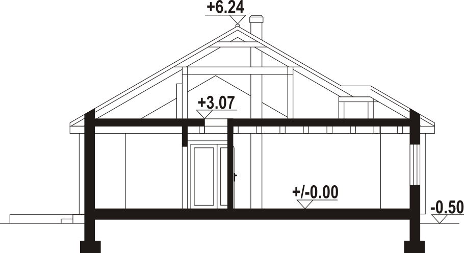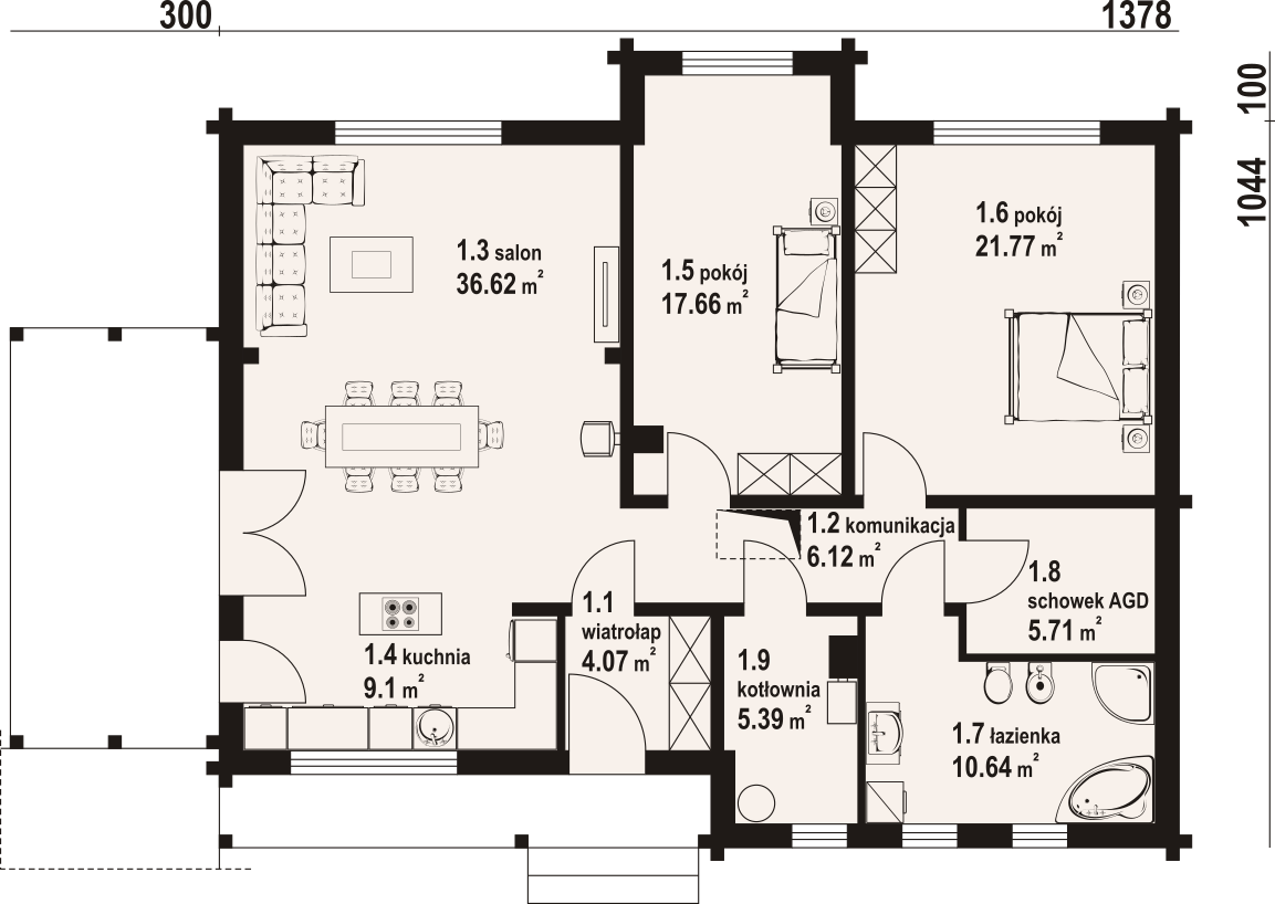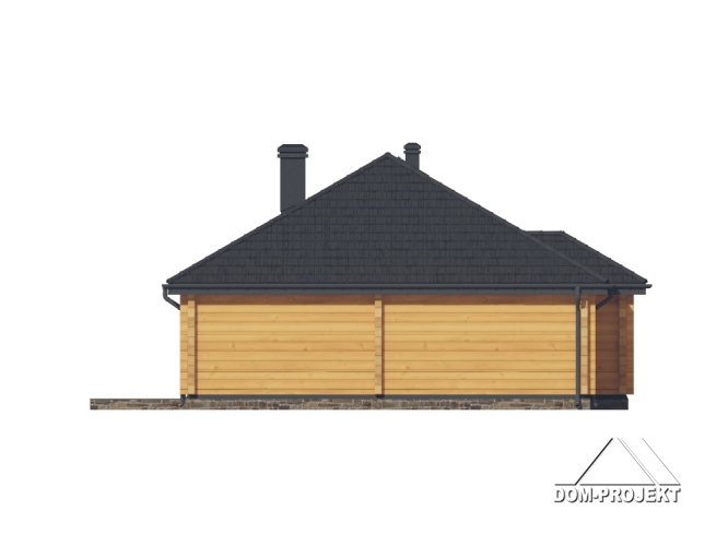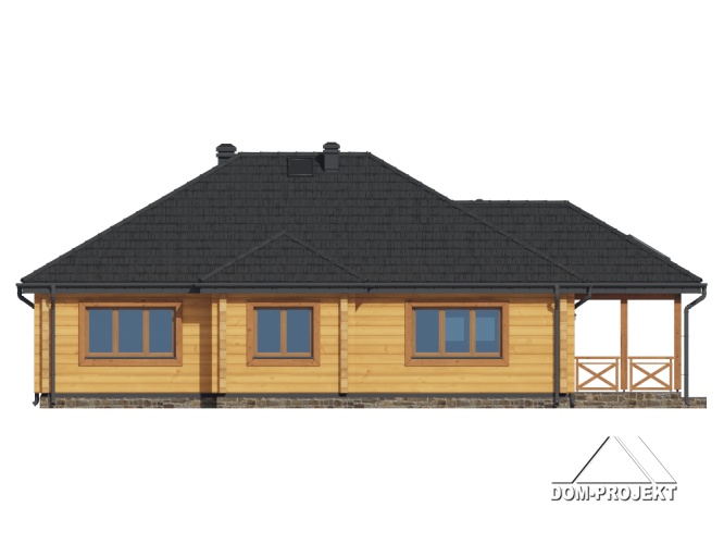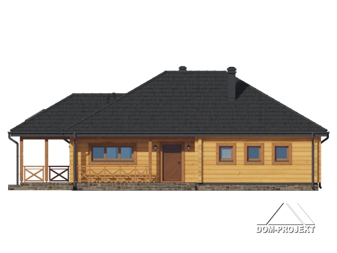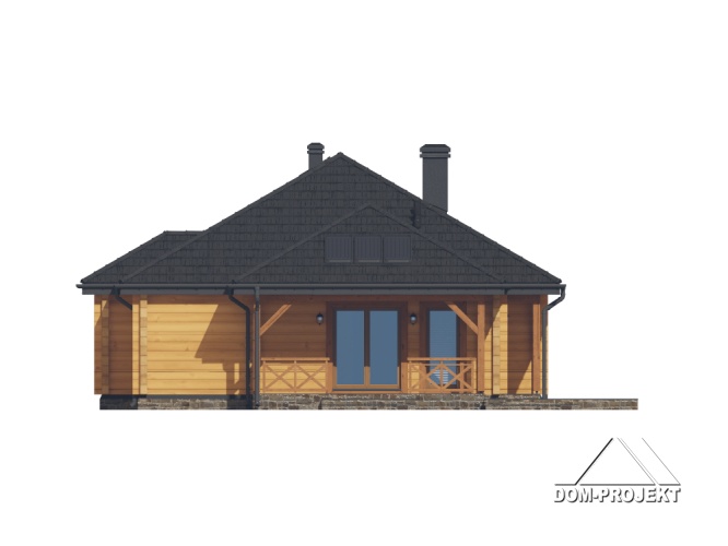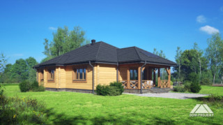 Dom z bali. Parterowy. Salon z kuchnią, kominkiem oraz wyjściem na duży, zadaszony taras. Dwa pokoje, łazienka, schowek AGD, komunikacja, kotłownia, wiatrołap. Zwarta bryła budynku sprzyja szybkiej i taniej budowie oraz niskim kosztom eksploatacji.