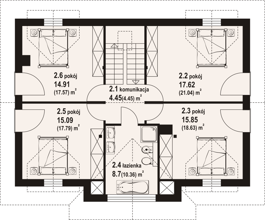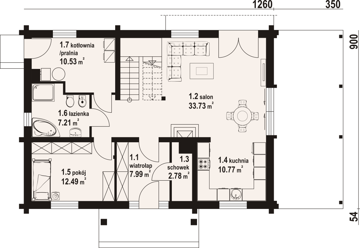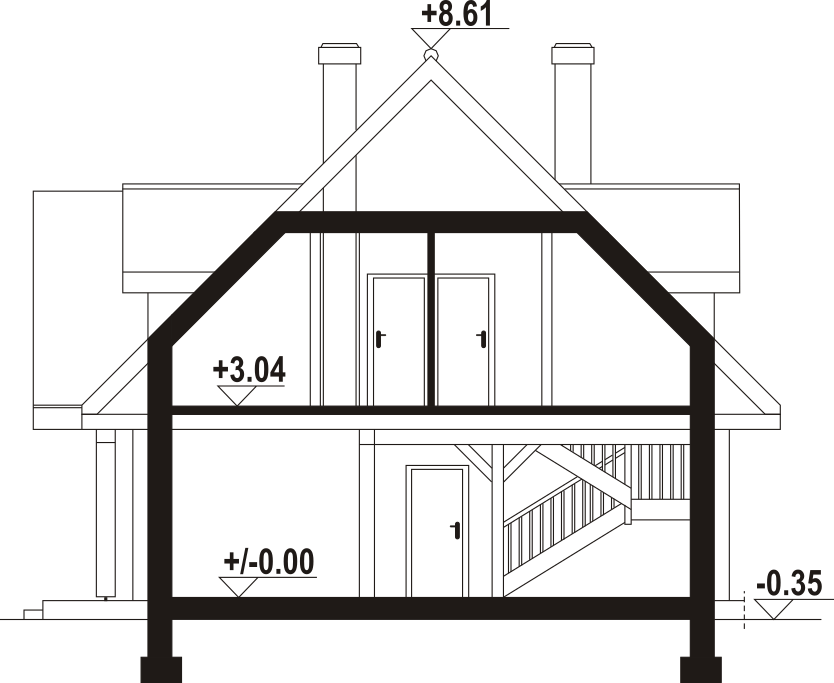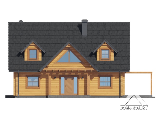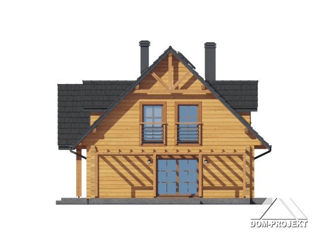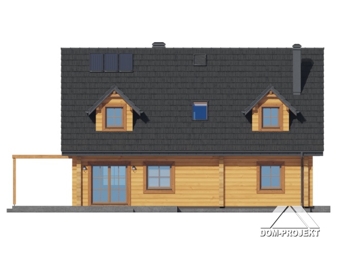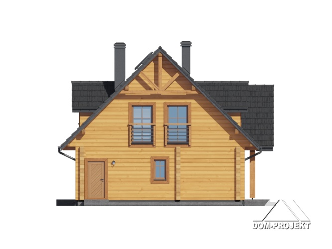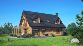 Dom z bali. Na parterze salon z kuchnią, kominkiem, wyjściem na taras i schodami na poddasze. Kotłownia z pralnią, łazienka, pokój, wiatrołap, schowek. Na poddaszu cztery pokoje, łazienka, komunikacja. Zwarta bryła budynku oraz dach dwuspadowy sprzyjają szybkiej i taniej budowie oraz niskim kosztom eksploatacji.