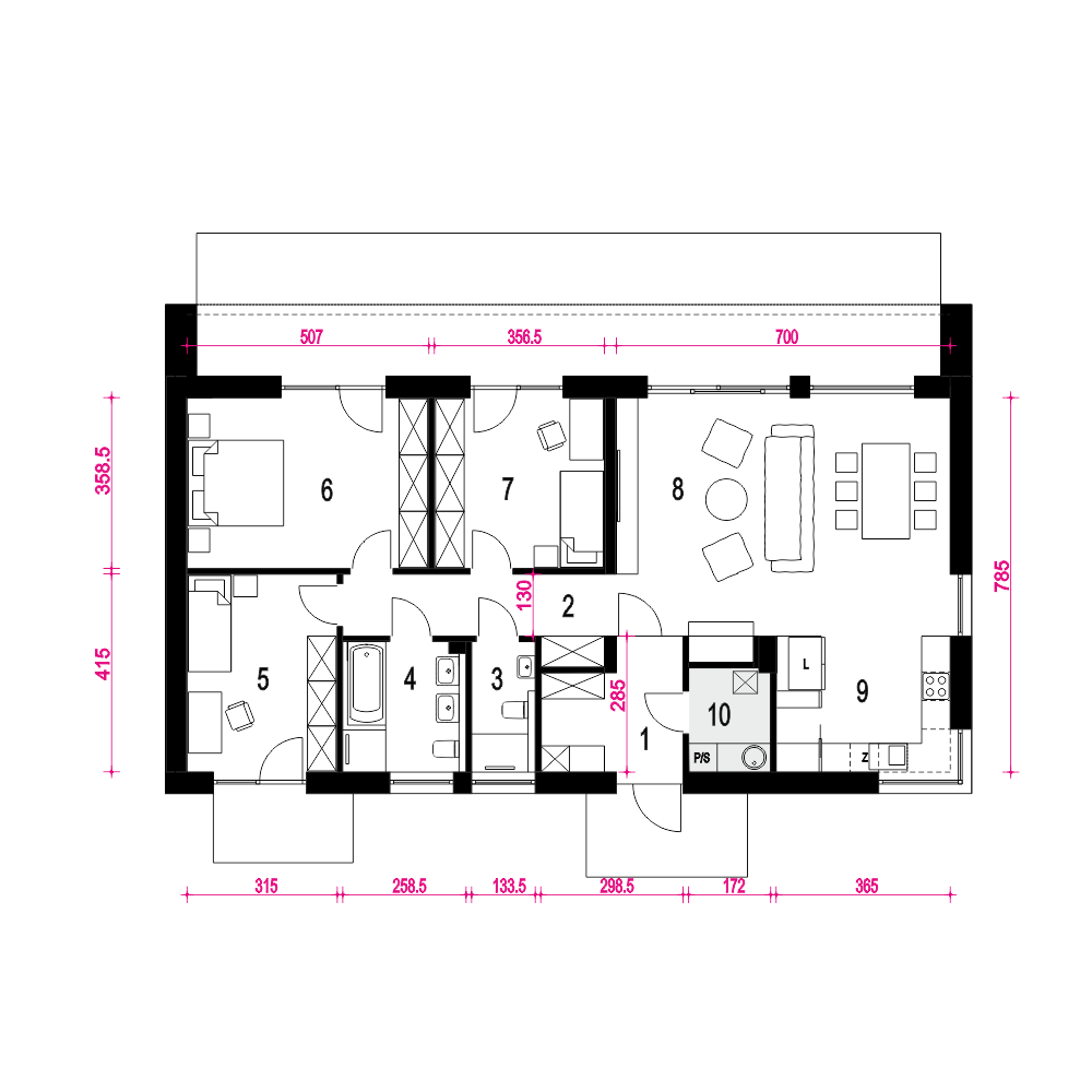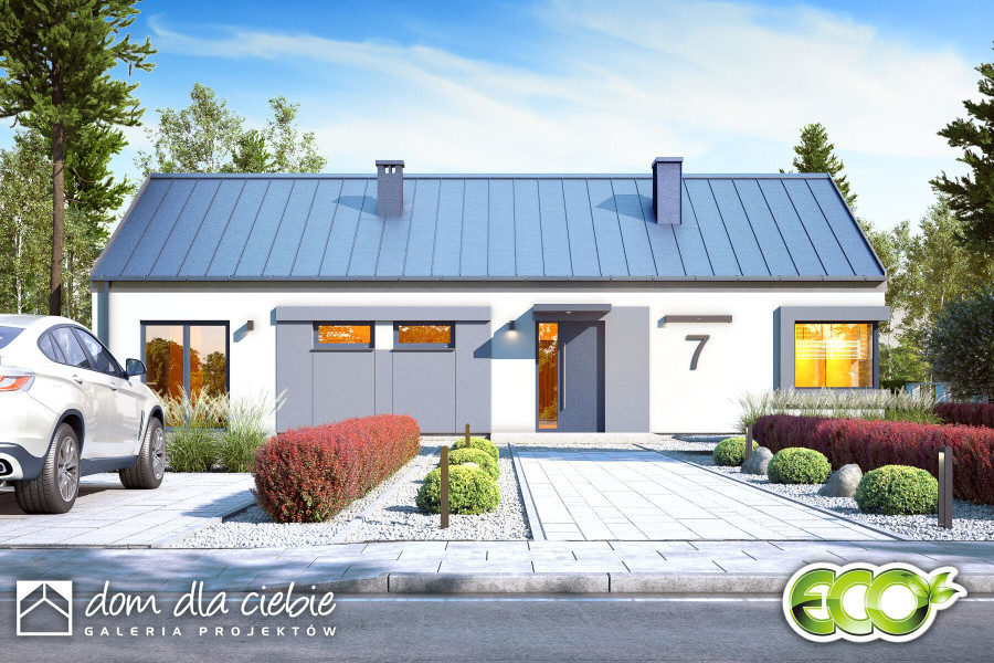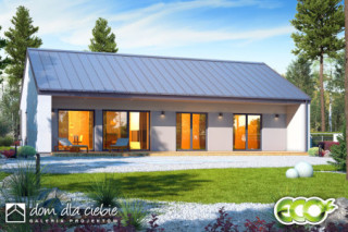 Hyzop bez garażu to projekt nowoczesnego domu parterowego, typu stodoła, przeznaczonego dla 4 do 5cio osobowej rodziny. Zaprojektowany jest w technologii murowanej z prefabrykowaną więźbą dachową, przekryty dwuspadowym dachem. Hyzop to funkcjonalny projekt domu parterowego, łączący strefę ogólnodostępną i prywatną na jednym poziomie. W części wejściowej mamy przewidziany wygodny wiatrołap z szafami wnękowymi i pralnię z c.o. W części ogólnodostępnej mamy przewidziany przestronny i dobrze doświetlony salon z miejscem na wygodny stół jadalniany z widokiem na ogród. Dzięki dużym drzwiom tarasowym od strony ogrodowej, dostaniemy się wprost na zewnętrzny zadaszony taras - zadaszenie tarasu przewidziane jest na całe długości domu. W części ogólnodostępnej projekt przewiduje również wygodną kuchnię z wyspą i lodówką side by side oraz łazienkę dostępną z korytarza. W części prywatnej mamy do dyspozycji trzy pokoje sypialne i wspólną łazienkę z wanną i prysznicem. Hyzop to atrakcyjna propozycja projektu domu energooszczędnego, o nowoczesnym wyglądzie. To projekt domu z serii "eco" - ekonomiczny w budowie i w utrzymaniu - idealna propozycja dla rodzin planujących budowę pierwszego domu.fundamenty: BETONOWE ściany zewnętrzne: POROTHERM+STYROPIAN TERMO ORGANIKA rodzaj stropu i konstrukcja dachu: wiązary prefabrykowane MITEK elewacje: TYNK STRUKTURALNY pokrycie dachu: BLACHA