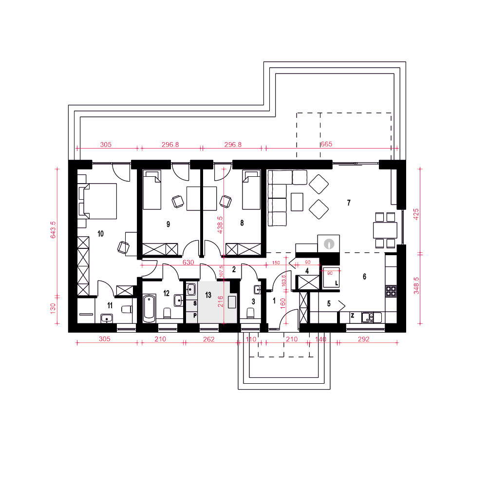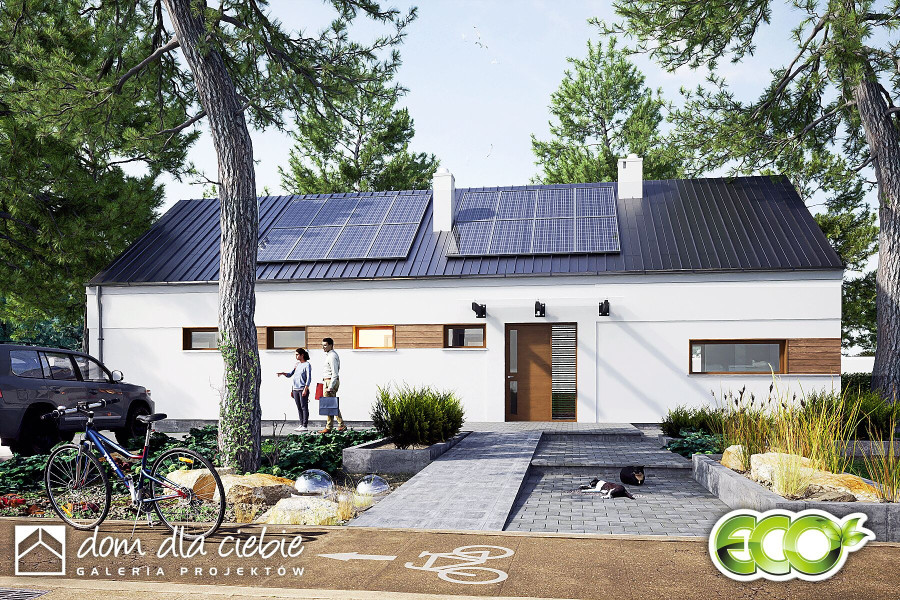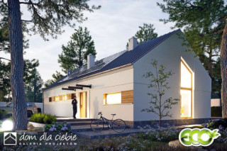 Złota to mały, nowoczesny, parterowy dom dla 4 osobowej rodziny. Dom w tradycyjnej technologii z dachem z prefabrykowanych wiązarów. Strop stanowi dolny drewniany pas konstrukcji wiązarów dachowej. Istnieje możliwość wykonania klasycznej więźby dachowej i stropu gęstotożebrowego. Dach jest dwuspadowy o kącie nachylenia 35 stopni. Wspólna przestrzeń składa się z wysokiego salonu z kominkiem, kuchni ze spiżarnią oraz jadalni. W prywatnej strefie domu znajdują się dwie mniejsze sypialnie i duża sypialnia z łazienką i miejscem na szafy. W strefie nocnej przewidziano łazienkę ogólną, niewielkie WC oraz pomieszczenie technicznym (pralnia , suszarnia) z piecem CO. Elewacja budynku utrzymana w kolorze białym z elementami drewna. Złota to bardzo dobra inwestycją finansową.