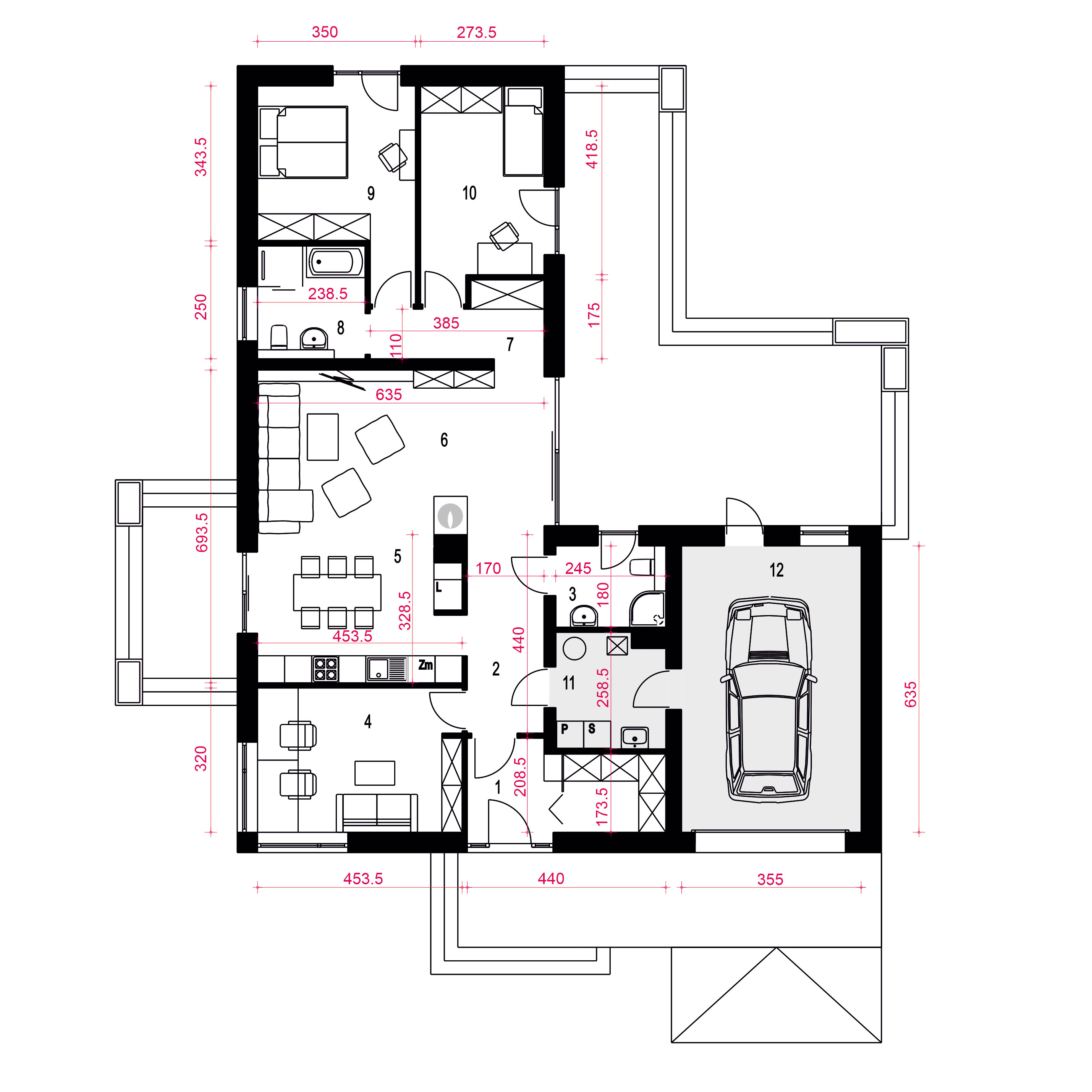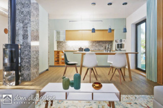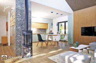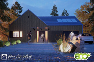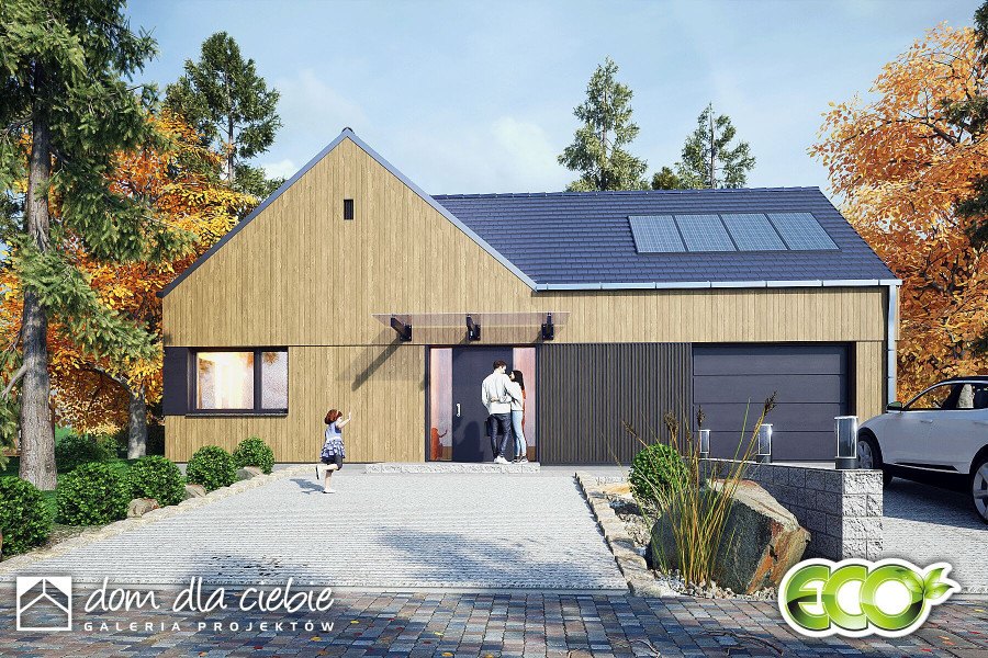 Słoneczna to nowoczesny dom dla 3-4 osobowej rodziny, z tradycyjnymi murowanymi ścianami i prefabrykowanymi, drewnianymi wiązarami dachowymi. Bryła budynku tworzy literę L. Wejście od frontu prowadzi do wiatrołapu z garderobą, a następnie do holu. Pokój-gabinet, mała łazienka, pomieszczenie techniczne i kuchnia z jadalnią i salonem są dostępne z holu. Część prywatna obejmuje dwie sypialnie i dużą łazienkę. Strefa dziennej przestrzeni jest otwarta po dach, a z jadalni i salonu można bezpośrednio wyjść na tarasy, łącząc wnętrze z otoczeniem. Pomieszczenie techniczne prowadzi do obszernego garażu, a mała łazienka z drzwiami tarasowymi umożliwia korzystanie z niej w letnie dni. Elewacja w minimalistycznym stylu łączy drewno z antracytowymi wstawkami, a ciemnoszary dach nadaje domowi charakteru. Słoneczna spełnia nowoczesne potrzeby życia, otaczając mieszkańców przytulnym ogrodowym dziedzińcem.