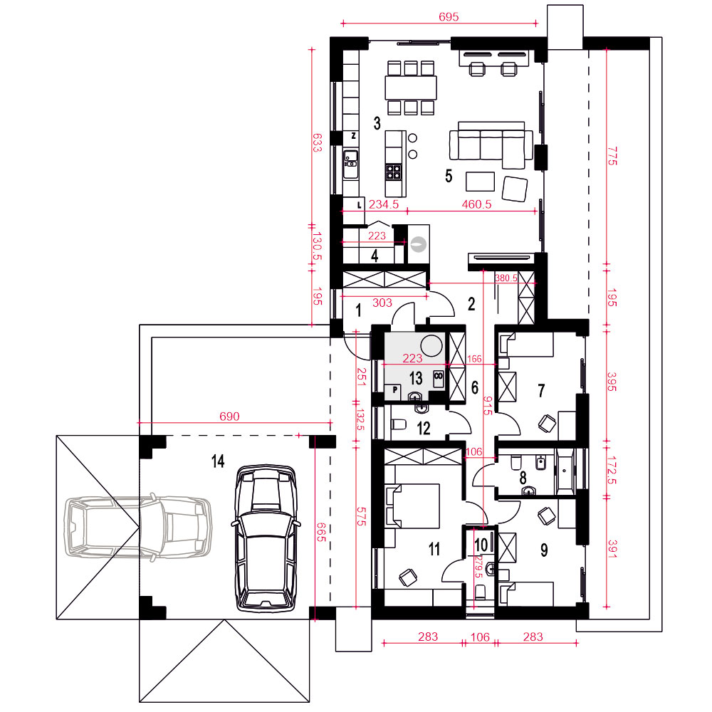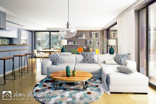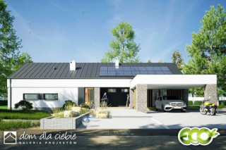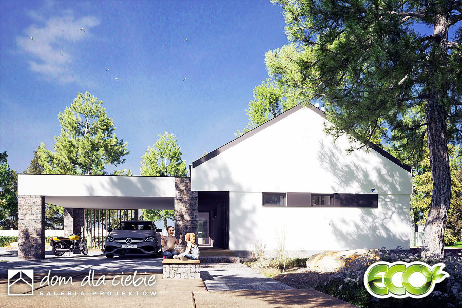 Kalia z wiatą to nowoczesny, modny dom parterowy dla czteroosobowej rodziny. Wykonany z tradycyjnych materiałów budowlanych, z murowanymi ścianami i prefabrykowanymi wiązarami dachowymi. Wnętrze składa się z przestronnego salonu z kominkiem, kuchni, jadalni i przestronnej strefy wspólnej z dużymi oknami wpuszczającymi naturalne światło. Przez korytarz można dostać się do trzech sypialni, z dwiema z nich mającymi wyjście na taras ogrodowy. W strefie prywatnej znajduje się sypialnia z garderobą i łazienką. Elewacja w kolorze białym i ciemnoszarym, z wyróżnionymi wnękami. Kalia to idealny dom dla nowoczesnej rodziny, łączący komfort mieszkalny z atrakcyjną inwestycją finansową. Dojście i dojazd do budynku może realizować się z dwóch stron.