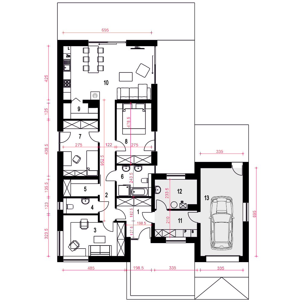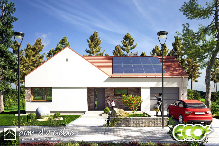 Pleszka to prosty i nowoczesny dom dla 3-4 osobowej rodziny. Dom jest parterowy, z otwartą przestrzenią dzienną i garażem. Budynek jest wykonany z tradycyjnych materiałów, takich jak murowane ściany i drewniane wiązary dachowe. Dach o nachyleniu 35 stopni ma kształt litery L. Dom jest utrzymany w jasnych kolorach. Jest to świetna inwestycja dla rodziny, która szuka funkcjonalnego i stylowego domu.fundamenty: BETONOWE ściany zewnętrzne: POROTHERM+STYROPIAN TERMO ORGANIKA rodzaj stropu i konstrukcja dachu: wiązary prefabrykowane MITEK elewacje: TYNK STRUKTURALNY pokrycie dachu: CERAMIKA