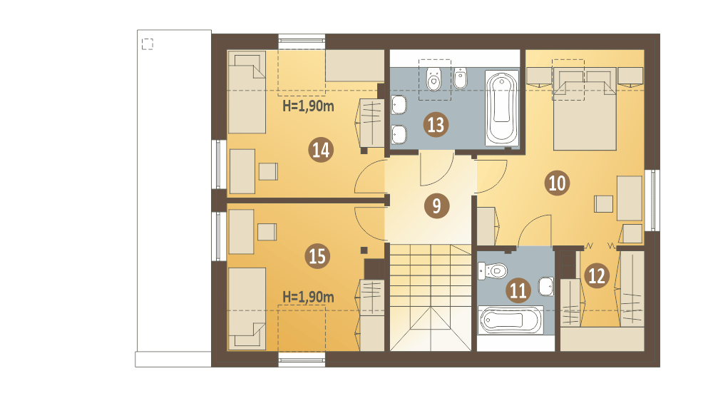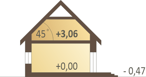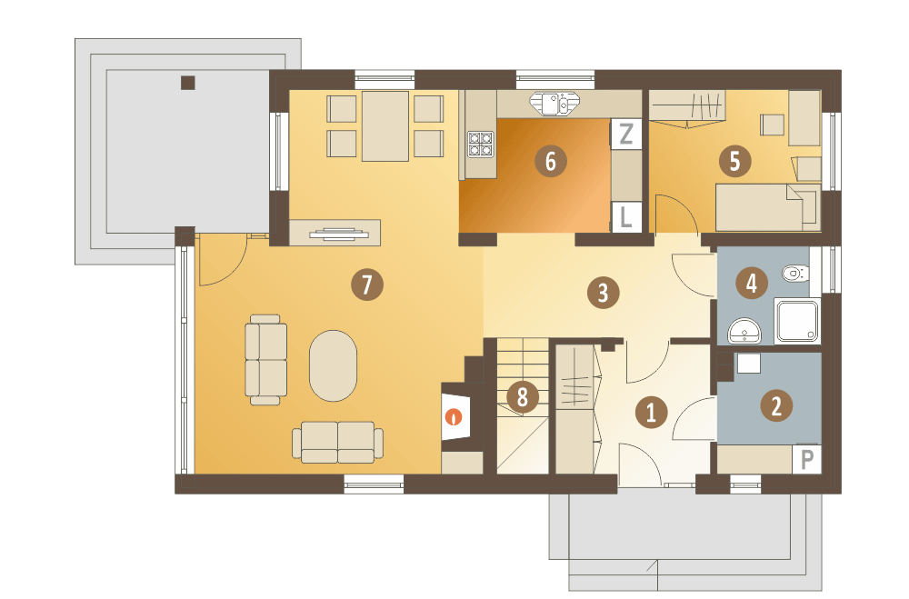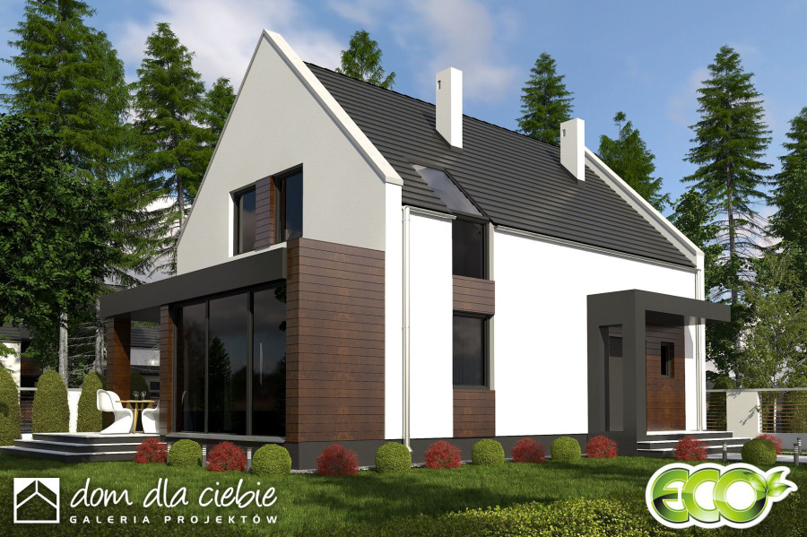 Nowoczesny projekt małego domu jednorodzinnego z charakterystycznym przeszkleniem w salonie.