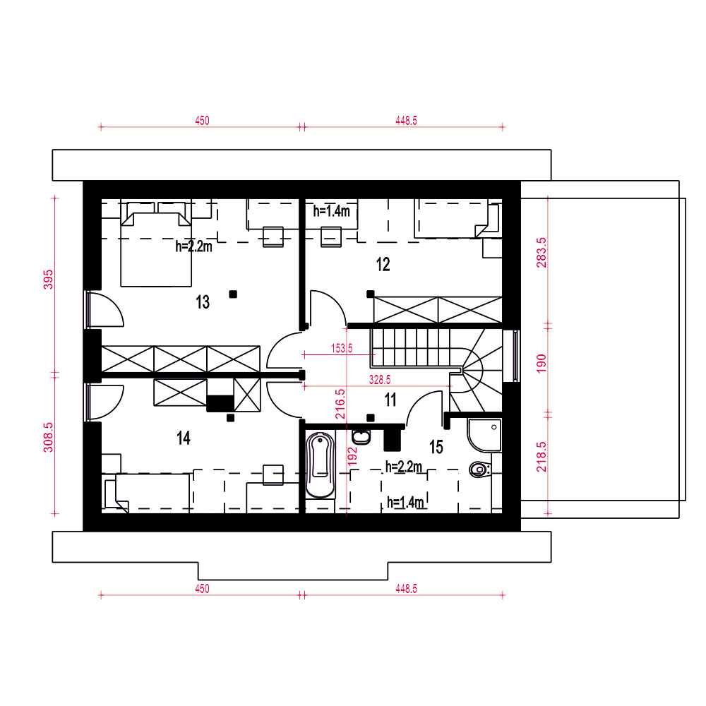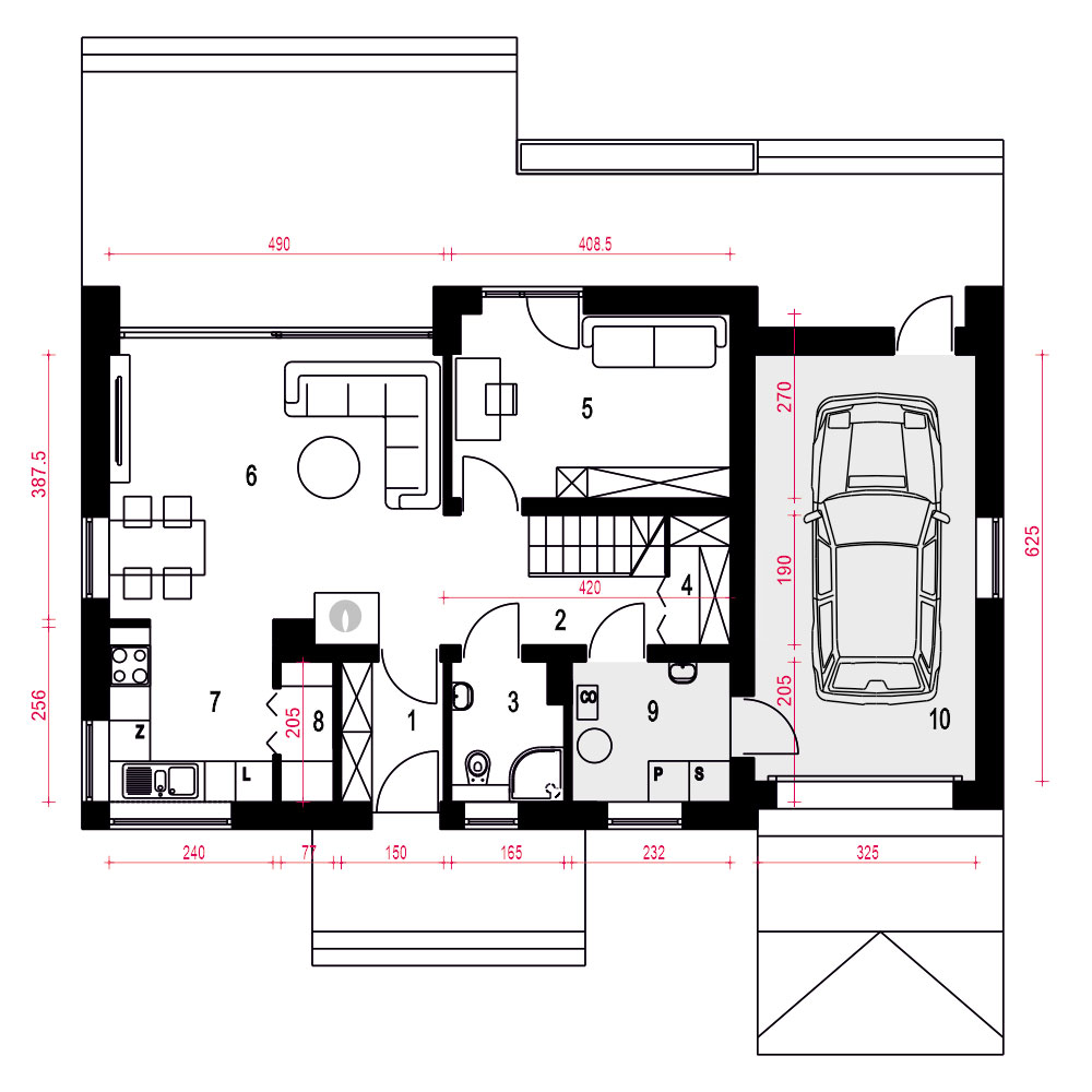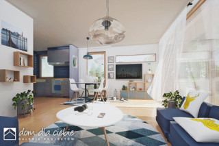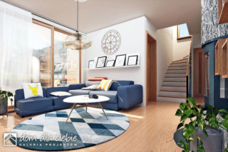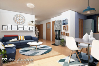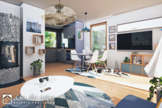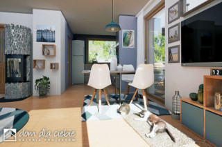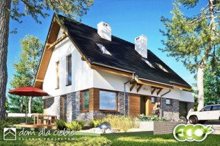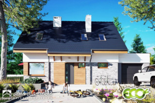 Morwa z garażem to projekt niewielkiego ekonomicznego domu jednorodzinnego z dwuspadowym dachem ustawionym kalenicowo w stosunku do elewacji frontowej. Przewidziany został dla czteroosobowej rodzinie. Zadaszone wejście, prowadzi do wiatrołapu, gdzie znajdują się szafy. i dalej do części dziennej. Do salonu przylega funkcjonalny gabinet. Kuchnia jest otwarta i posiada spiżarnię. W centralnej części domu znajduje się kominek. Z salonu można wyjść na zewnętrzny taras. Obok kuchni przewidziano miejsce na stół. Z holu można się dostać do niewielkiej łazienki i pomieszczenia technicznego z piecem CO, pralką i suszarką. Pod biegiem schodowym zaprojektowano niewielką garderobę. Z holu prowadzą wygodne schody na poddasze, są tu trzy wygodne sypialnie oraz wspólną łazienkę Ten projekt to propozycja ekonomicznego i ekologicznego domu.