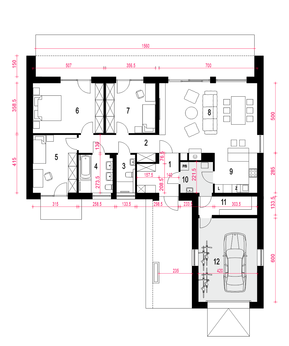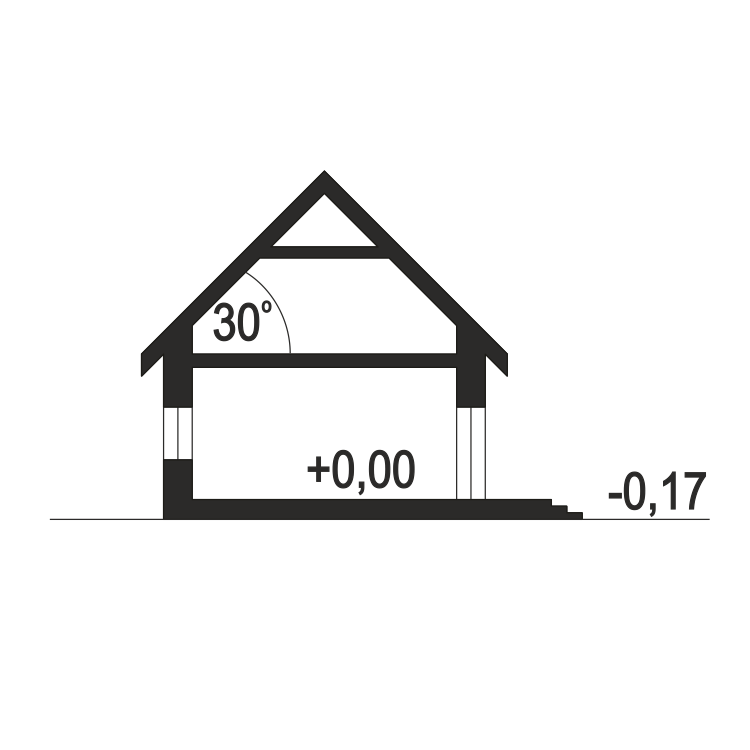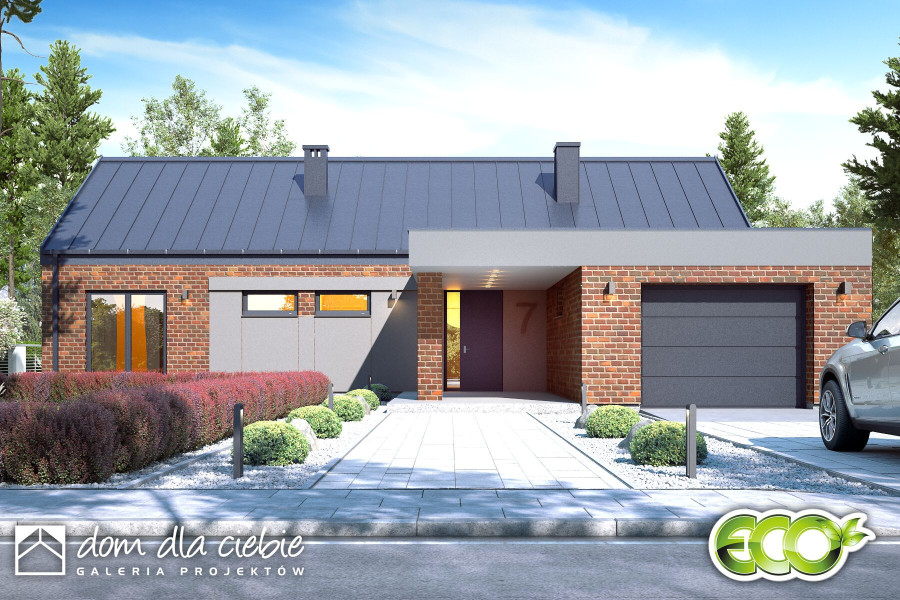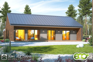Hyzop II z garażem jednostanowiskowym, to projekt nowoczesnego domu parterowego, typu stodoła, przeznaczonego dla 4 do 5cio osobowej rodziny. Zaprojektowany jest w technologii murowanej z prefabrykowaną więźbą dachową, przekryty dwuspadowym dachem. Hyzop II to funkcjonalny projekt domu parterowego, łączący strefę ogólnodostępną i prywatną na jednym poziomie. W części wejściowej mamy przewidziany wygodny wiatrołap z szafami wnękowymi i pralnię z c.o. W części ogólnodostępnej mamy przewidziany przestronny i dobrze doświetlony salon z miejscem na wygodny stół jadalniany z widokiem na ogród. Dzięki dużym drzwiom tarasowym od strony ogrodowej, dostaniemy się wprost na zewnętrzny zadaszony taras - zadaszenie tarasu przewidziane jest na całe długości domu. W części ogólnodostępnej projekt przewiduje również wygodną kuchnię ze spiżarnią z której mamy dostęp do garażu.. W części prywatnej mamy do dyspozycji trzy pokoje sypialne i wspólną łazienkę z wanną i prysznicem. Hyzop II to atrakcyjna propozycja projektu domu energooszczędnego, o nowoczesnym wyglądzie. To projekt domu z serii "eco" - ekonomiczny w budowie i w utrzymaniu - idealna propozycja dla rodzin planujących budowę pierwszego domu.fundamenty: BETONOWE ściany zewnętrzne: POROTHERM+STYROPIAN TERMO ORGANIKA rodzaj stropu i konstrukcja dachu: wiązary prefabrykowane MITEK elewacje: OKŁADZINA KLINKIEROWA, TYNK STRUKTURALNY pokrycie dachu: BLACHA