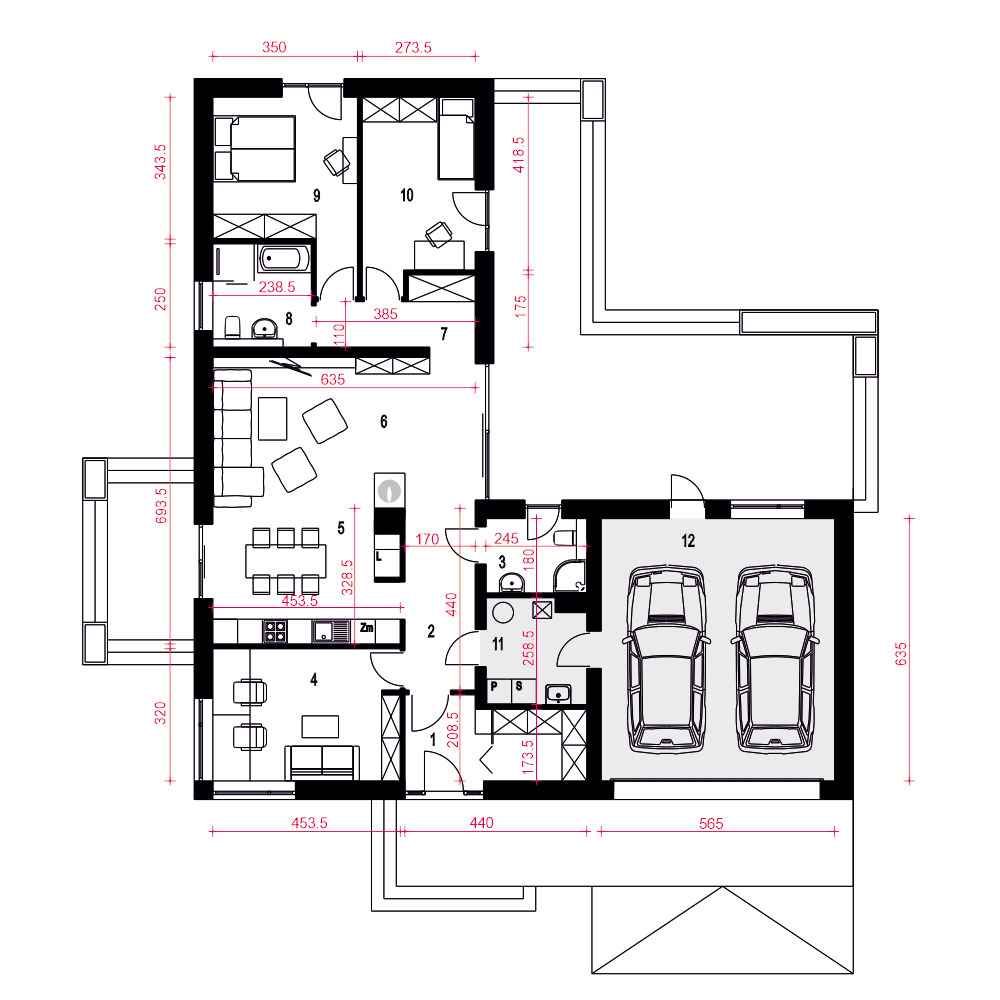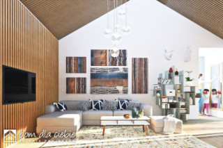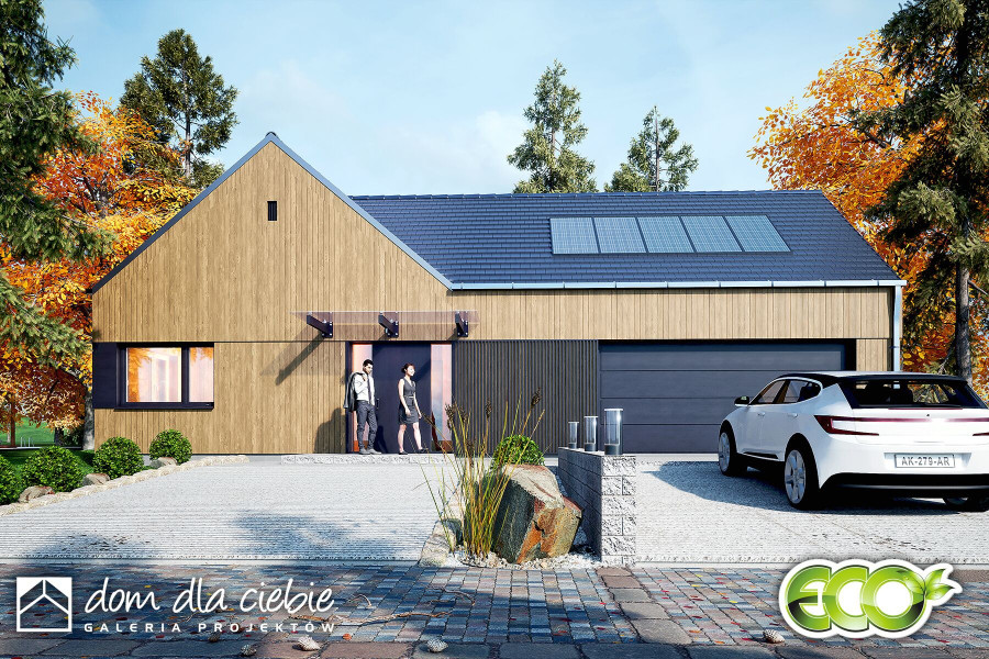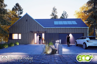 Słoneczna to nowoczesny dom dla 3-4 osobowej rodziny, z tradycyjnymi murowanymi ścianami i prefabrykowanymi, drewnianymi wiązarami dachowymi. Bryła budynku tworzy literę L. Wejście od frontu prowadzi do wiatrołapu z garderobą, a następnie do holu. Pokój-gabinet, mała łazienka, pomieszczenie techniczne i kuchnia z jadalnią i salonem są dostępne z holu. Część prywatna obejmuje dwie sypialnie i dużą łazienkę. Strefa dziennej przestrzeni jest otwarta po dach, a z jadalni i salonu można bezpośrednio wyjść na tarasy, łącząc wnętrze z otoczeniem. Pomieszczenie techniczne prowadzi do obszernego garażu, a mała łazienka z drzwiami tarasowymi umożliwia korzystanie z niej w letnie dni. Elewacja w minimalistycznym stylu łączy drewno z antracytowymi wstawkami, a ciemnoszary dach nadaje domowi charakteru. Słoneczna spełnia nowoczesne potrzeby życia, otaczając mieszkańców przytulnym ogrodowym dziedzińcem.fundamenty: BETONOWE ściany zewnętrzne: POROTHERM+STYROPIAN TERMO ORGANIKA ściany wewnętrzne: POROTHERM rodzaj stropu: DREWNIANY, MITEK elewacje: TYNK STRUKTURALNY, CEGŁA KLINKIEROWA pokrycie dachu: DACHÓWKA CERAMICZNA