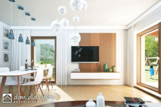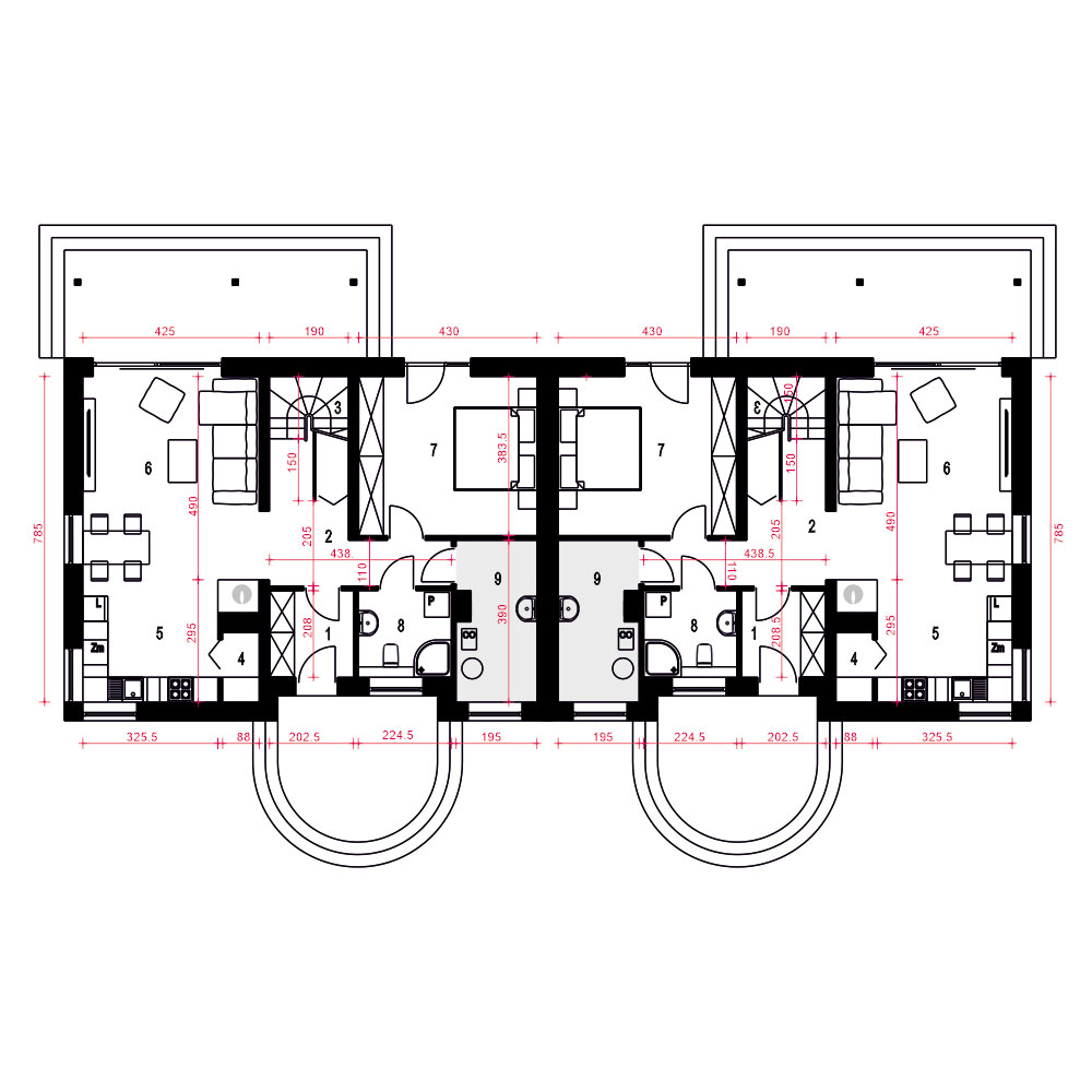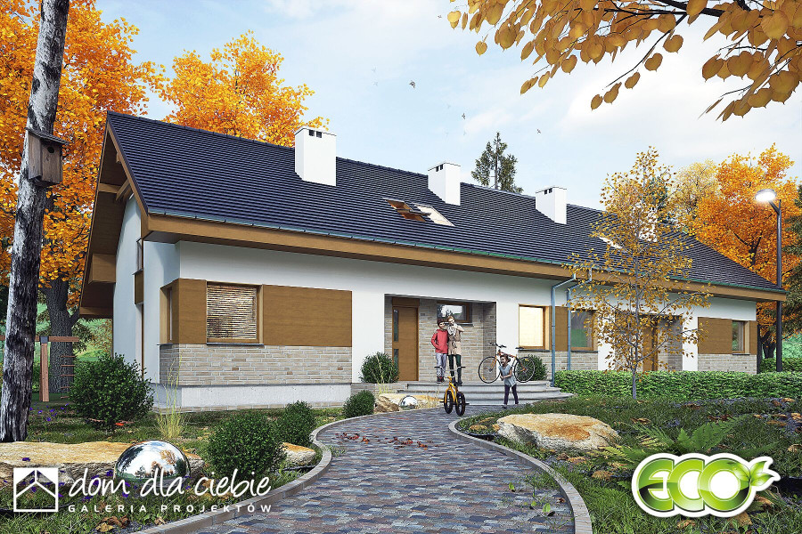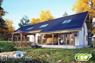(Uwaga: projekty typu bliźniak oferujemy jako domy dwulokalowe, projekt można zamówić również w zabudowie bliźniaczej) Poniższy opis odnosi sie do jednego segmentu: Paprotka to projekt oszczędnego domu z dwuspadowym dachem, idealnego dla czteroosobowej rodziny. Główne wejście prowadzi do wiatrołapu z praktycznymi szafami, a stamtąd do holu ze schodami, który dzieli przestrzeń na sypialnię i część dzienną. Obok schodów znajduje się funkcjonalna sypialnia dwuosobowa, a naprzeciwko - niewielka łazienka z prysznicem i pralką. Dalej korytarzem mamy dostęp do pomieszczenia technicznego. Strefa dzienna obejmuje salon z kuchnią i jadalnią. Przy kuchni zlokalizowano użyteczną spiżarnię oraz kominek, a salon łączy się z ogrodem poprzez zadaszony taras. W centralnej części tej strefy znajduje się miejsce na jadalnię. Wygodne schody prowadzą na poddasze, gdzie umieszczono dwie duże sypialnie z garderobami oraz wspólną łazienkę. Pod schodami przewidziano praktyczną garderobę. Ten projekt reprezentuje propozycję ekonomicznego i ekologicznego domu, doskonale nadającego się do zamieszkania przez cały rok, ze względu na uniwersalną architekturę.