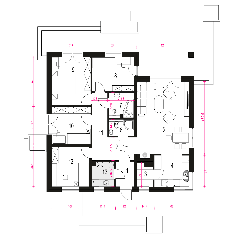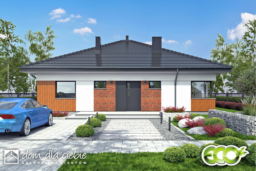 Kalcyt III - parterowy dom z 4 sypialniami.fundamenty: BETONOWE ściany zewnętrzne: POROTHERM+STYROPIAN TERMO ORGANIKA ściany wewnętrzne: POROTHERM rodzaj stropu i konstrukcja dachu:: wiązary prefabrykowane MITEK elewacje: TYNK STRUKTURALNY, OKŁ. KLINKIEROWA pokrycie dachu: DACHÓWKA CERAMICZNA
