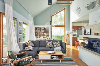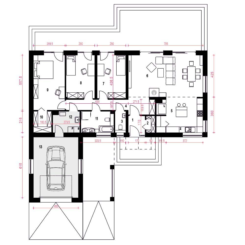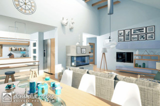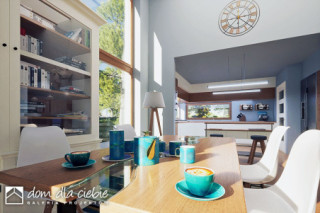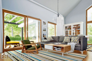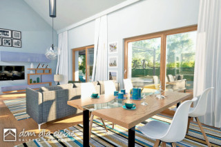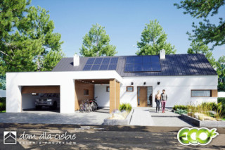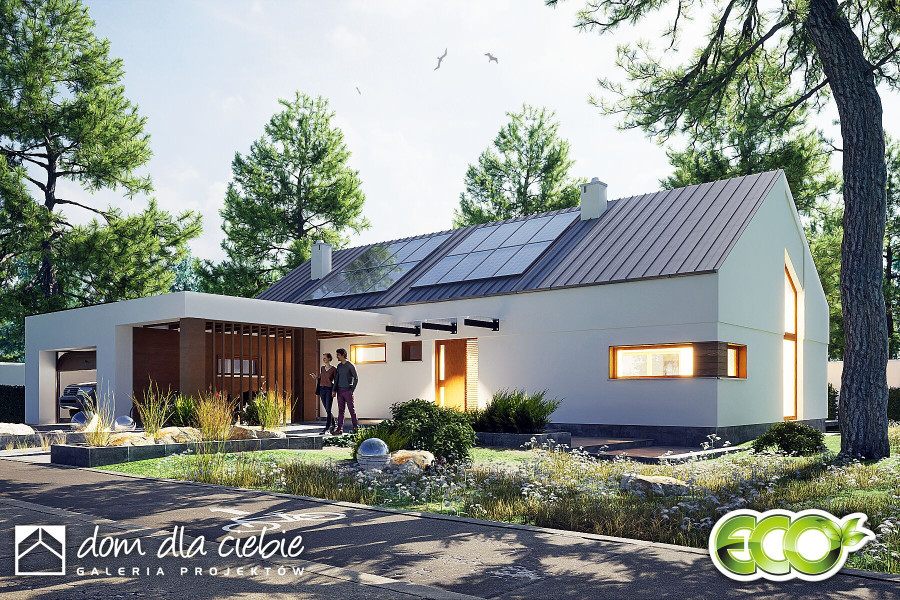 Złota II to nowoczesny, parterowy dom z wiatą i garażem dla 4 osobowej rodziny. Dom w tradycyjnej technologii z dachem z prefabrykowanych wiązarów. Strop stanowi dolny drewniany pas konstrukcji wiązarów dachowej. Istnieje możliwość wykonania klasycznej więźby dachowej i stropu gęstotożebrowego. Dach jest dwuspadowy o kącie nachylenia 35 stopni. Wspólna przestrzeń składa się z wysokiego salonu z kominkiem, kuchni ze spiżarnią oraz jadalni. W prywatnej strefie domu znajdują się dwie mniejsze sypialnie i duża sypialnia z garderobą. W strefie nocnej przewidziano łazienkę ogólną, niewielkie WC oraz pomieszczenie technicznym (pralnia , suszarnia) z piecem CO. Elewacja budynku utrzymana w kolorze białym z elementami drewna. Złota II to bardzo dobra inwestycją finansową.fundamenty: BETONOWE ściany zewnętrzne: POROTHERM+STYROPIAN TERMO ORGANIKA rodzaj stropu i konstrukcja dachu: wiązary prefabrykowane MITEK elewacje: TYNK STRUKTURALNY pokrycie dachu: BLACHA
