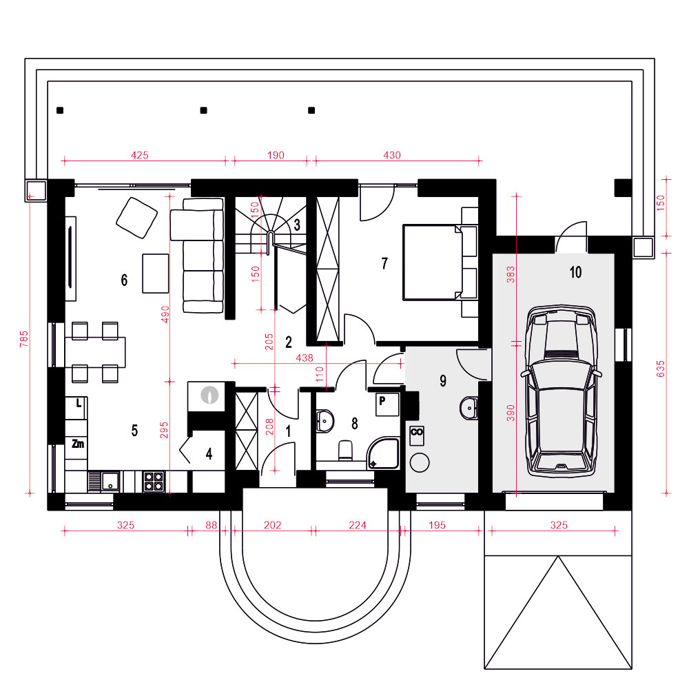 Paprotka z garażem to projekt oszczędnego domu z dwuspadowym dachem, idealnego dla czteroosobowej rodziny. Główne wejście prowadzi do wiatrołapu z praktycznymi szafami, a stamtąd do holu ze schodami, który dzieli przestrzeń na sypialnię i część dzienną. Obok schodów znajduje się funkcjonalna sypialnia dwuosobowa, a naprzeciwko - niewielka łazienka z prysznicem i pralką. Dalej korytarzem mamy dostęp do pomieszczenia technicznego i garażu. Strefa dzienna obejmuje salon z kuchnią i jadalnią. Przy kuchni zlokalizowano użyteczną spiżarnię oraz kominek, a salon łączy się z ogrodem poprzez zadaszony taras. W centralnej części tej strefy znajduje się miejsce na jadalnię. Wygodne schody prowadzą na poddasze, gdzie umieszczono dwie duże sypialnie z garderobami oraz wspólną łazienkę. Z jednej z sypialń mozna dostać się na strych nad garażem. Pod schodami przewidziano praktyczną garderobę. Ten projekt reprezentuje propozycję ekonomicznego i ekologicznego domu, doskonale nadającego się do zamieszkania przez cały rok, ze względu na uniwersalną architekturę.