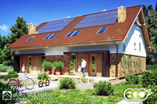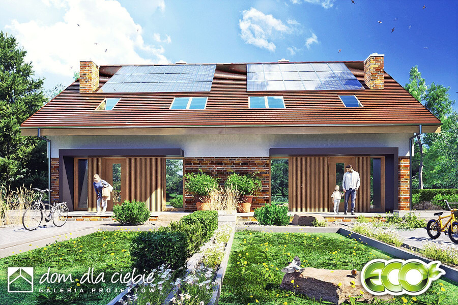 (Uwaga: projekty typu bliźniak oferujemy jako domy dwulokalowe, projekt można zamówić również w zabudowie bliźniaczej) Poniższy opis odnosi się do jednego segmentu: Projekt Aria II to klasyczny dom jednorodzinny z użytkowym poddaszem, idealny dla wąskich działek oraz zabudowy bliźniaczej lub szeregowej. Z przodu znajduje się wejście do budynku. Wewnątrz domu zaplanowano funkcjonalną strefę wspólną i pomocniczą. Salon z kominkiem, jadalnią i kuchnią otwiera się na taras. W strefie komunikacyjnej znajduje się praktyczna szafa wnękowa (wiatrołap), schowek pod schodami, wc, pomieszczenie techniczne oraz schody na poddasze. Na piętrze znajdują się trzy sypialnie i przestronna łazienka. Dom Aria charakteryzuje się proporcjonalnym, symetrycznym kształtem oraz klasyczną architekturą, co sprawia, że doskonale wkomponuje się w różne środowiska urbanistyczne. Jego oszczędna forma i niewielka powierzchnia użytkowa czynią go również ekonomicznym w eksploatacji i realizacji. Zewnętrzna elewacja wyróżnia się delikatnymi detalami i naturalną kolorystyką.