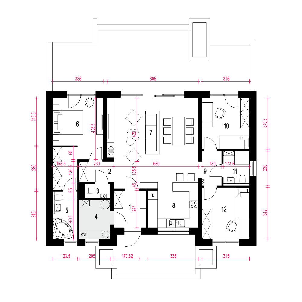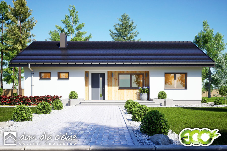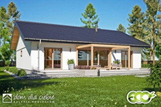 Projekt domu Bratek IV to kolejny projekt z serii projektów o tej nazwie. To projekt domu parterowego o prostej formie i konstrukcji. Bratek IV to dom ekonomiczny w budowie i utrzymaniu, o tradycyjnej konstrukcji murowanej, przekryty dwuspadowym dachem z wiązarów prefabrykowanych. Na funkcję domu składa się w części ogólnodostępnej: wiatrołap, centralnie umieszczony przestronny salon z jadalnią, kuchnia oraz wydzielona toaleta. Część prywatna zlokalizowana po lewej stronie, przeznaczona jest dla rodziców i mamy tu przewidzianą wygodną sypialnię z garderobą i osobna łazienką. Po prawej stronie przewidziano dwie sypialnie i wygodną łazienkę. Konstrukcja dachu z prefabrykowanych wiązarów umożliwia wykorzystanie strychu jako przestrzeń magazynową. Projekt domu Bratek IV to ekonomiczna propozycja domu energooszczędnego o powierzchni około 100 m2, idealna na pierwszy dom dla rodziny 3-4ro osobowej.fundamenty: BETONOWE ściany zewnętrzne:: POROTHERM+STYROPIAN ściany wewnętrzne:: POROTHERM rodzaj stropu i konstrukcja dachu:: wiązary prefabrykowane MITEK elewacje: TYNK STRUKTURALNY, OKŁADZINA DREWNIANA pokrycie dachu: DACHÓWKA CEMENTOWA LUB CERAMICZNA