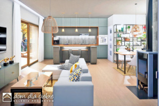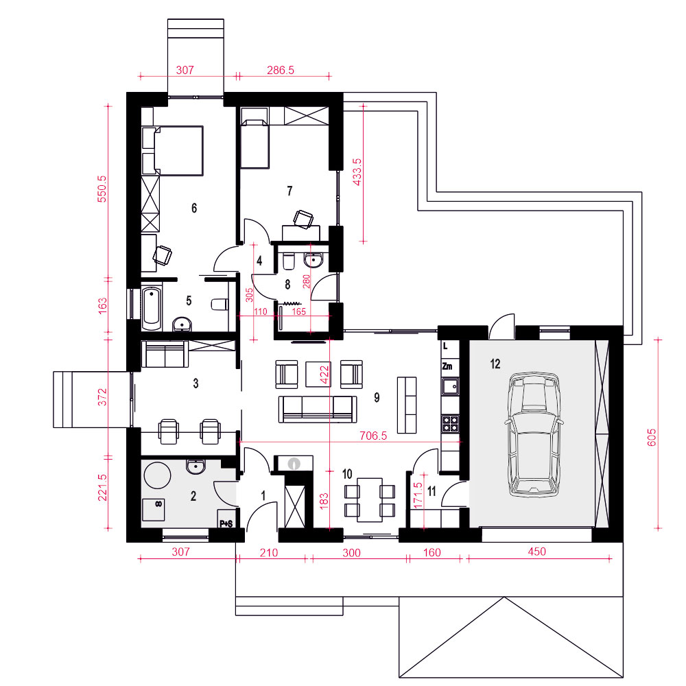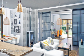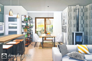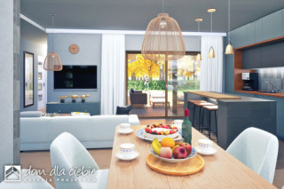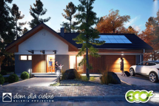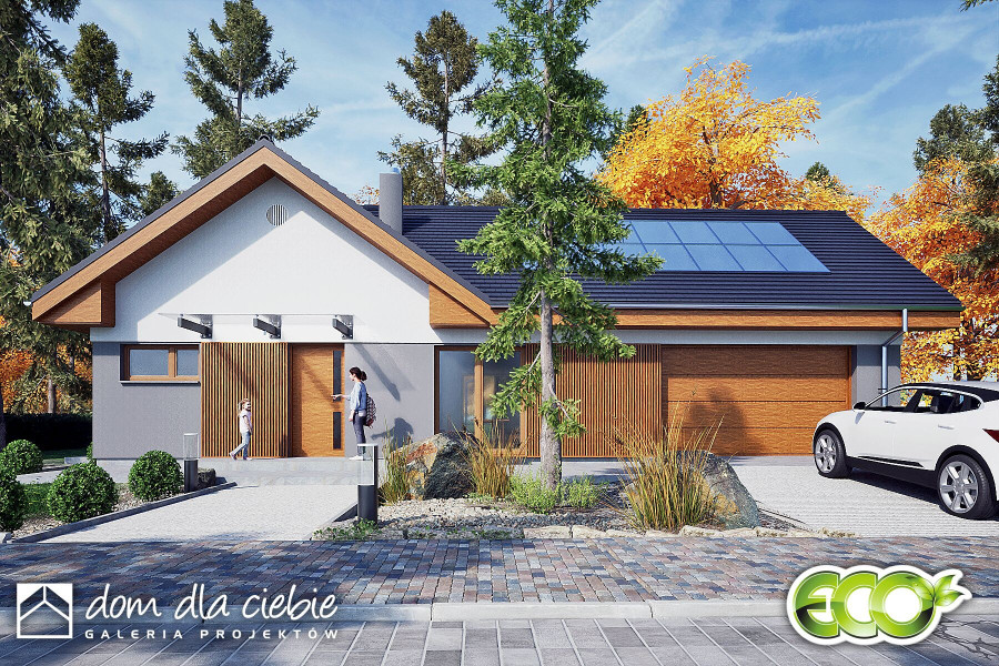 Malodia to nowoczesny dom dla 3-4 osobowej rodziny z konstrukcją murowaną z pustaków ceramicznych i prefabrykowanymi wiązarami dachowymi. Bryła budynku ma kształt litery L, otaczając wewnętrzny ogrodowy dziedziniec. Wejście od frontu prowadzi przez wiatrołap z przestronną szafą wnękową i do pomieszczenia technicznego. Część wspólna obejmuje salon, otwartą kuchnię i jadalnię, a także gabinet z przesuwnymi drzwiami, który po rozsunięciu zwiększa przestrzeń salonu. Korytarz prowadzi do sypialni i wspólnej łazienki z natryskiem, a duża sypialnia ma własną łazienkę z wanną. Za kuchnią znajduje się przejściowa spiżarnia prowadząca do dużego garażu. Z salonu, jadalni, gabinetu i sypialni można bezpośrednio wyjść na tarasy, łącząc wnętrze z otoczeniem. W wspólnej łazience z drzwiami tarasowymi można korzystać w letnie dni, zwłaszcza z basenu zewnętrznego w ogrodzie. Elewacja budynku łączy drewno z eleganckimi detalami w bieli i szarości, a ciemnoszary dach nadaje mu wyrazistego charakteru. Ogród wokół domu dodaje wyjątkowego uroku.fundamenty: BETONOWE ściany zewnętrzne: POROTHERM+STYROPIAN TERMO ORGANIKA ściany wewnętrzne: POROTHERM rodzaj stropu: DREWNIANY, MITEK elewacje: TYNK STRUKTURALNY, OKŁADZINA DREWNOPODOBNA pokrycie dachu: DACHÓWKA CERAMICZNA