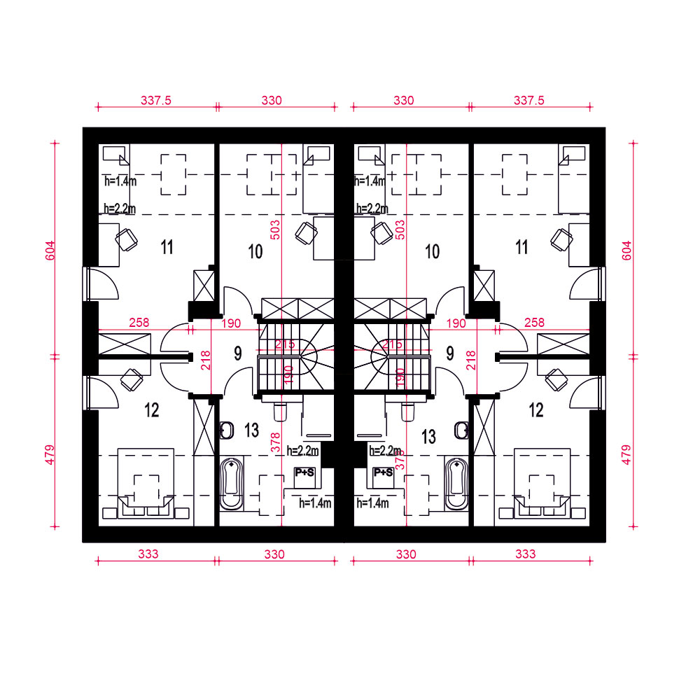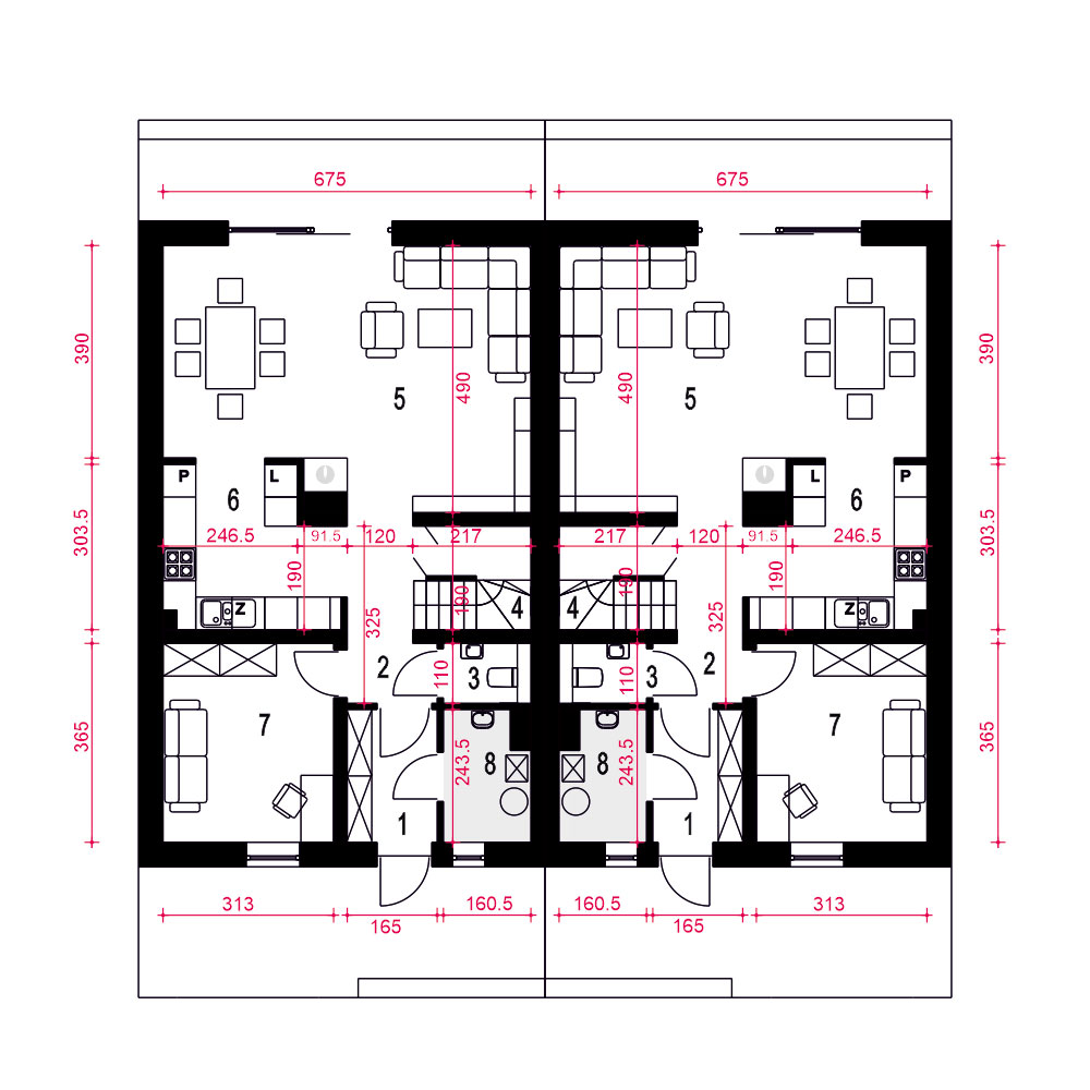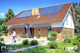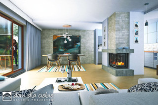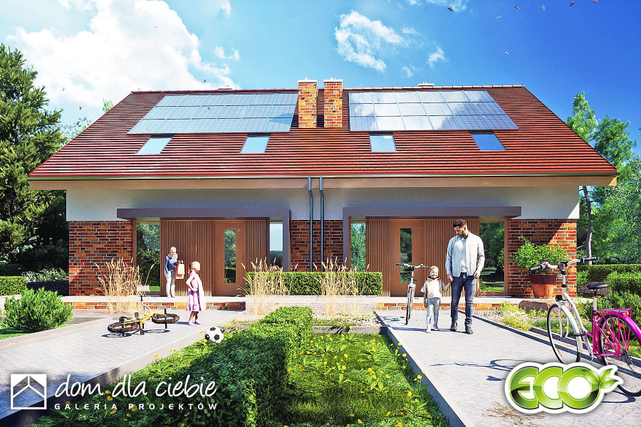 (Uwaga: projekty typu bliźniak oferujemy jako domy dwulokalowe, projekt można zamówić również w zabudowie bliźniaczej) Poniższy opis odnosi się do jednego segmentu: Projekt Aria II to klasyczny dom jednorodzinny z użytkowym poddaszem, idealny dla wąskich działek oraz zabudowy bliźniaczej lub szeregowej. Z przodu znajduje się wejście do budynku. Wewnątrz domu zaplanowano funkcjonalną strefę wspólną i pomocniczą. Salon z kominkiem, jadalnią i kuchnią otwiera się na taras. W strefie komunikacyjnej znajduje się praktyczna szafa wnękowa (wiatrołap), schowek pod schodami, wc, pomieszczenie techniczne oraz schody na poddasze. Na piętrze znajdują się trzy sypialnie i przestronna łazienka. Dom Aria charakteryzuje się proporcjonalnym, symetrycznym kształtem oraz klasyczną architekturą, co sprawia, że doskonale wkomponuje się w różne środowiska urbanistyczne. Jego oszczędna forma i niewielka powierzchnia użytkowa czynią go również ekonomicznym w eksploatacji i realizacji. Zewnętrzna elewacja wyróżnia się delikatnymi detalami i naturalną kolorystyką.