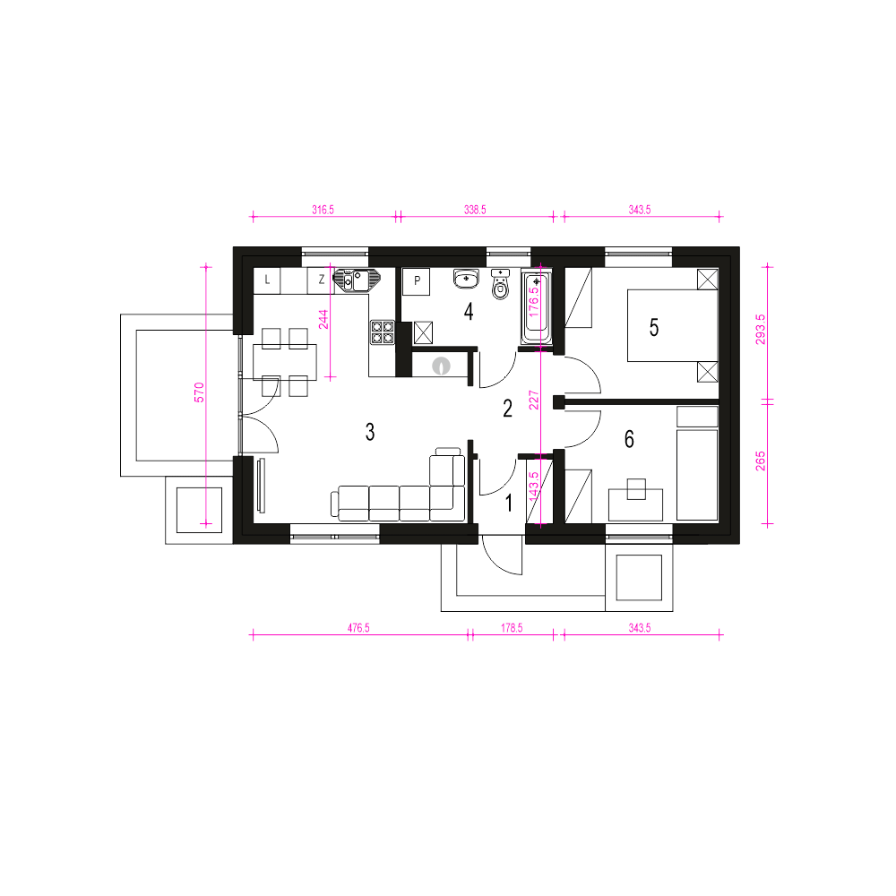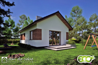 Nika - mały projekt domu dla 3 osób.fundamenty: BETONOWE ściany zewnętrzne: POROTHERM+STYROPIAN TERMO ORGANIKA ściany wewnętrzne: POROTHERM strop nad parterem i konstrukcja dachu: wiązary prefabrykowane MITEK elewacje: TYNK STRUKTURALNY, OKŁADZINY pokrycie dachu: DACHÓWKA CERAMICZNA