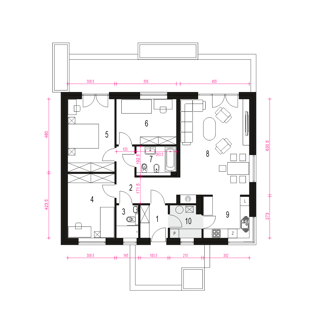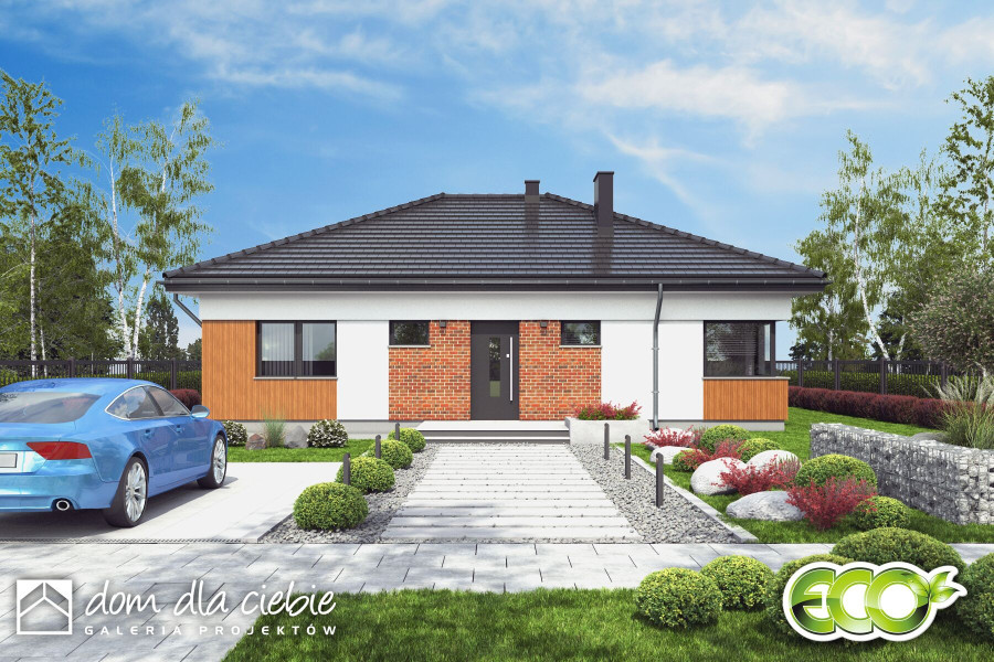 Kalcyt IV - nowoczesny parterowy dom dla 4-osobowej rodzinyfundamenty: BETONOWE ściany zewnętrzne: POROTHERM+STYROPIAN TERMO ORGANIKA ściany wewnętrzne: POROTHERM rodzaj stropu i konstrukcja dachu: wiązary prefabrykowane MITEK elewacje: TYNK STRUKTURALNY, CEGŁA KLINKIEROWA pokrycie dachu: DACHÓWKA CERAMICZNA
