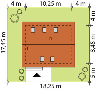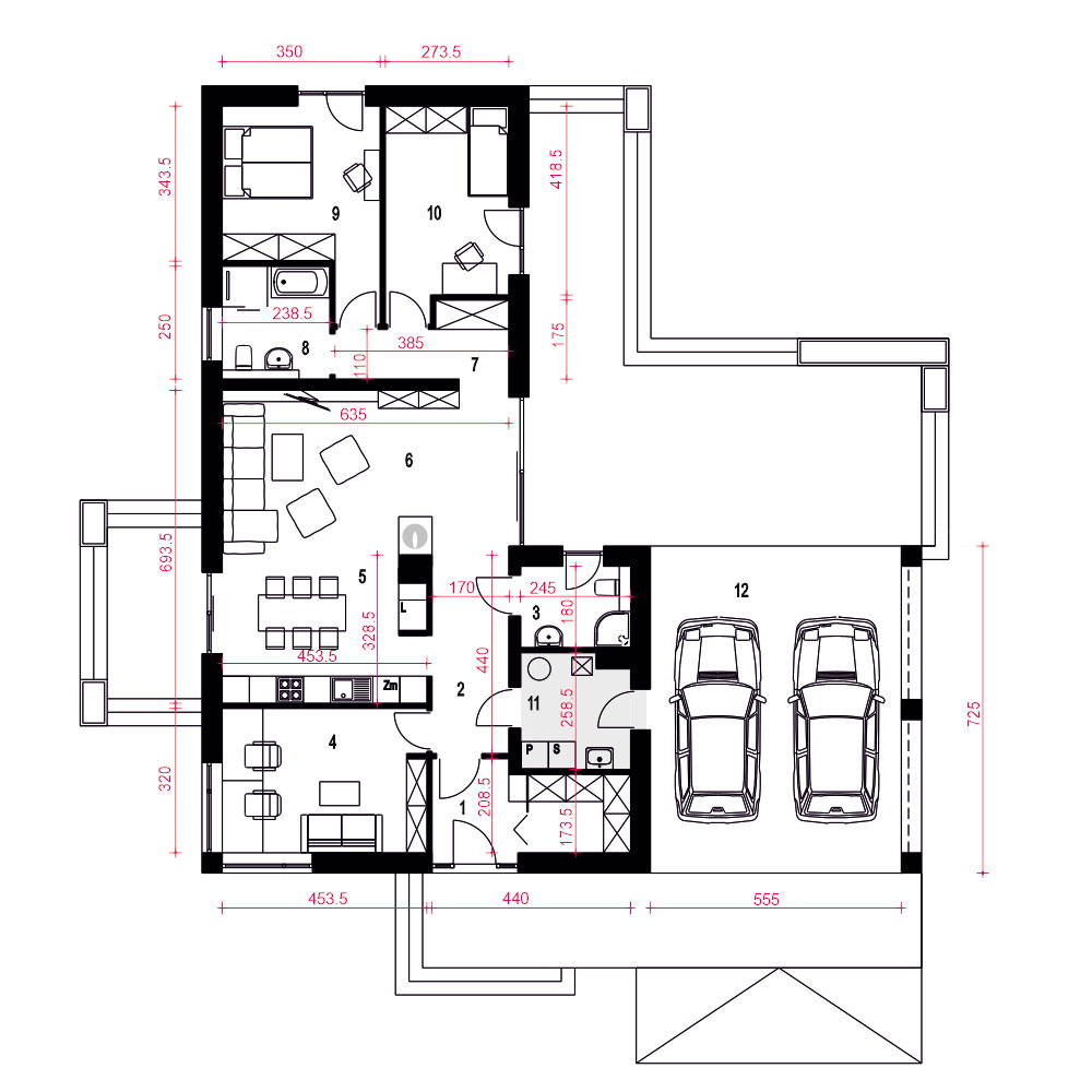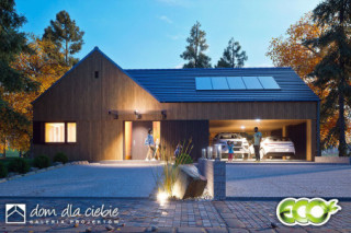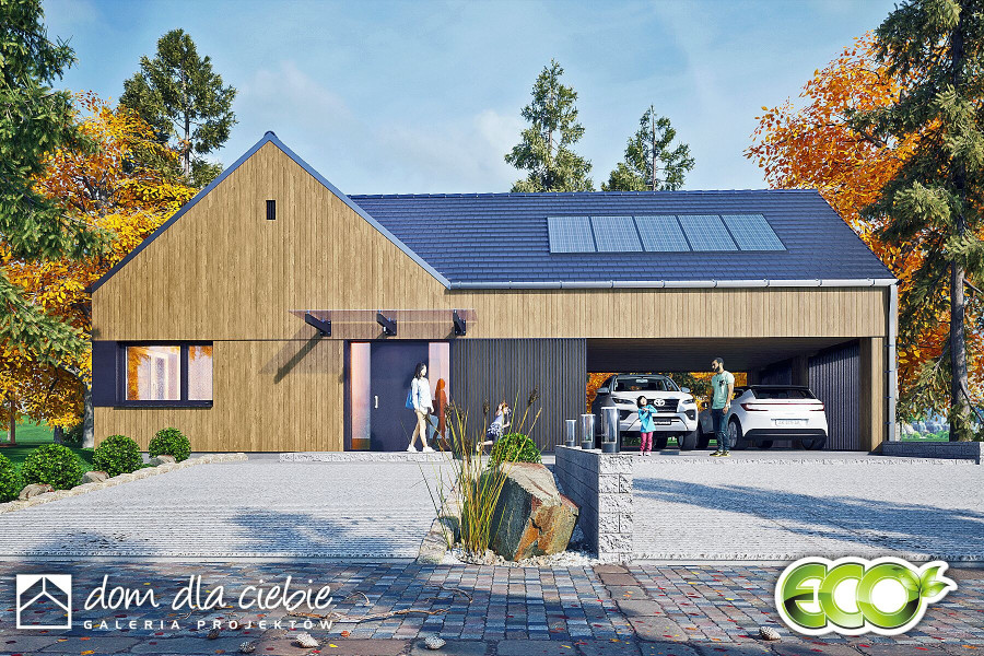 Słoneczna to nowoczesny dom dla 3-4 osobowej rodziny, z tradycyjnymi murowanymi ścianami i prefabrykowanymi, drewnianymi wiązarami dachowymi. Bryła budynku tworzy literę L. Wejście od frontu prowadzi do wiatrołapu z garderobą, a następnie do holu. Pokój-gabinet, mała łazienka, pomieszczenie techniczne i kuchnia z jadalnią i salonem są dostępne z holu. Część prywatna obejmuje dwie sypialnie i dużą łazienkę. Strefa dziennej przestrzeni jest otwarta po dach, a z jadalni i salonu można bezpośrednio wyjść na tarasy, łącząc wnętrze z otoczeniem. Pomieszczenie techniczne prowadzi pod wiatę, a mała łazienka z drzwiami tarasowymi umożliwia korzystanie z niej w letnie dni. Elewacja w minimalistycznym stylu łączy drewno z antracytowymi wstawkami, a ciemnoszary dach nadaje domowi charakteru. Słoneczna spełnia nowoczesne potrzeby życia, otaczając mieszkańców przytulnym ogrodowym dziedzińcem.