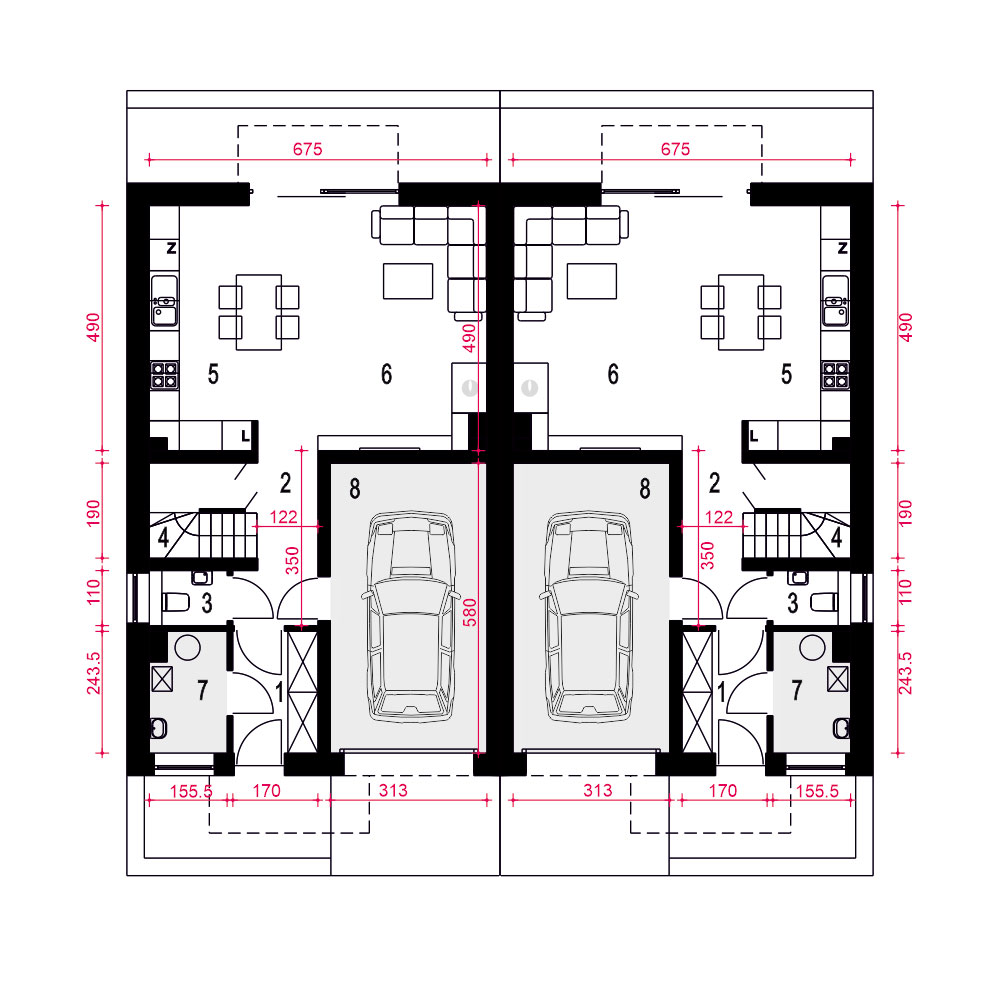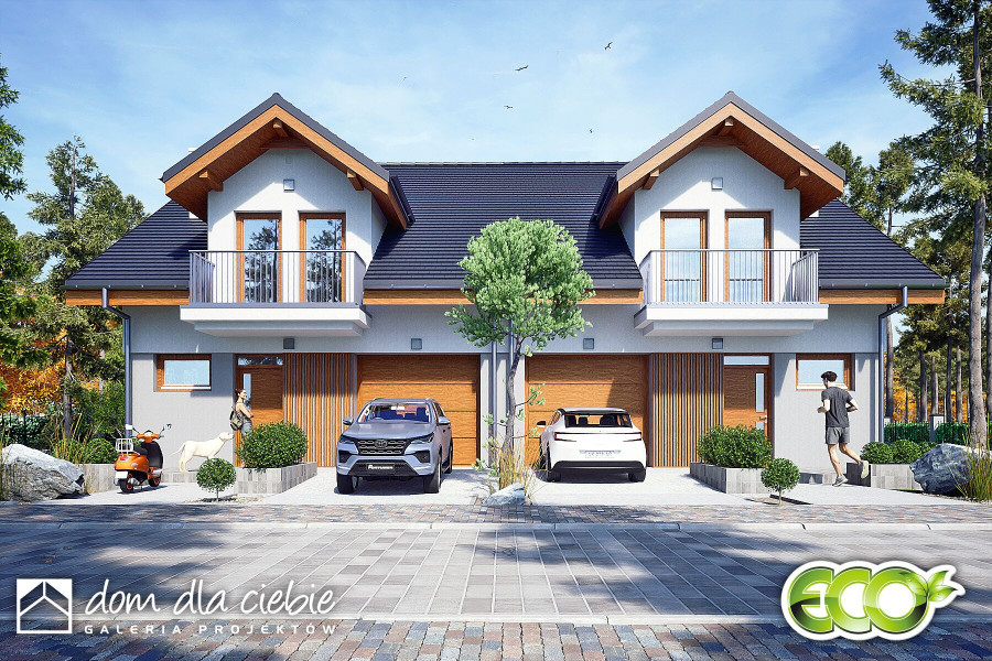 (Uwaga: projekty typu bliźniak oferujemy jako domy dwulokalowe, projekt można zamówić również w zabudowie bliźniaczej) Poniższy opis odnosi sie do jednego segmentu: Dom Aida to tradycyjny, dwukondygnacyjny dom jednorodzinny z użytkowym poddaszem, idealny dla wąskich działek, zabudowy bliźniaczej lub szeregowej. Zaprojektowany na rzucie prostokąta. Salon z jadalnią, kuchnią i kominkiem otwiera się na taras, tworząc przyjemne miejsce spotkań. W strefie komunikacyjnej znajdziemy praktyczną szafę wnękową (wiatrołap), schowek pod schodami, WC, pomieszczenie techniczne, garaż oraz schody na poddasze w centralnej części budynku.Na poddaszu znajdują się trzy sypialnie i obszerna łazienka, z wyjściami na balkony. Dom Aida wyróżnia się proporcjonalnym, symetrycznym kształtem, a pionowe okna balkonowe zapewniają doskonałe naturalne oświetlenie. Polecany dla różnych osiedli dzięki klasycznemu charakterowi architektury, doskonale sprawdzi się w różnych środowiskach miejskich. Dzięki oszczędnej formie i niewielkiej powierzchni użytkowej jest ekonomiczny zarówno w eksploatacji, jak i realizacji. Zewnętrzna elewacja wyróżnia się delikatnym detalem i naturalną kolorystyką, tworząc harmonijny obraz domu Aida.