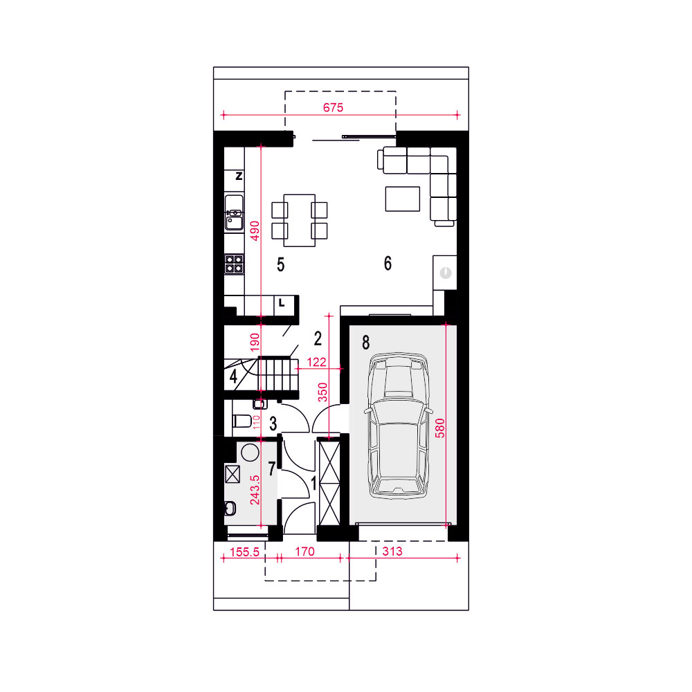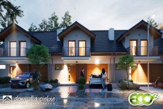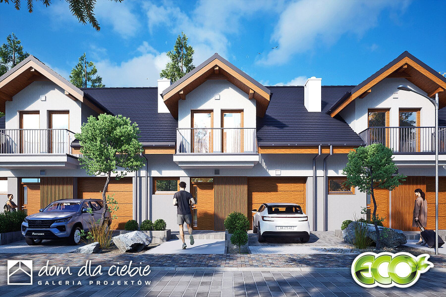 Poniższy opis odnosi się do jednego segmentu: Dom Aida to tradycyjny, dwukondygnacyjny dom jednorodzinny z użytkowym poddaszem, idealny dla wąskich działek, zabudowy bliźniaczej lub szeregowej. Zaprojektowany na rzucie prostokąta. Salon z jadalnią, kuchnią i kominkiem otwiera się na taras, tworząc przyjemne miejsce spotkań. W strefie komunikacyjnej znajdziemy praktyczną szafę wnękową (wiatrołap), schowek pod schodami, WC, pomieszczenie techniczne, garaż oraz schody na poddasze w centralnej części budynku.Na poddaszu znajdują się trzy sypialnie i obszerna łazienka, z wyjściami na balkony. Dom Aida wyróżnia się proporcjonalnym, symetrycznym kształtem, a pionowe okna balkonowe zapewniają doskonałe naturalne oświetlenie. Polecany dla różnych osiedli dzięki klasycznemu charakterowi architektury, doskonale sprawdzi się w różnych środowiskach miejskich. Dzięki oszczędnej formie i niewielkiej powierzchni użytkowej jest ekonomiczny zarówno w eksploatacji, jak i realizacji. Zewnętrzna elewacja wyróżnia się delikatnym detalem i naturalną kolorystyką, tworząc harmonijny obraz domu Aida.